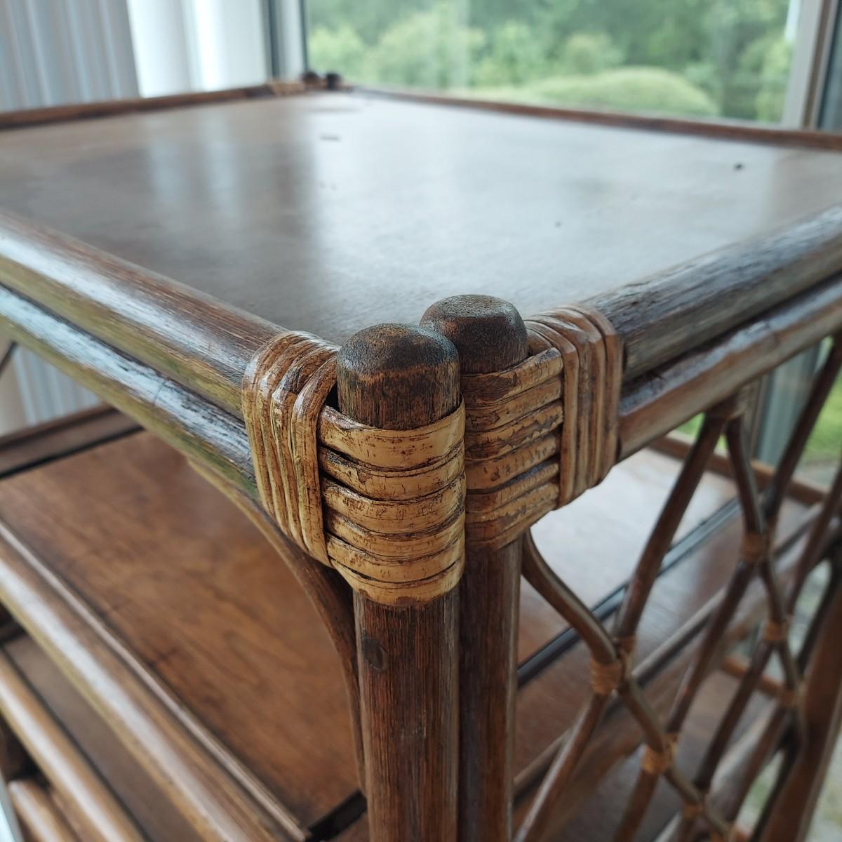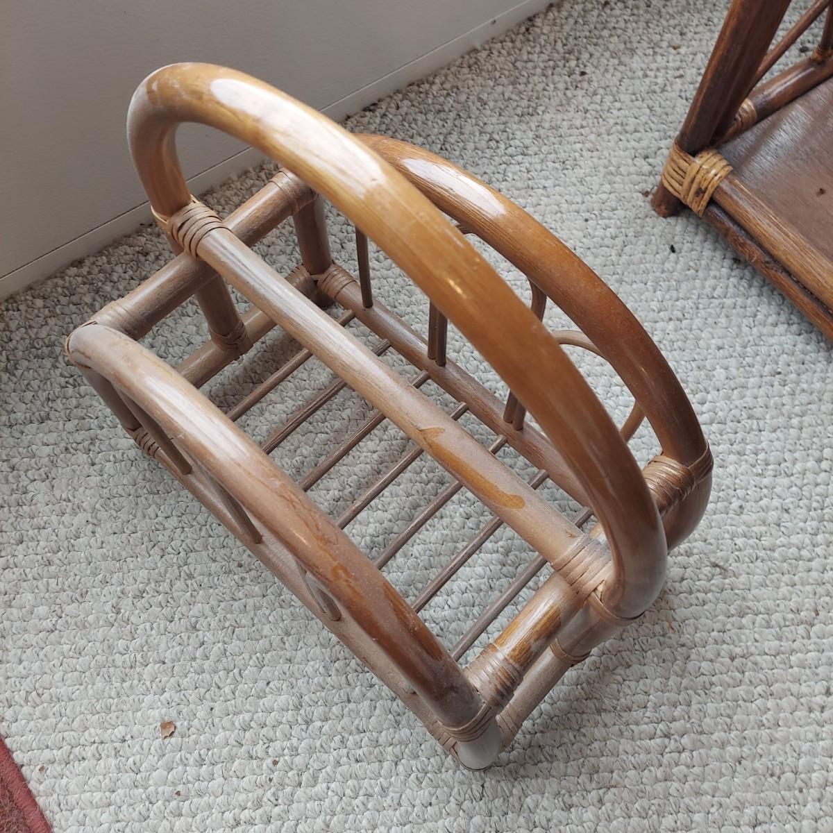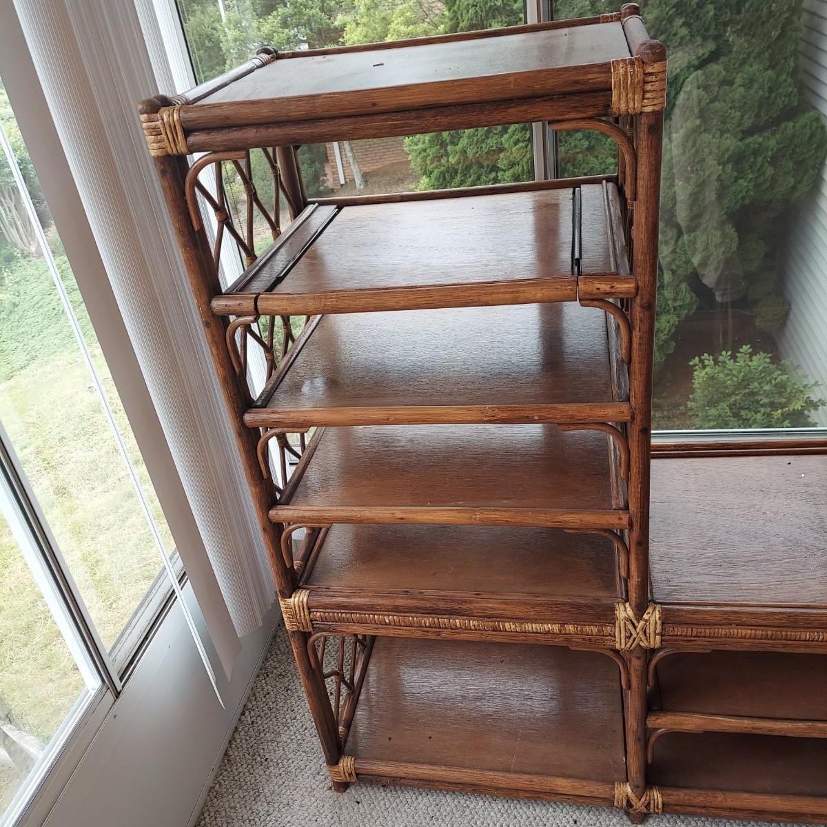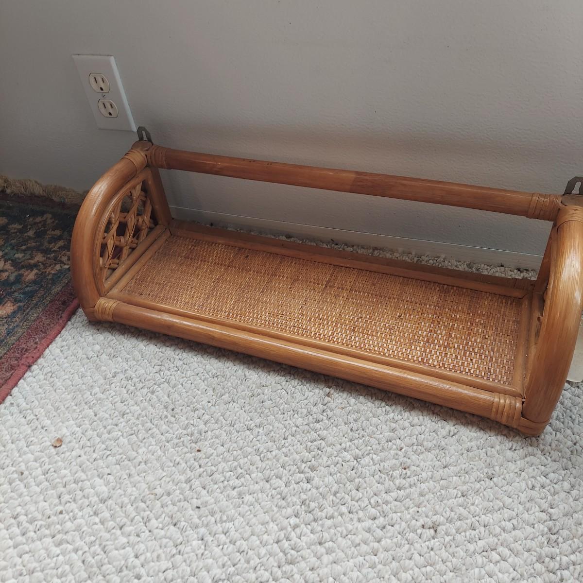 Four pieces of retro bamboo furniture and decor including a two-tier shelving unit, an ottoman with a removable cushion, three wall shelves and and magazine rack. The shelving unit measures 55” x 20” x 54"H. The ottoman is 27” x 24” with an 18"H seat height. The shelves are 18”, 24” & 30” long. Some condition issues. Please see photos for details. Local Pickup Only. Winning bidder must bring assistance to help move and load this item due to its weight and/or size.