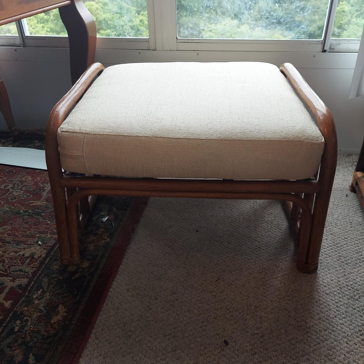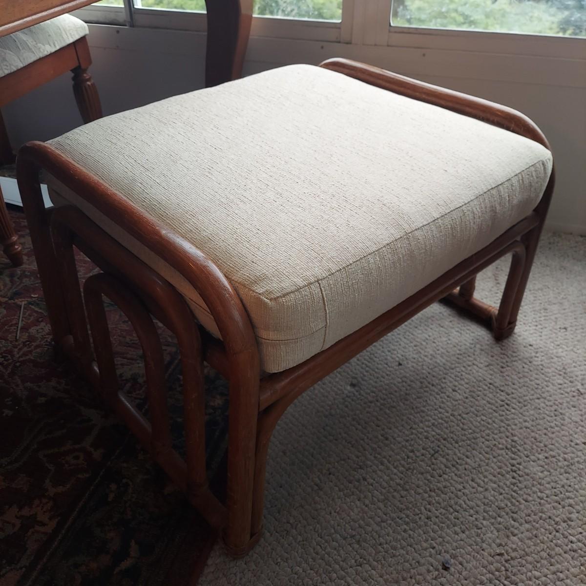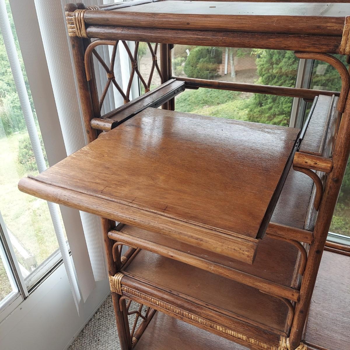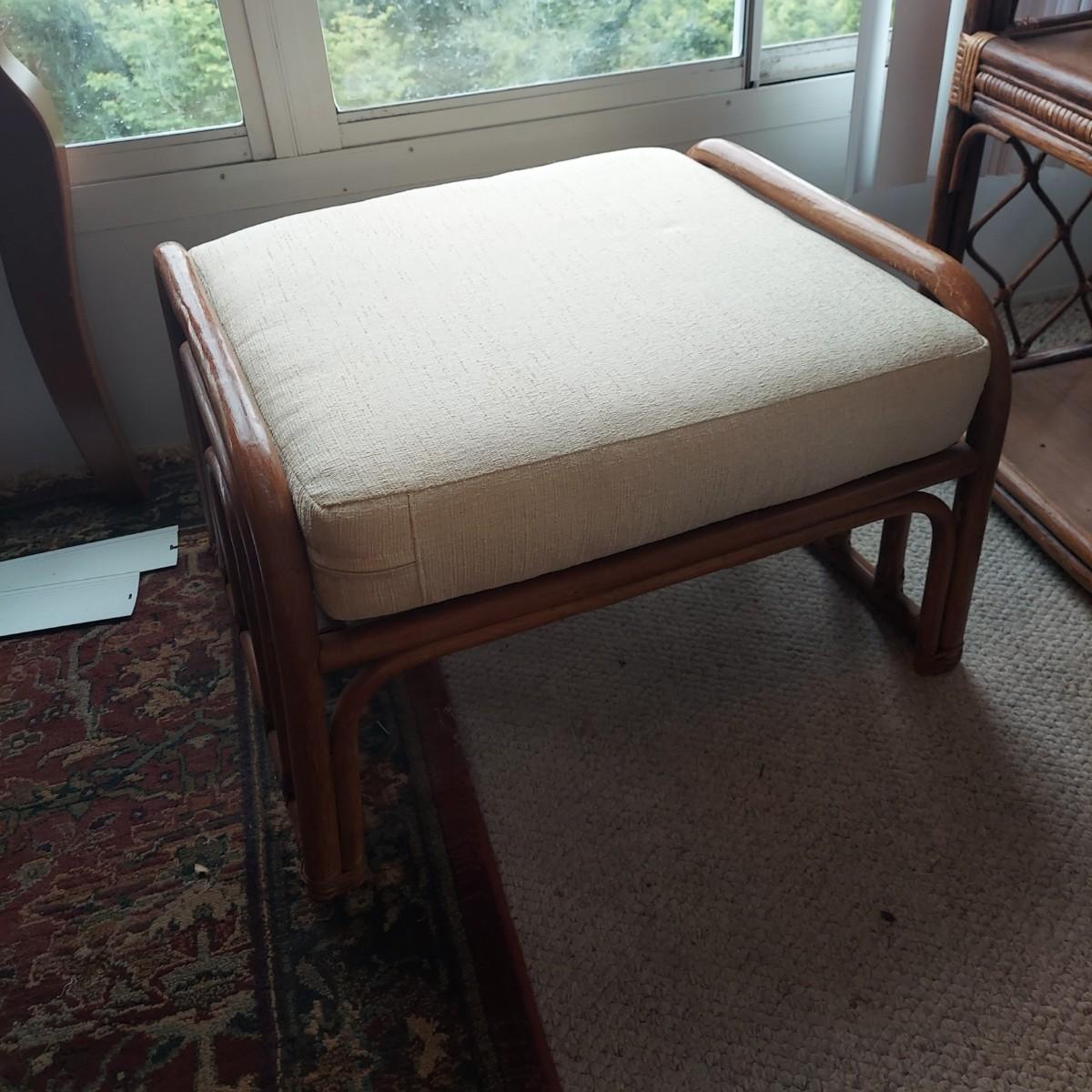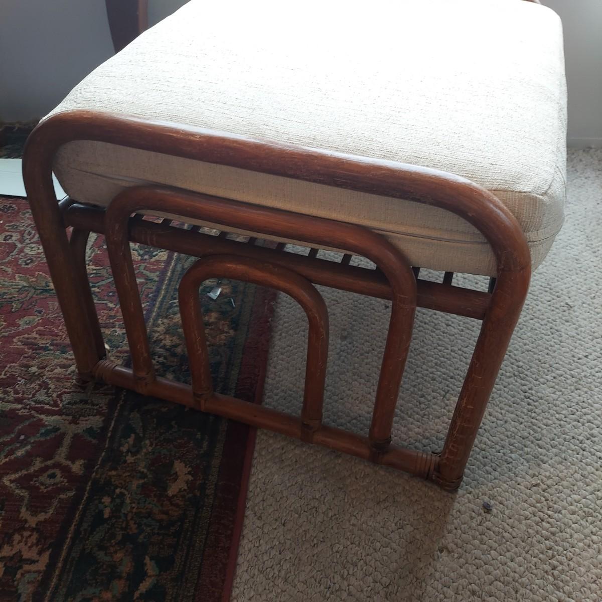 Four pieces of retro bamboo furniture and decor including a two-tier shelving unit, an ottoman with a removable cushion, three wall shelves and and magazine rack. The shelving unit measures 55” x 20” x 54"H. The ottoman is 27” x 24” with an 18"H seat height. The shelves are 18”, 24” & 30” long. Some condition issues. Please see photos for details. Local Pickup Only. Winning bidder must bring assistance to help move and load this item due to its weight and/or size.