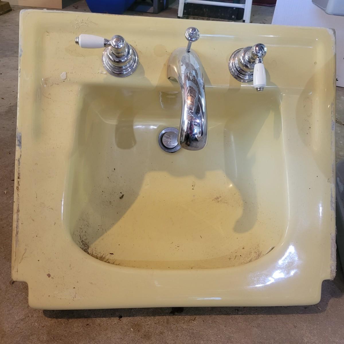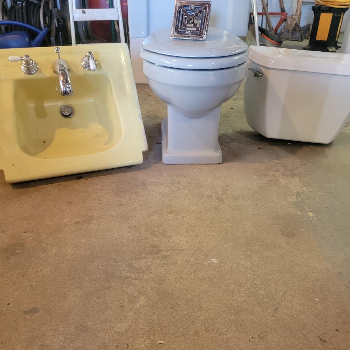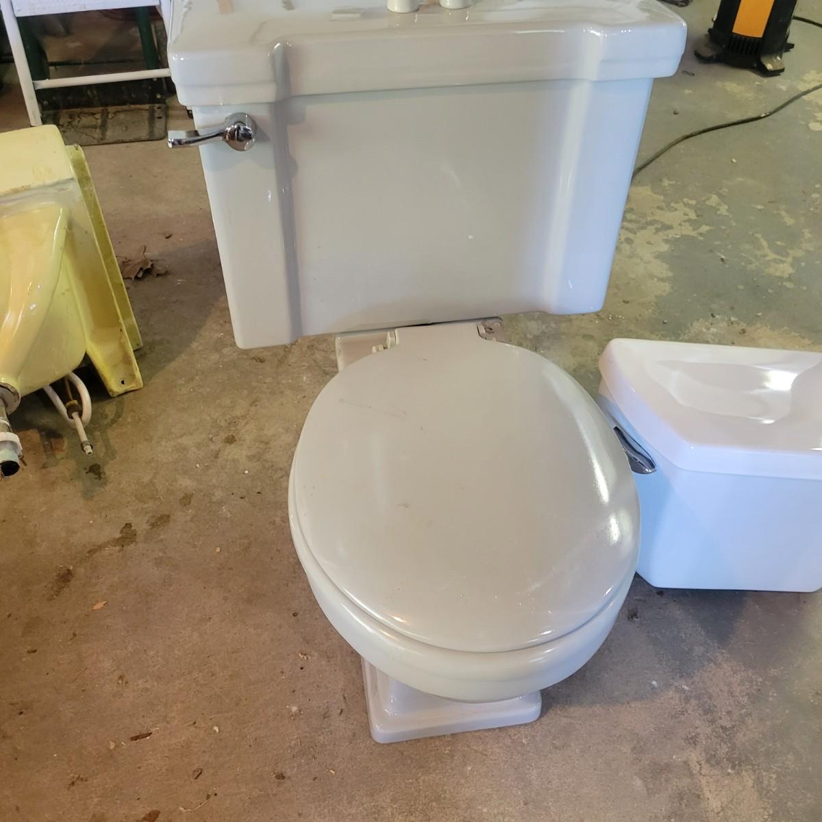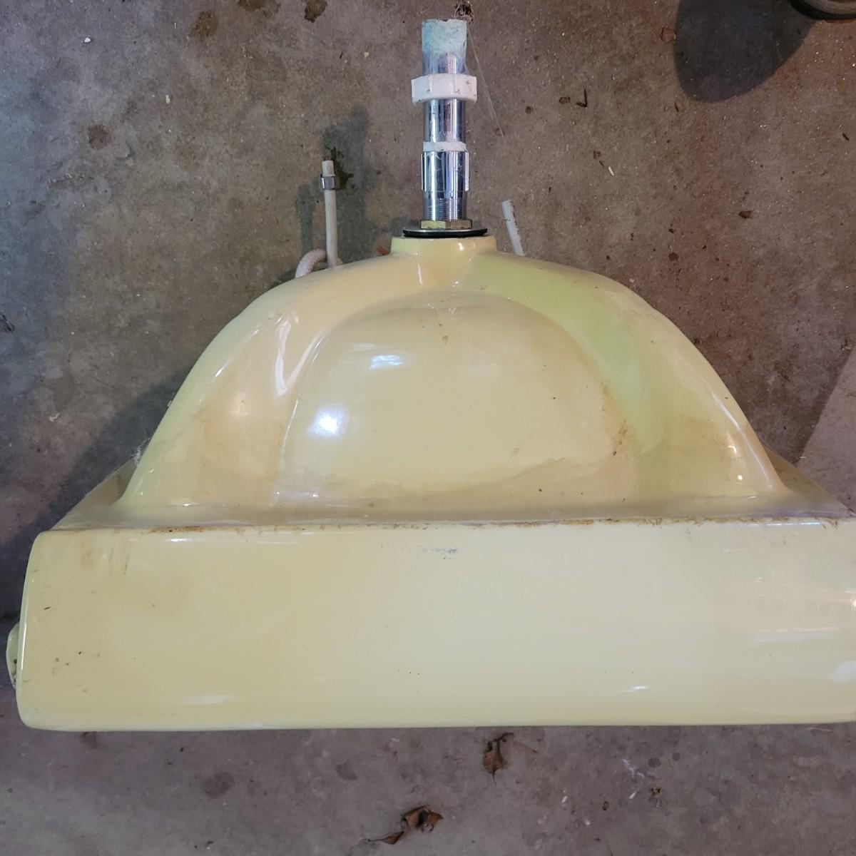 A bathroom sink, toilet and NIB Kohler tank in good condition. Sink is a soft yellow color and was originally under mounted with its finished front exposed. Measures approximately 20" x 18" x 11" not including faucet and drain pipe. The toilet is a soft blue-gray color and is in excellent condition, but does need a new flushing mechanism. Measures approximately 20.5" x 28" x 29.5". Also included is NIB Kohler Wellworth Classic tank in white. Measures approximately 19" x 8" x 13". Local pickup only.