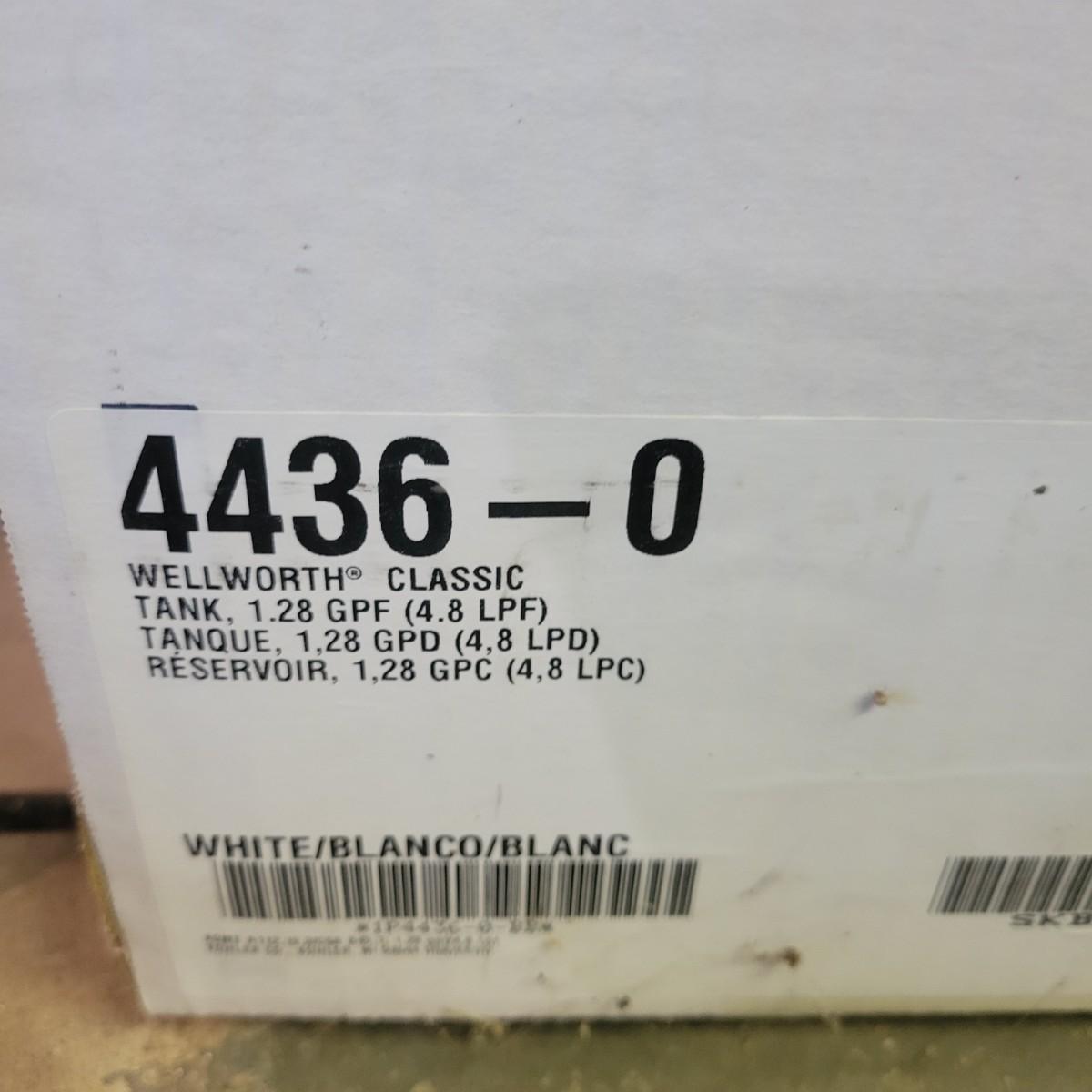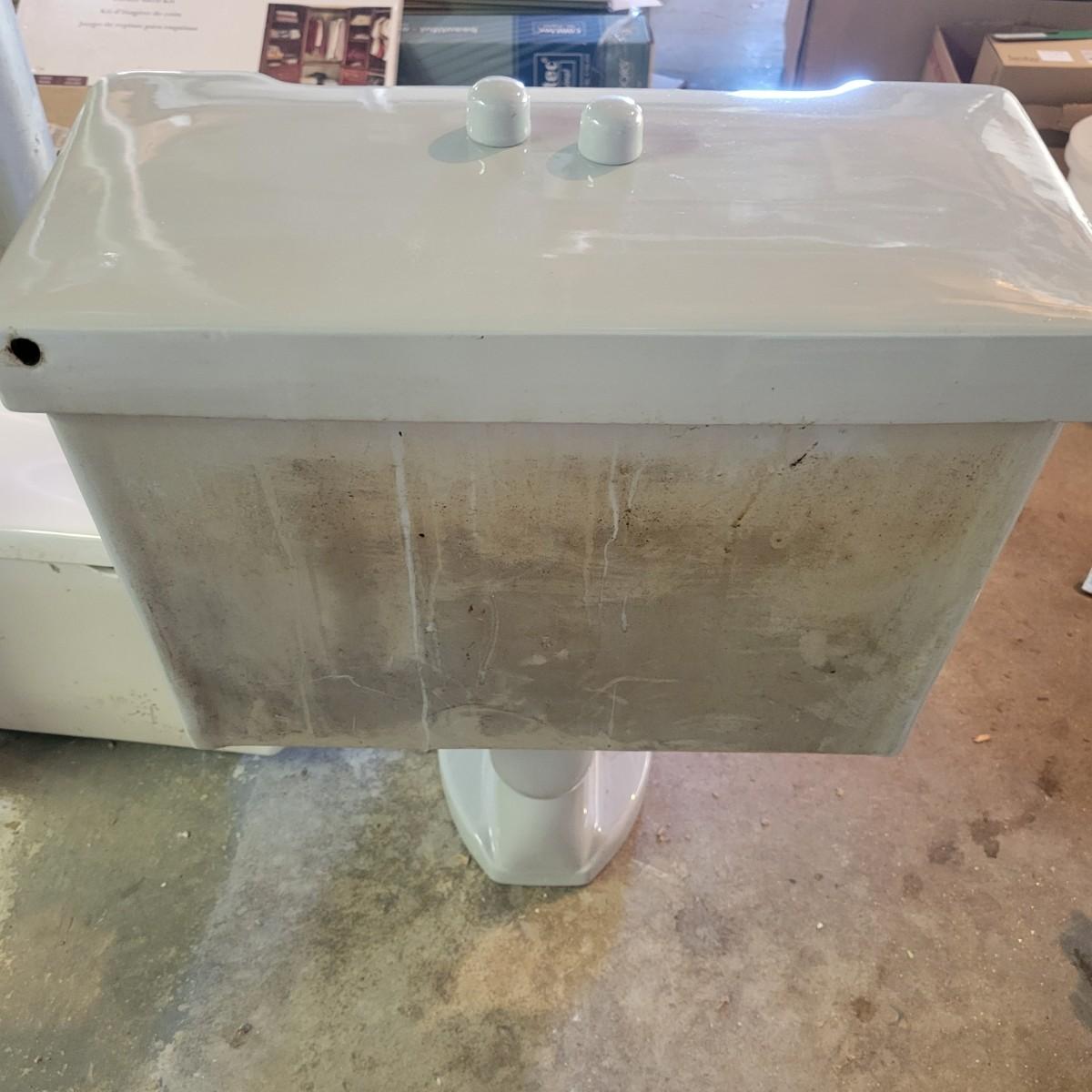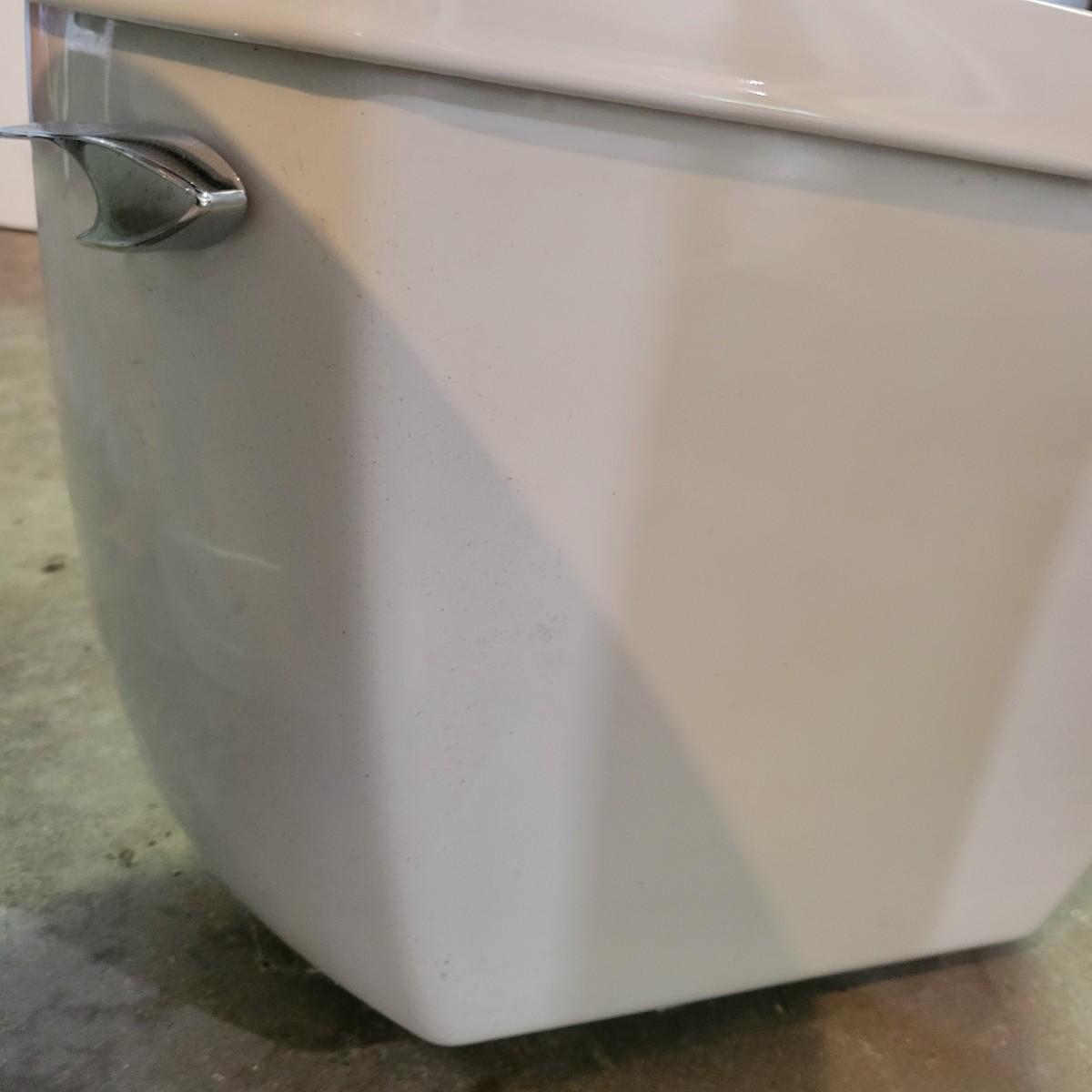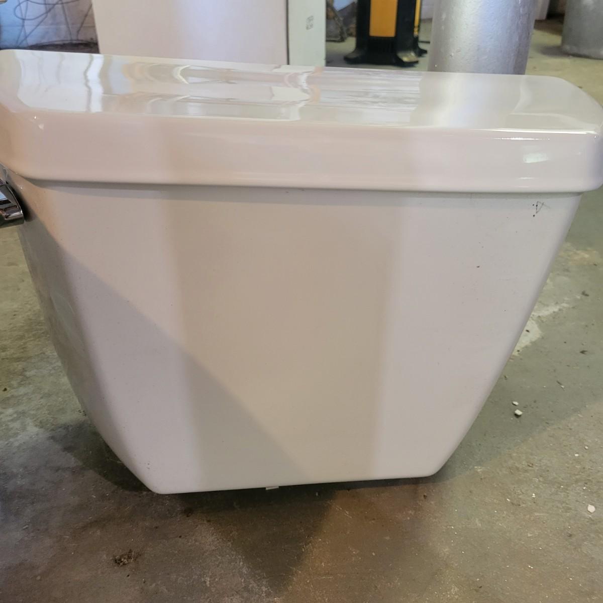 A bathroom sink, toilet and NIB Kohler tank in good condition. Sink is a soft yellow color and was originally under mounted with its finished front exposed. Measures approximately 20" x 18" x 11" not including faucet and drain pipe. The toilet is a soft blue-gray color and is in excellent condition, but does need a new flushing mechanism. Measures approximately 20.5" x 28" x 29.5". Also included is NIB Kohler Wellworth Classic tank in white. Measures approximately 19" x 8" x 13". Local pickup only.
