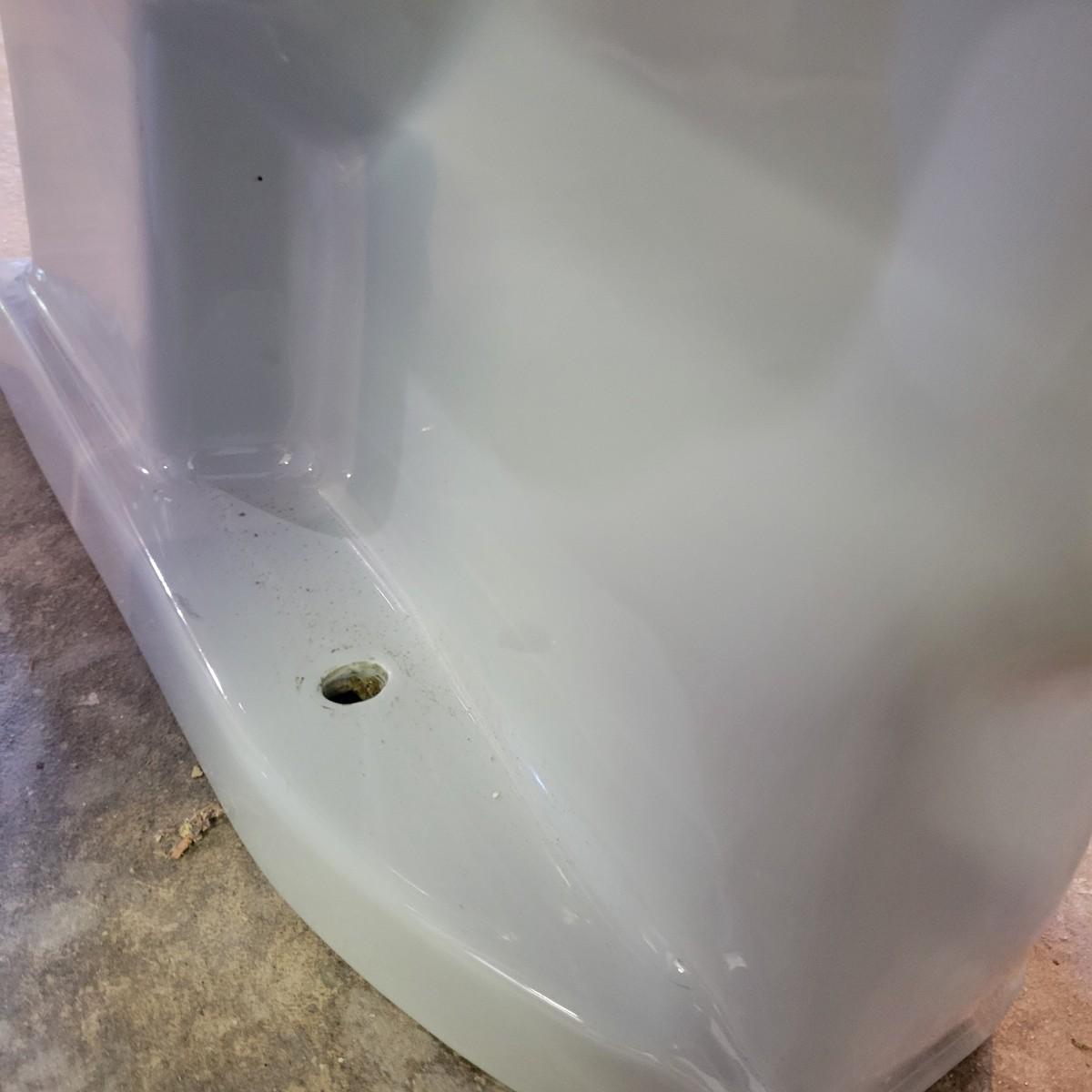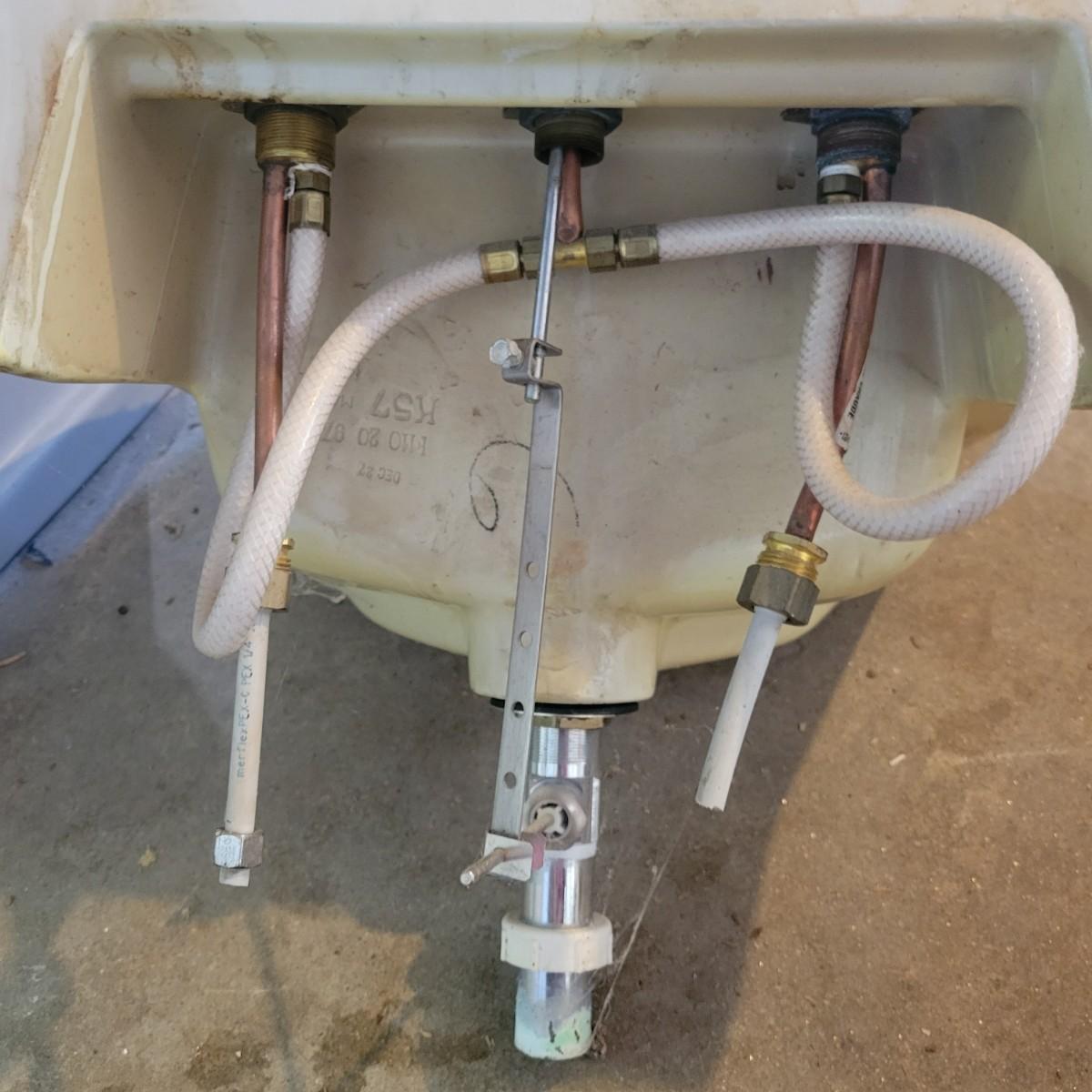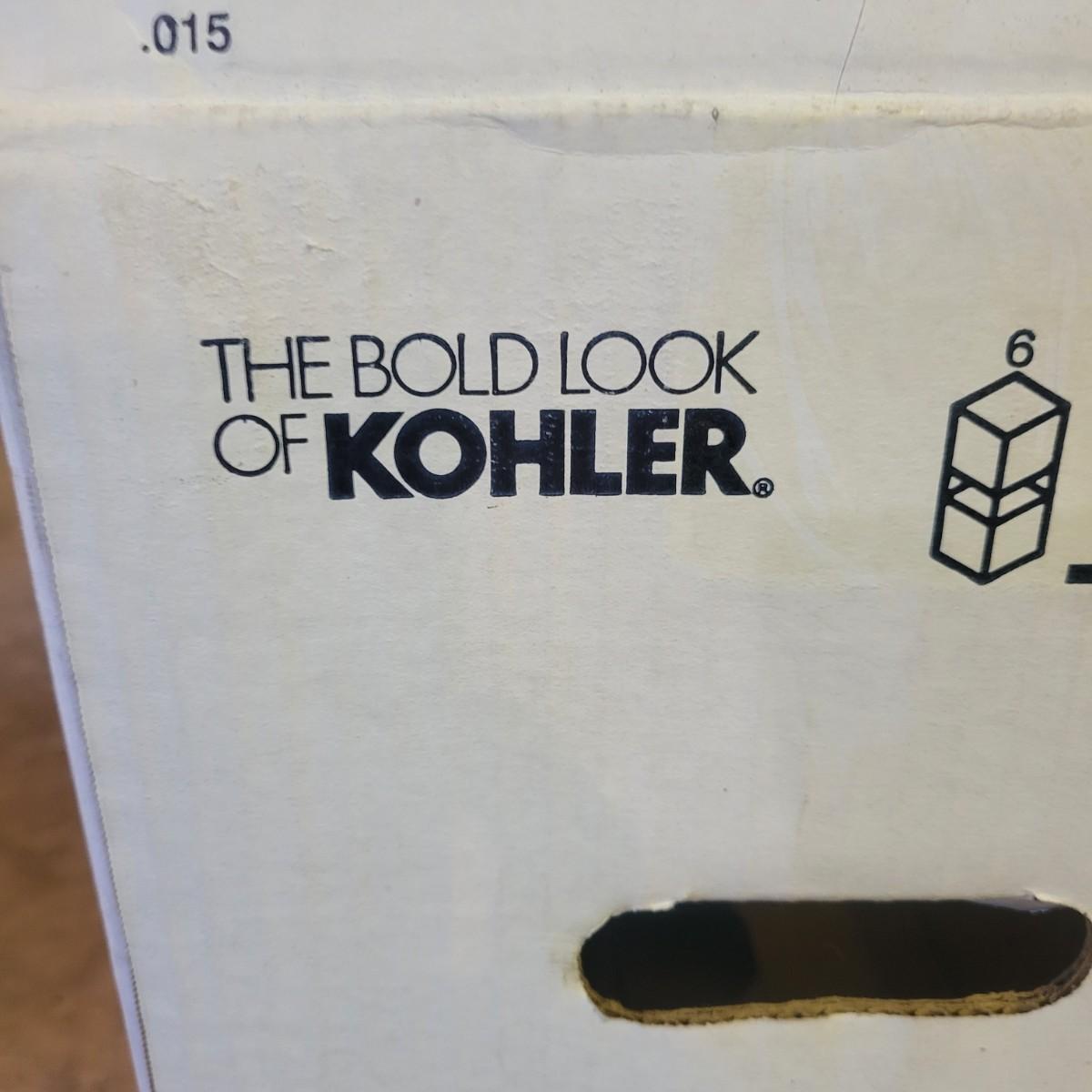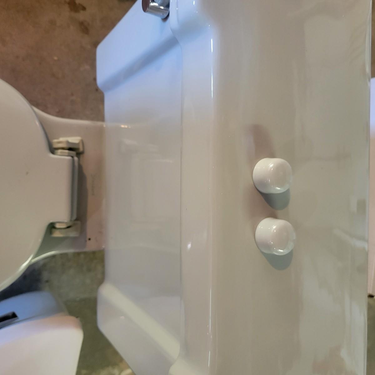 A bathroom sink, toilet and NIB Kohler tank in good condition. Sink is a soft yellow color and was originally under mounted with its finished front exposed. Measures approximately 20" x 18" x 11" not including faucet and drain pipe. The toilet is a soft blue-gray color and is in excellent condition, but does need a new flushing mechanism. Measures approximately 20.5" x 28" x 29.5". Also included is NIB Kohler Wellworth Classic tank in white. Measures approximately 19" x 8" x 13". Local pickup only.