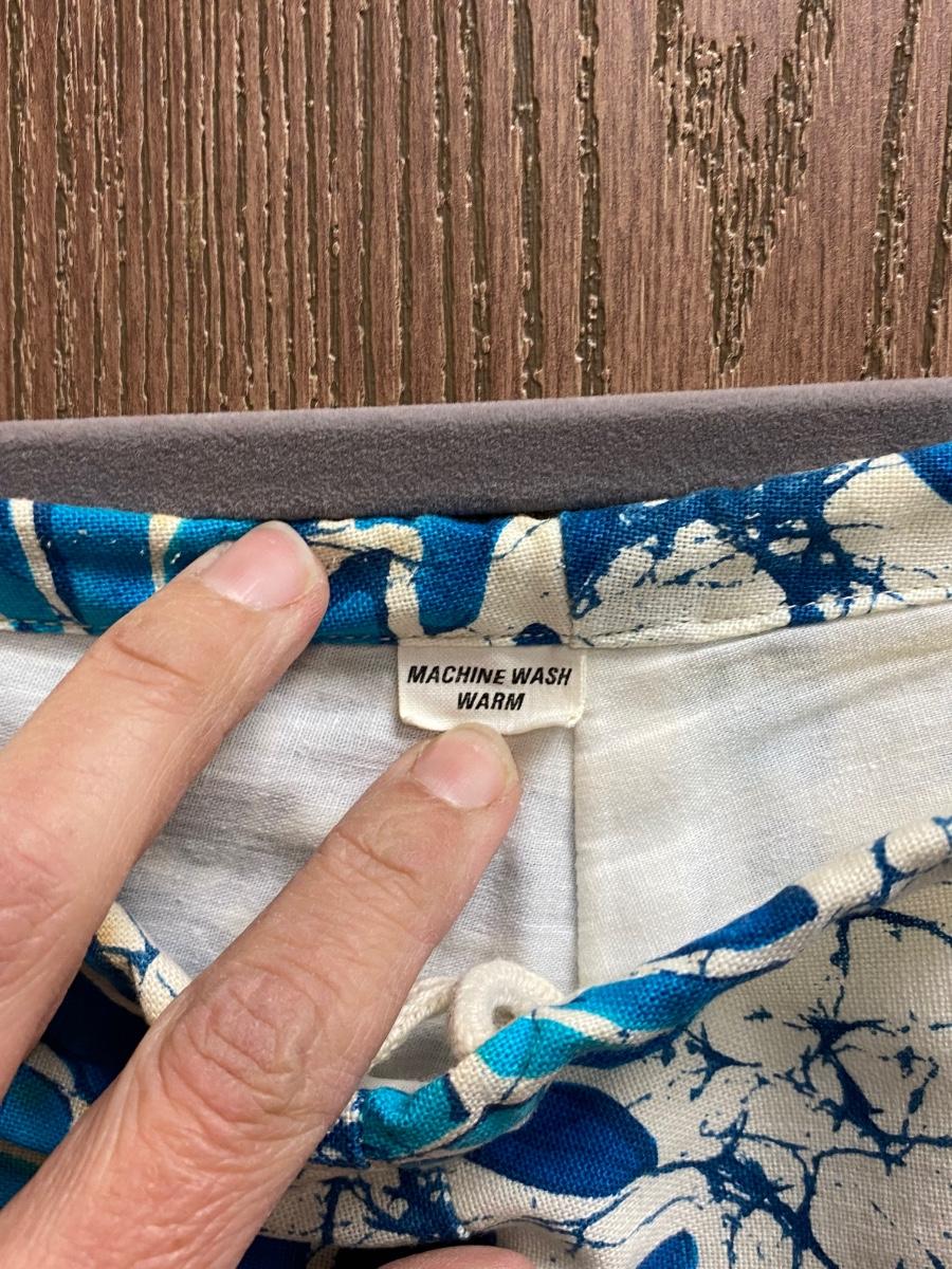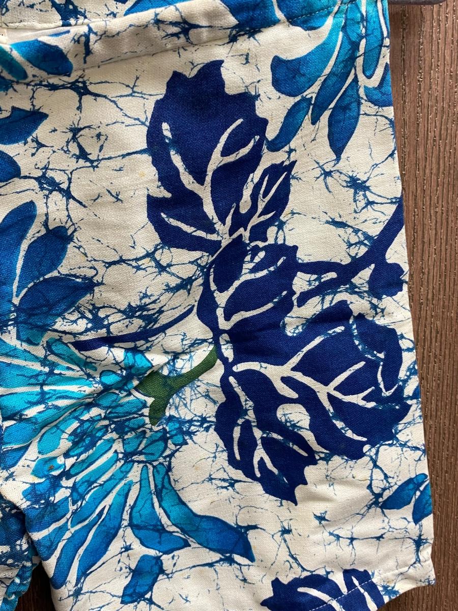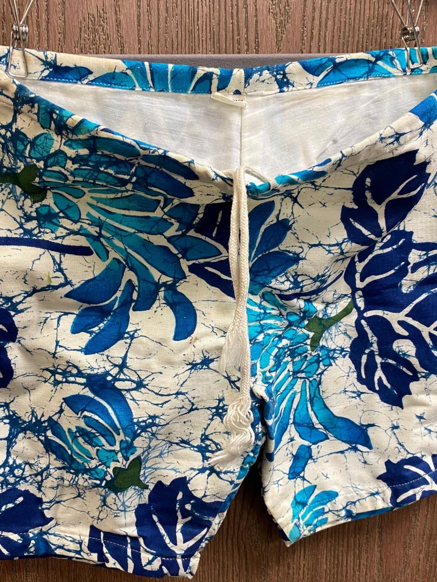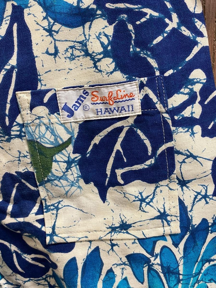 Pair of retro Jams Surfline Hawaii swim trunks. White with a tropical blue pattern. Drawstring waist. No size, but they are small maybe a 28" waist at the most. No holes or spots noticed.