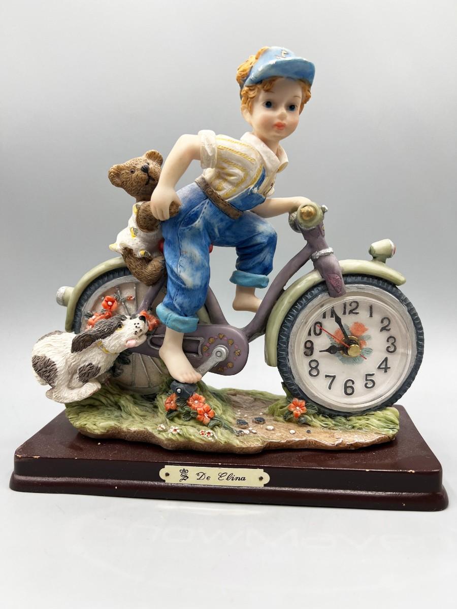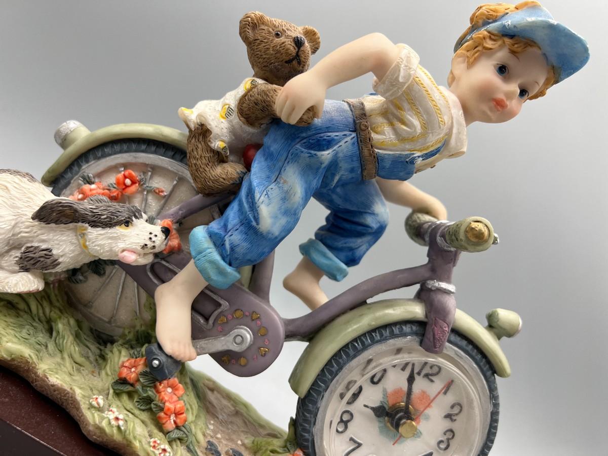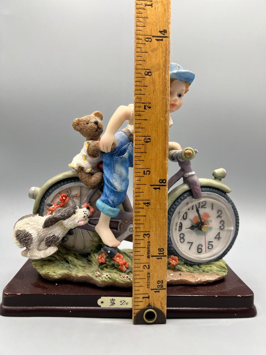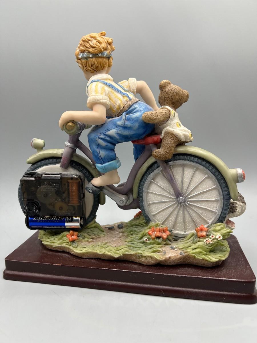 Retro Boy Riding Bicycle with Teddy Bear Ceramic Figurine Battery Operated Mantel Clock
