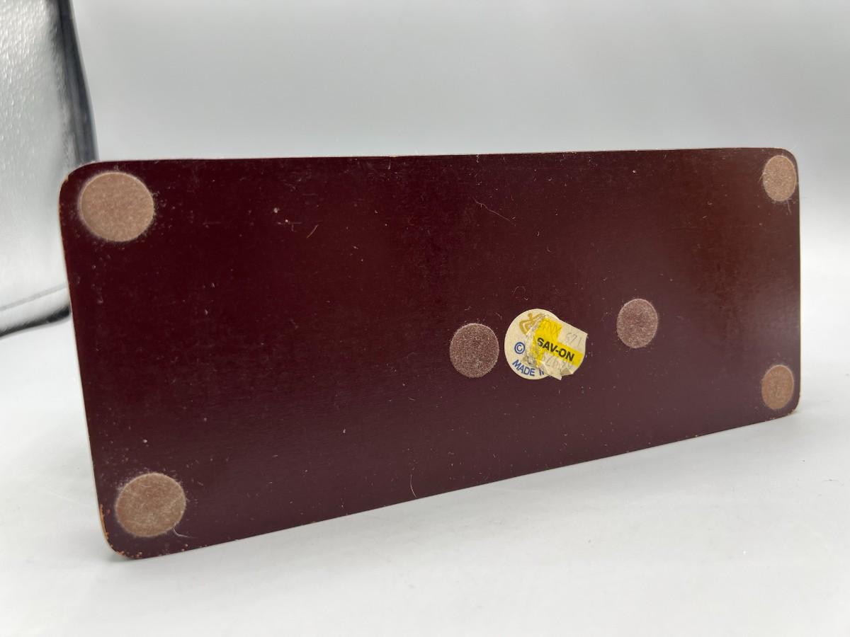 There is some light wear to the wood base, but there is no significant damage and is in overall good displayable condition. Check pictures for more details and for sizing, the clock has been tested with a new battery and works perfectly.
