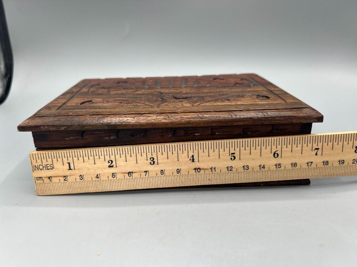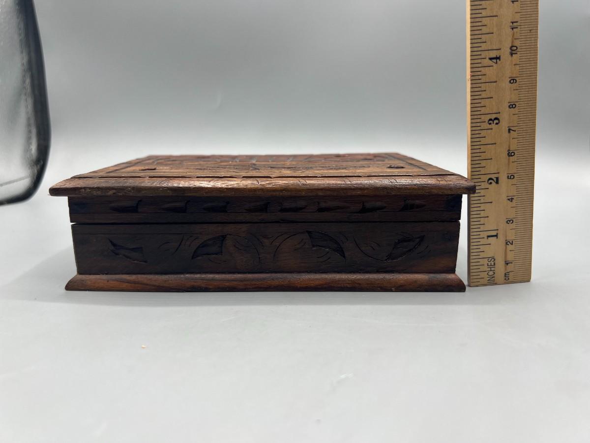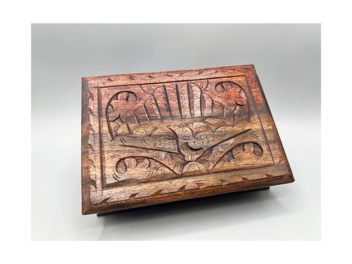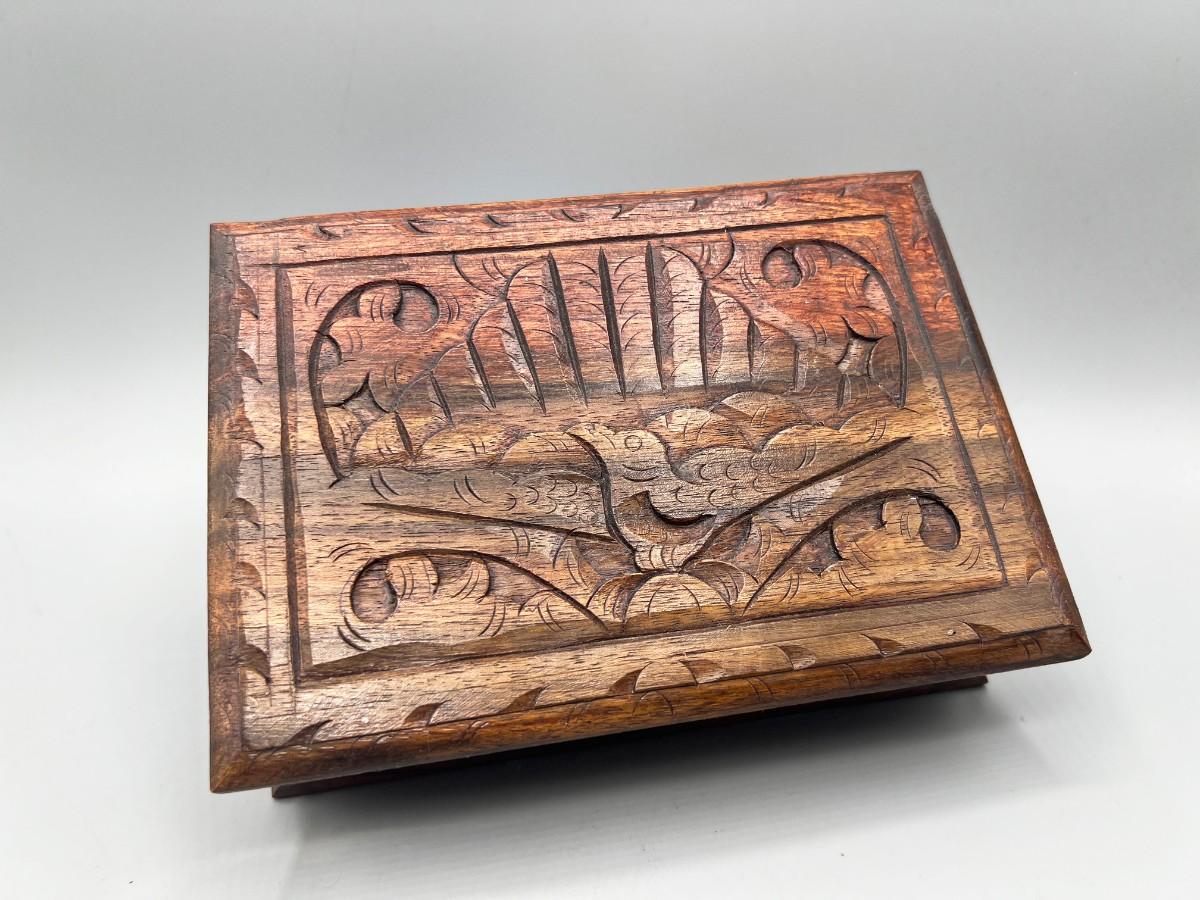 Retro Carved Wood Bird Pattern Jewelry Trinket Box, there is no significant damage to the wooden box and is in good useable condition. Check pictures for more details and for sizing.