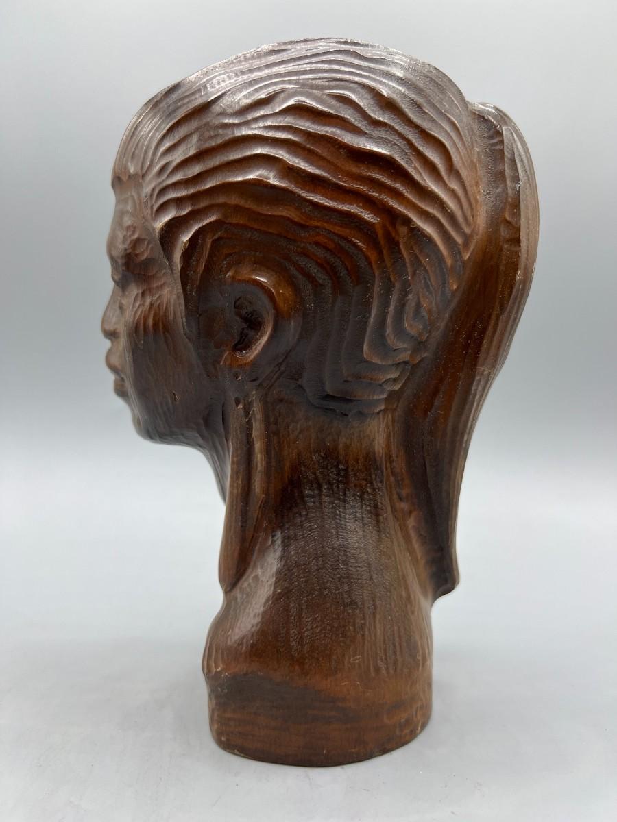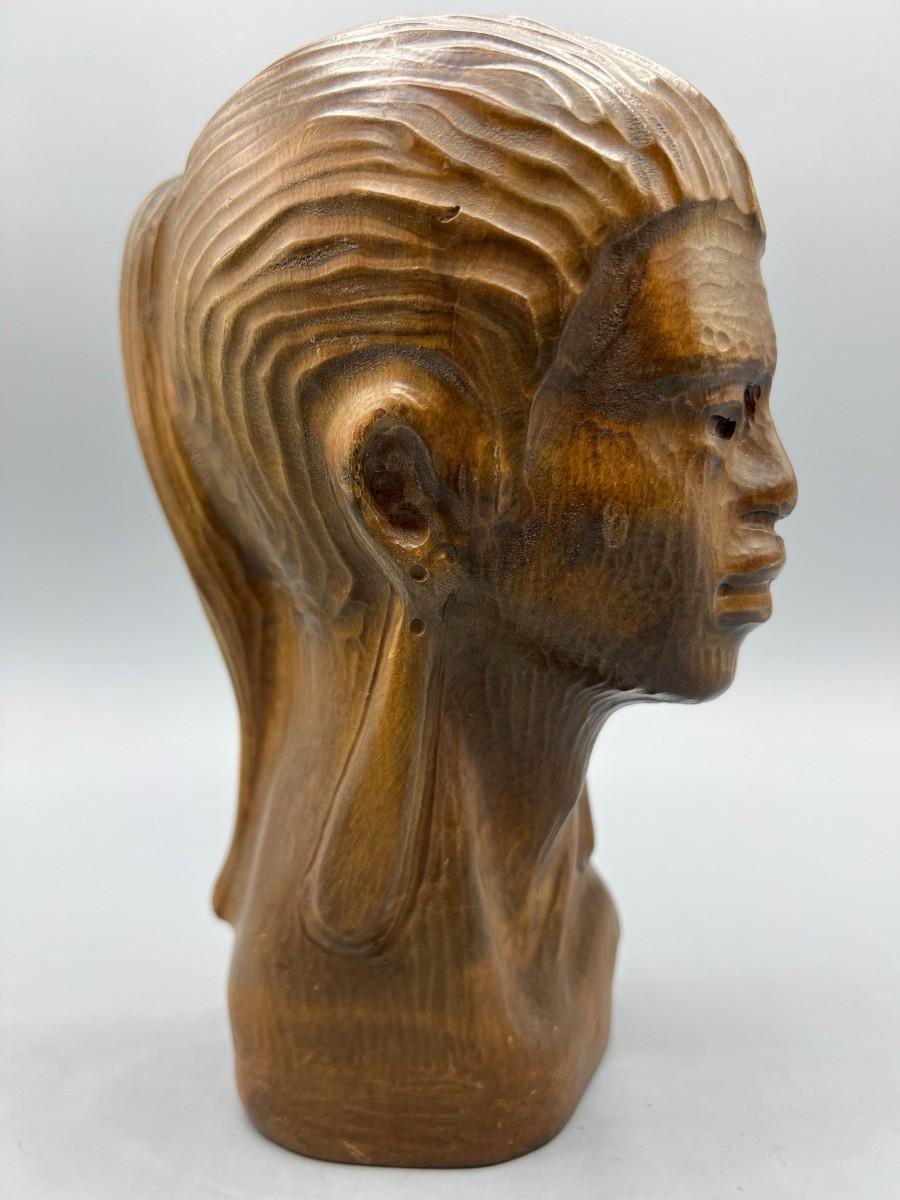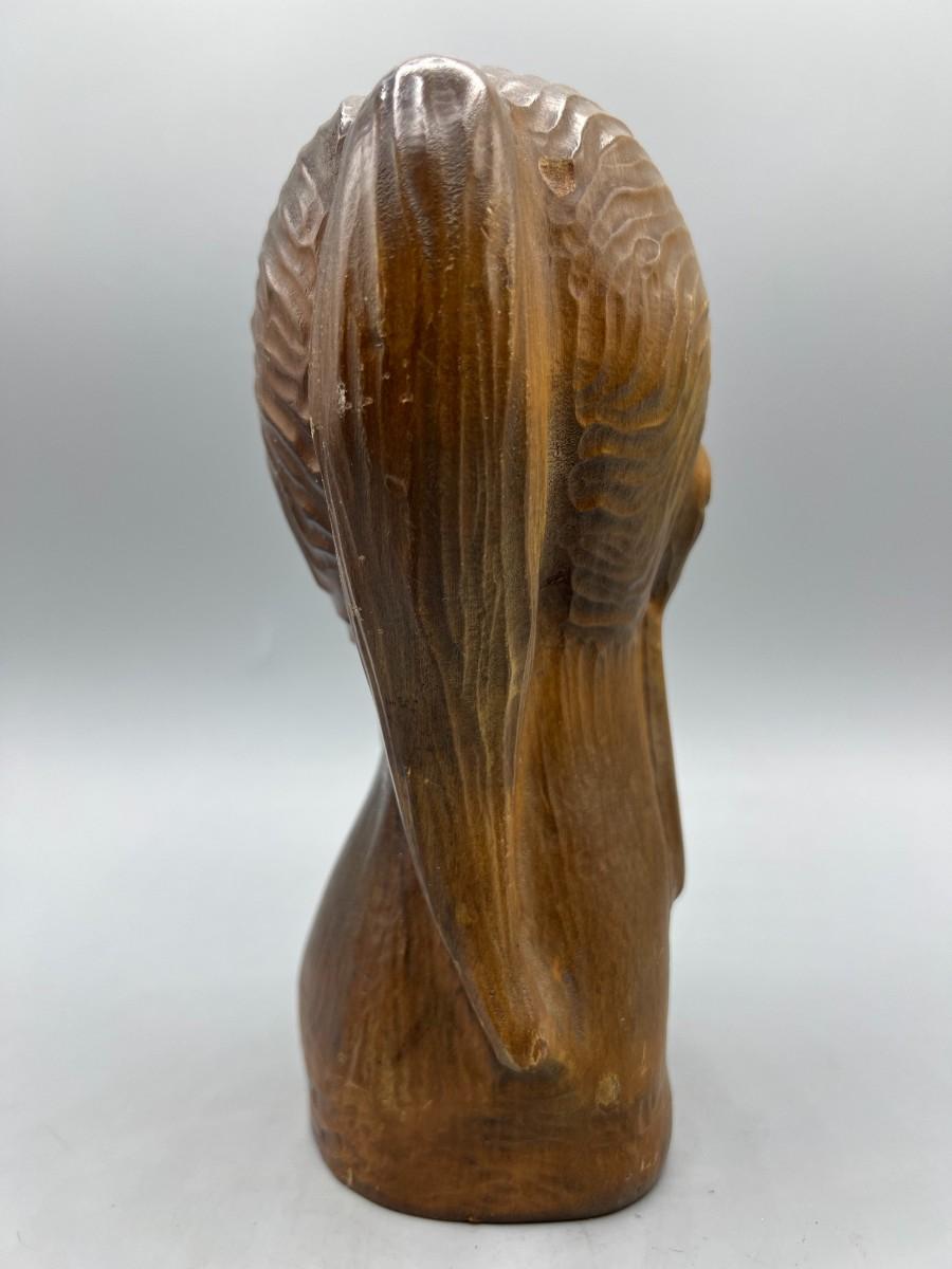 Retro Carved Wood Bust of Indigenous Woman with Low Hanging Earlobes