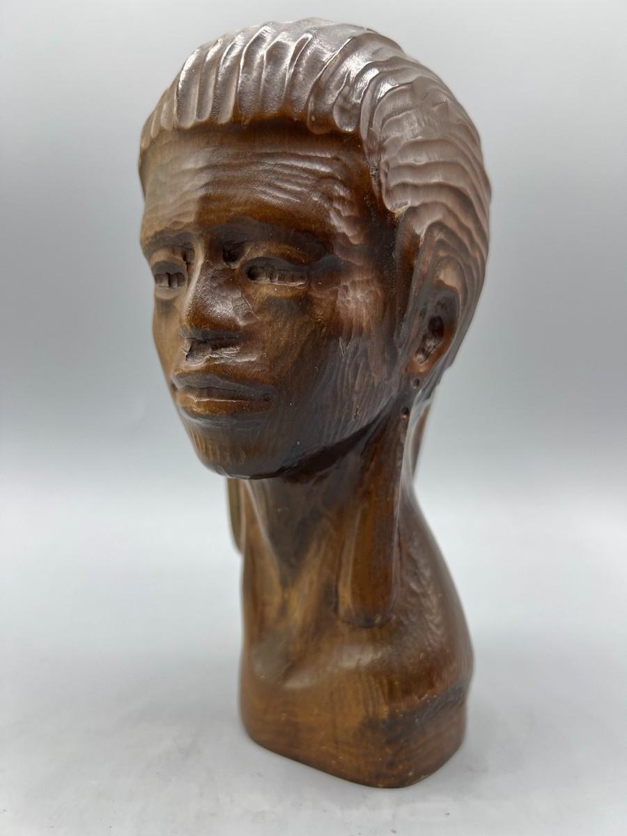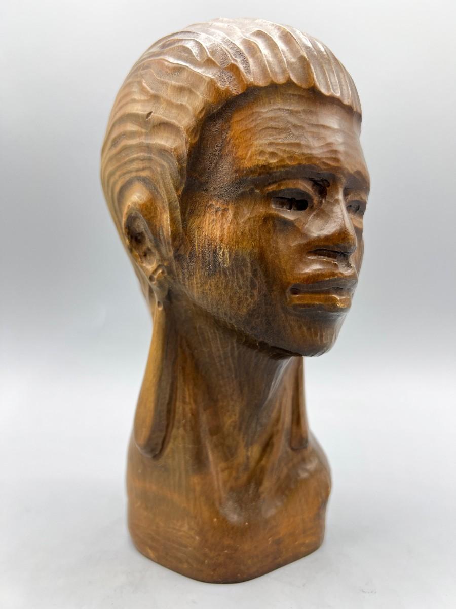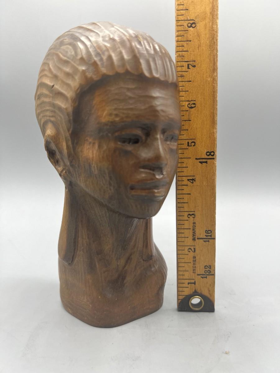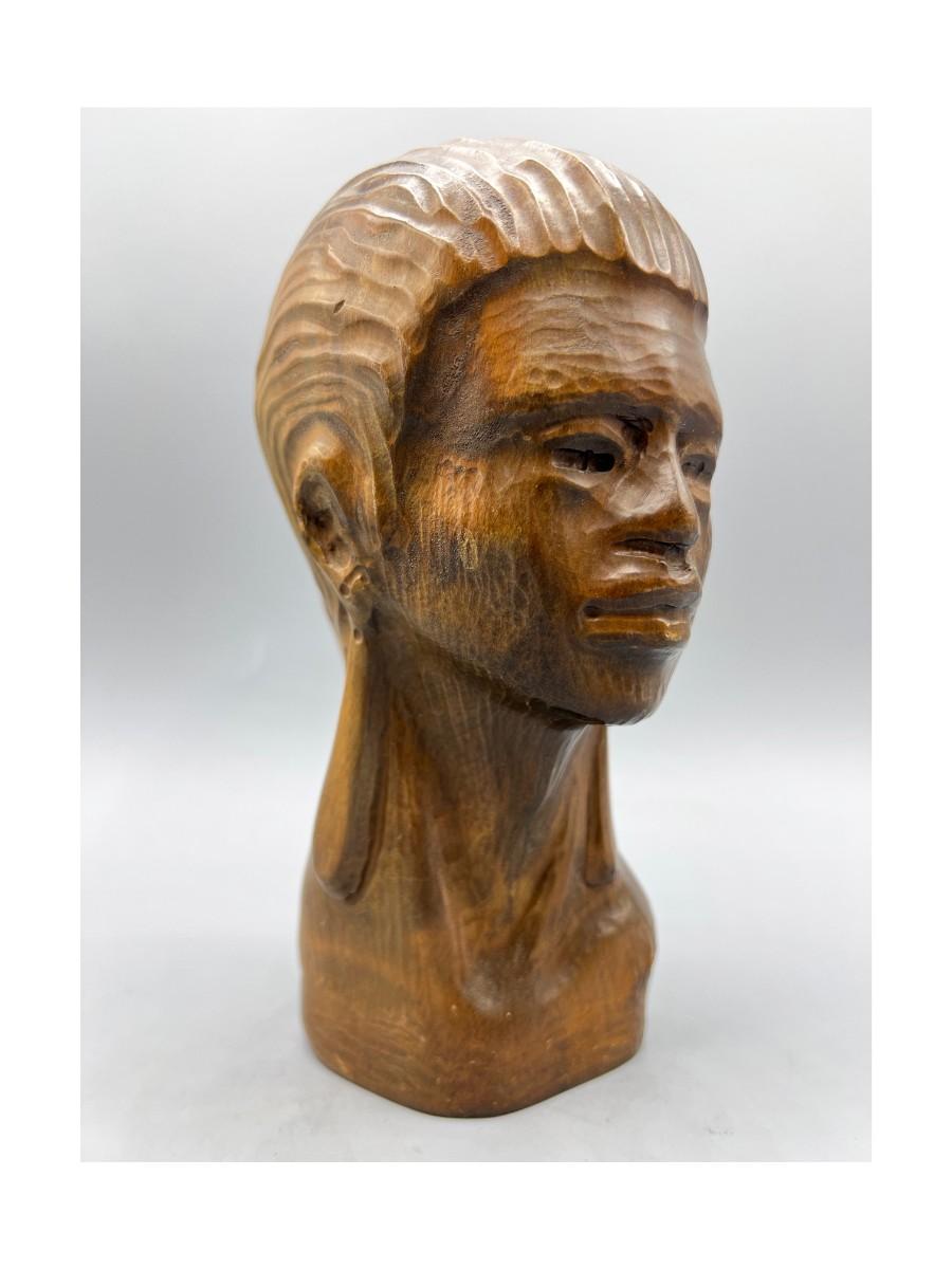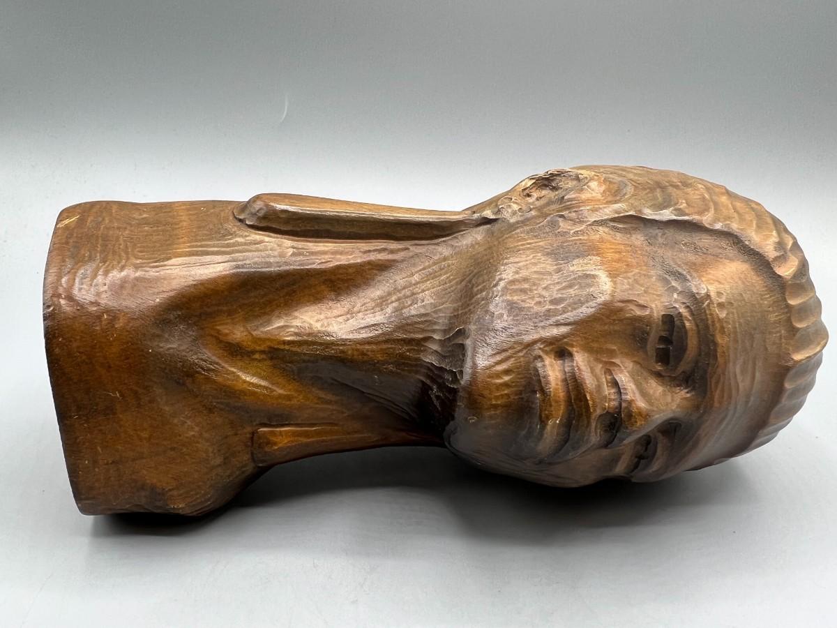 There is no significant damage to the wooden bust and is in good displayable condition. Check pictures for more details and for sizing.