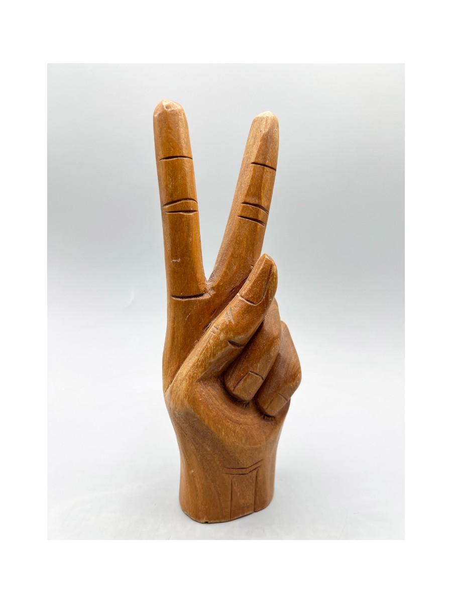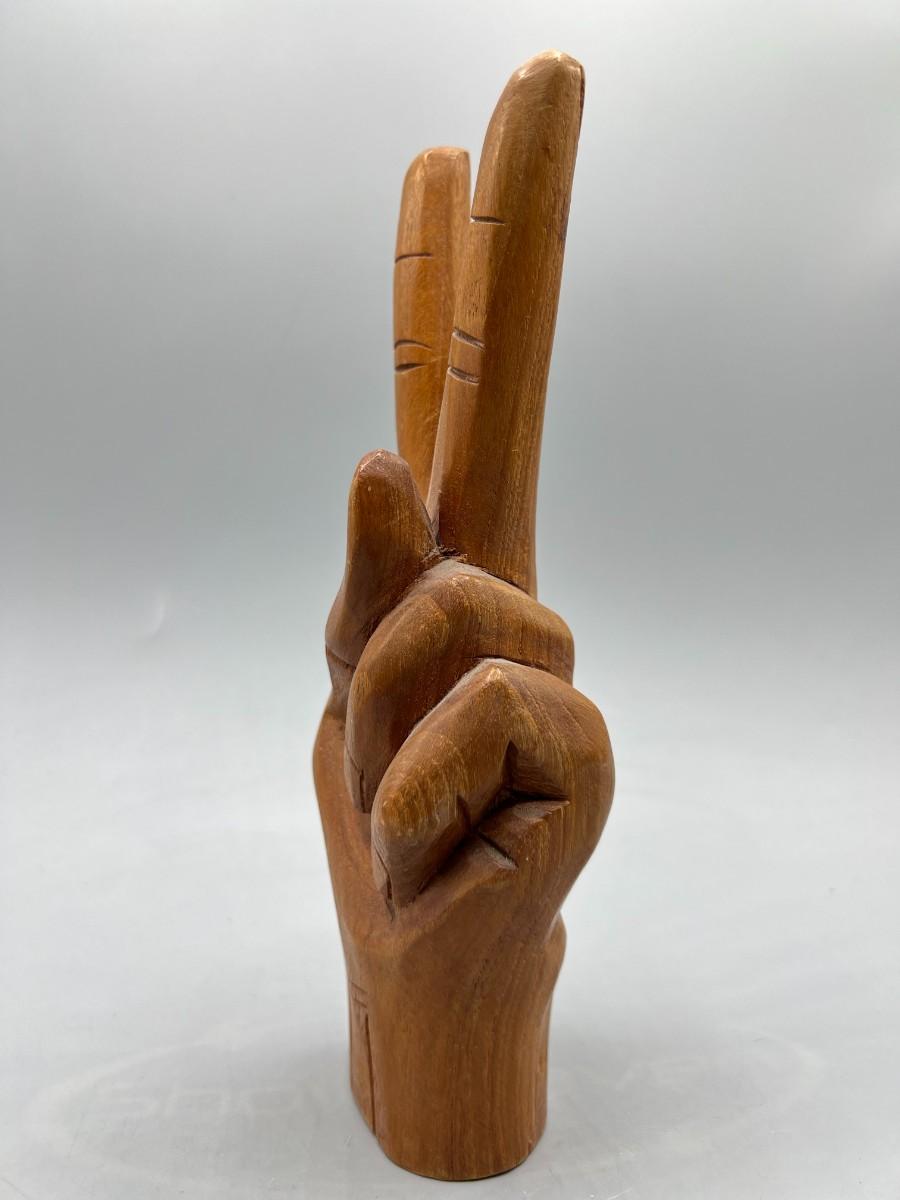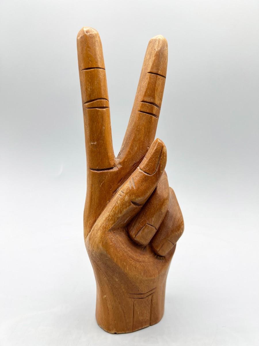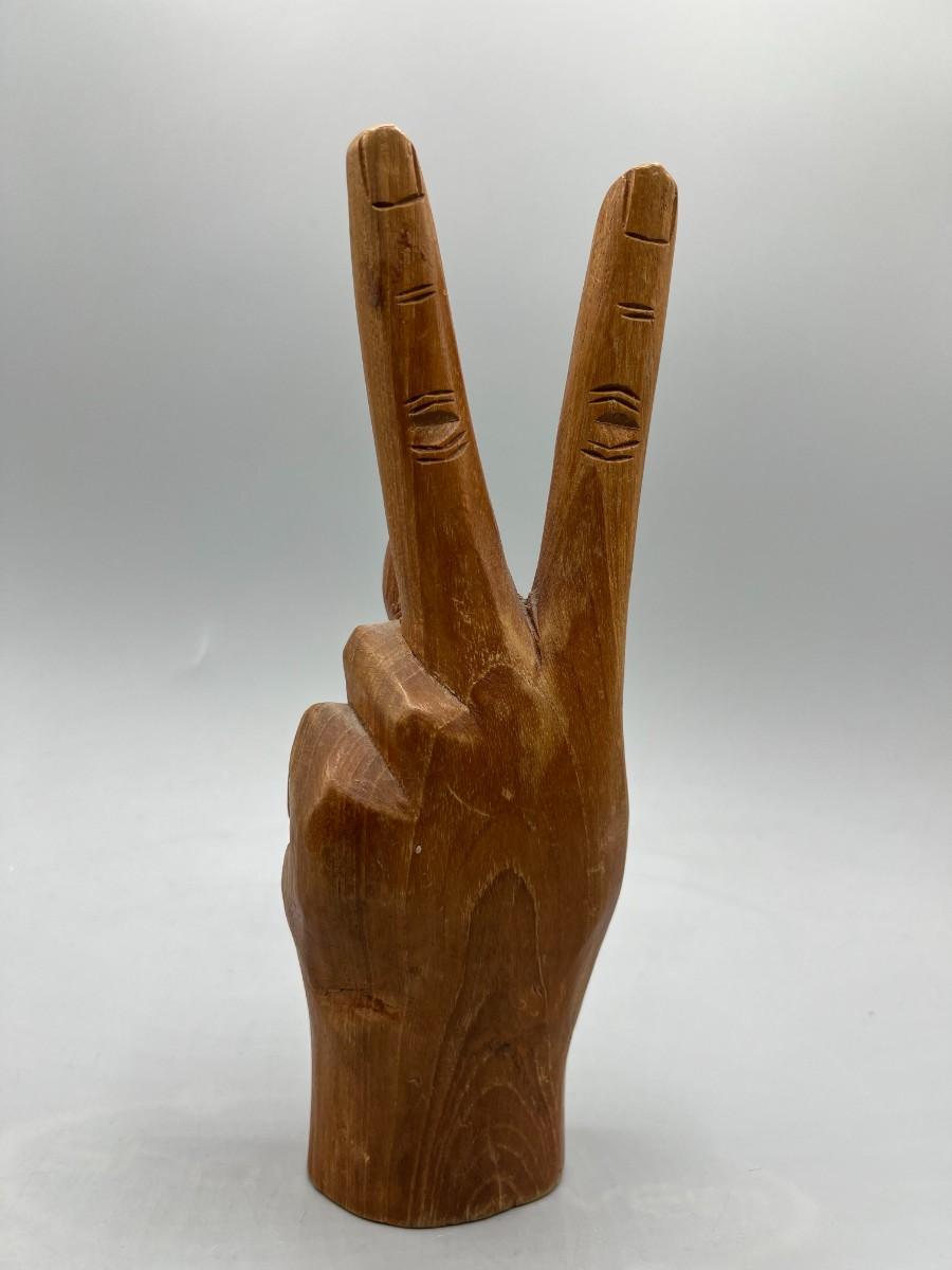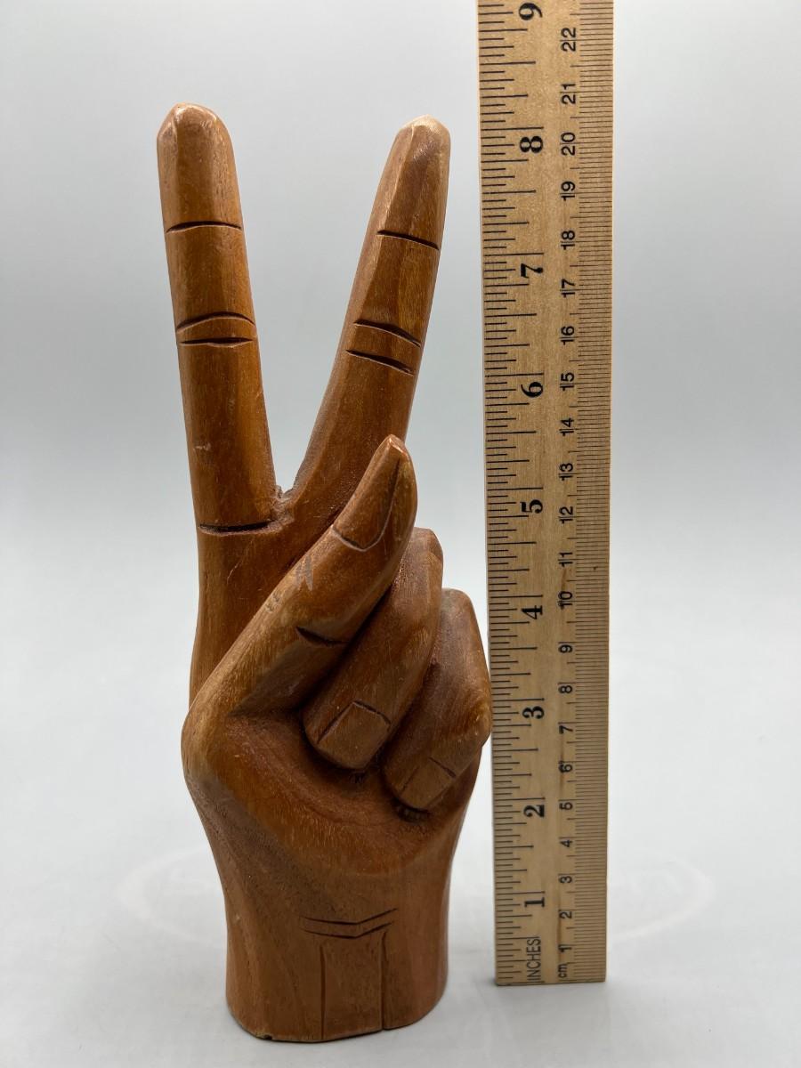 Retro Carved Wood Hand Holding Peace Sign Jewelry Ring Vanity Display Figurine