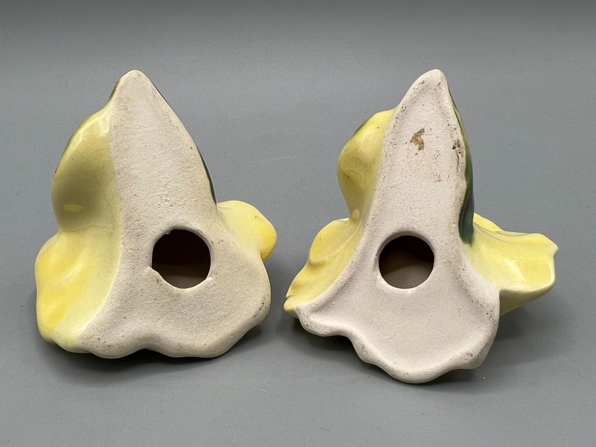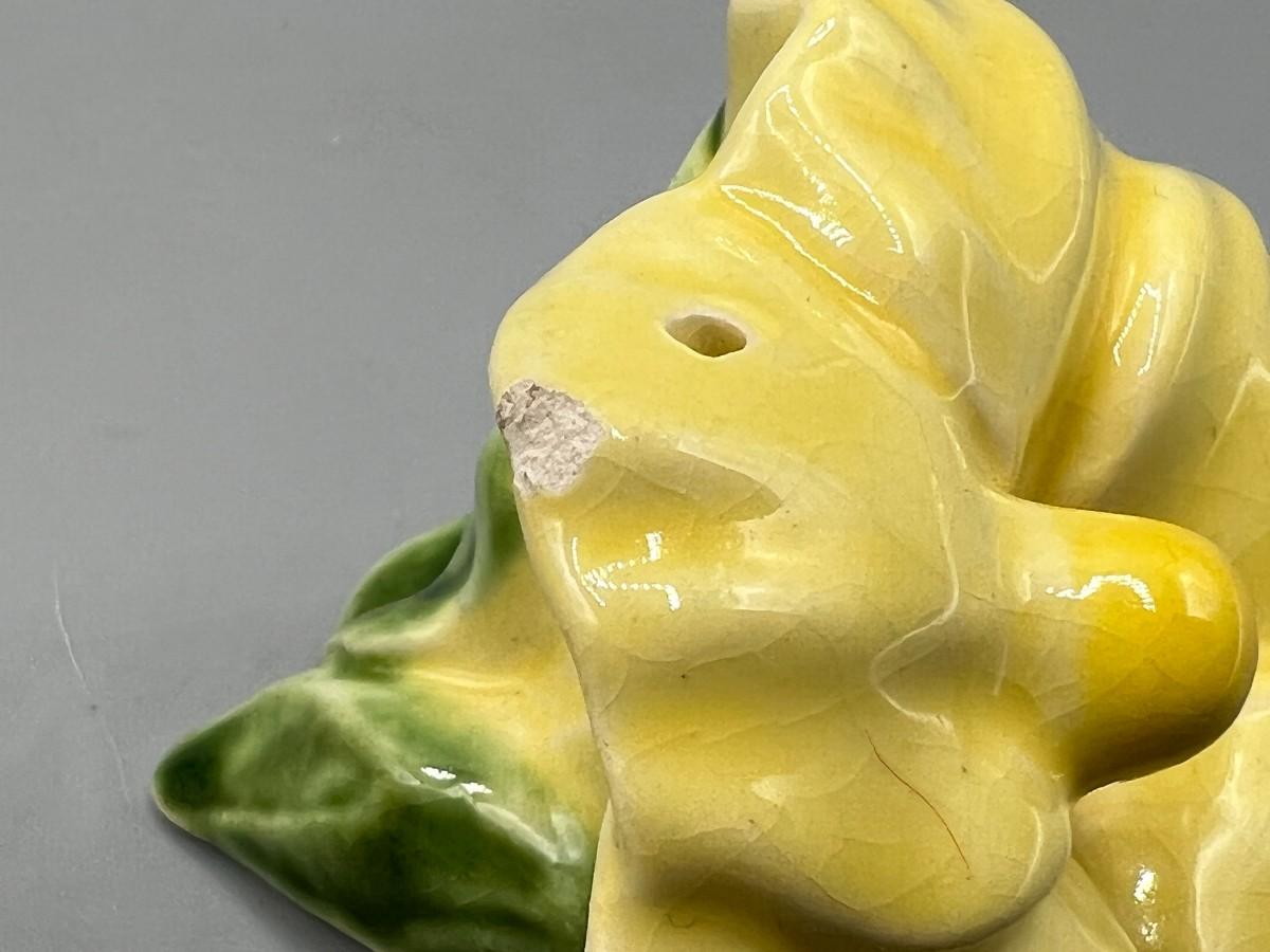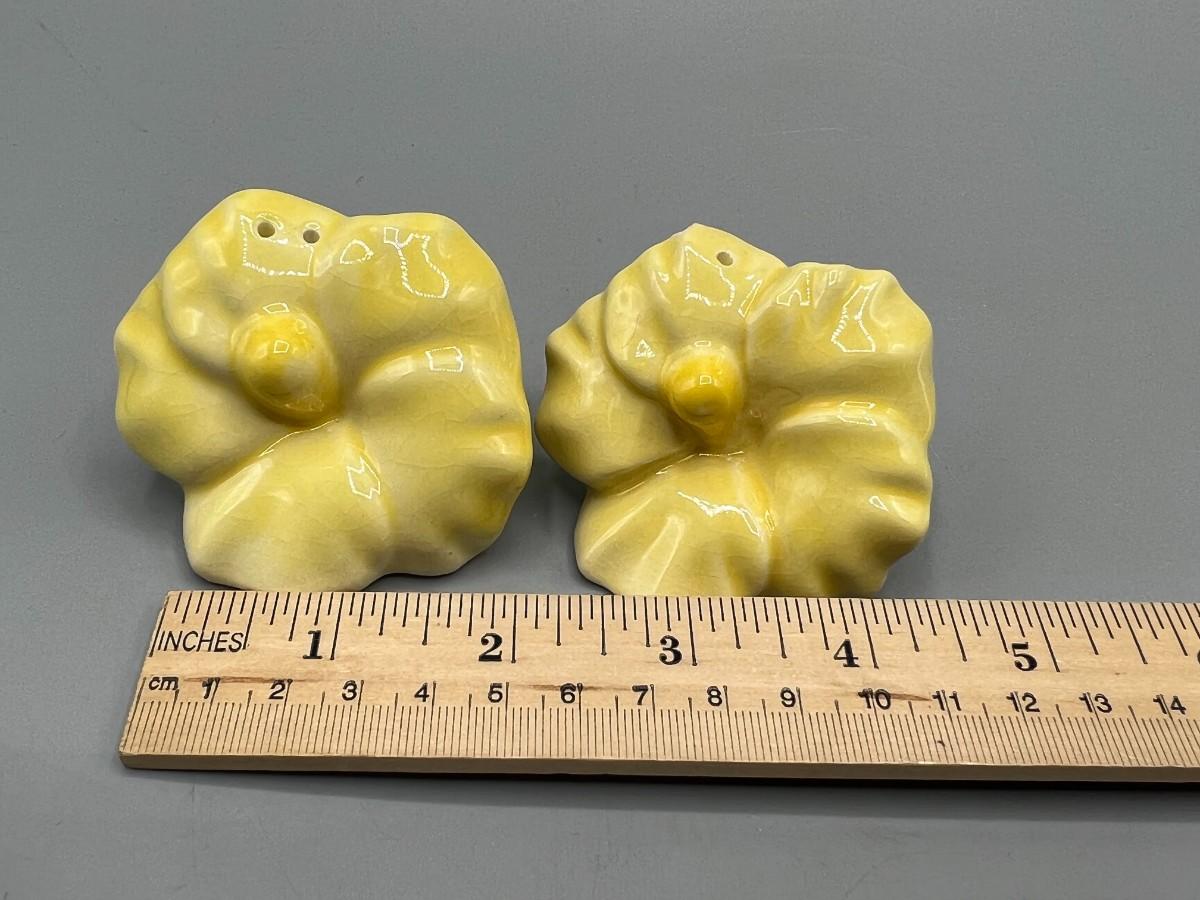 Retro Ceramic Hibiscus Salt & Pepper Shakers, there is a small crack on one of the shakers and both shakers do not come with the rubber stopper. Check pictures for more details and for sizing.