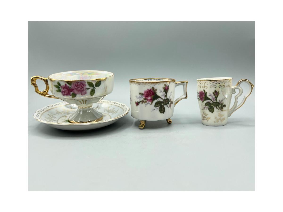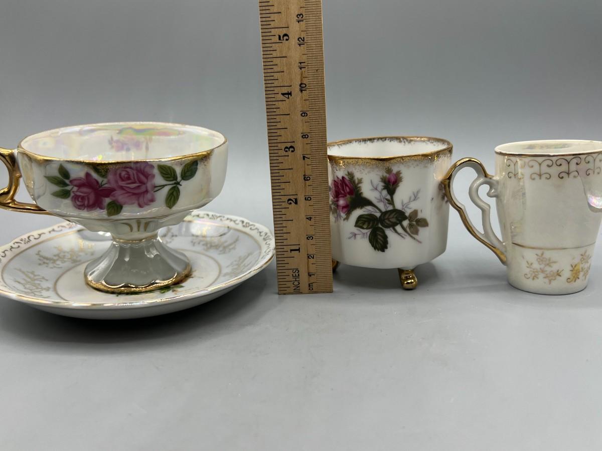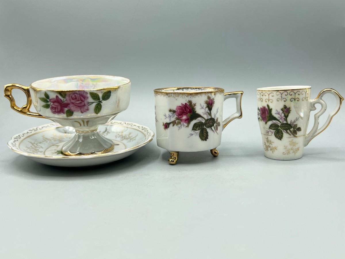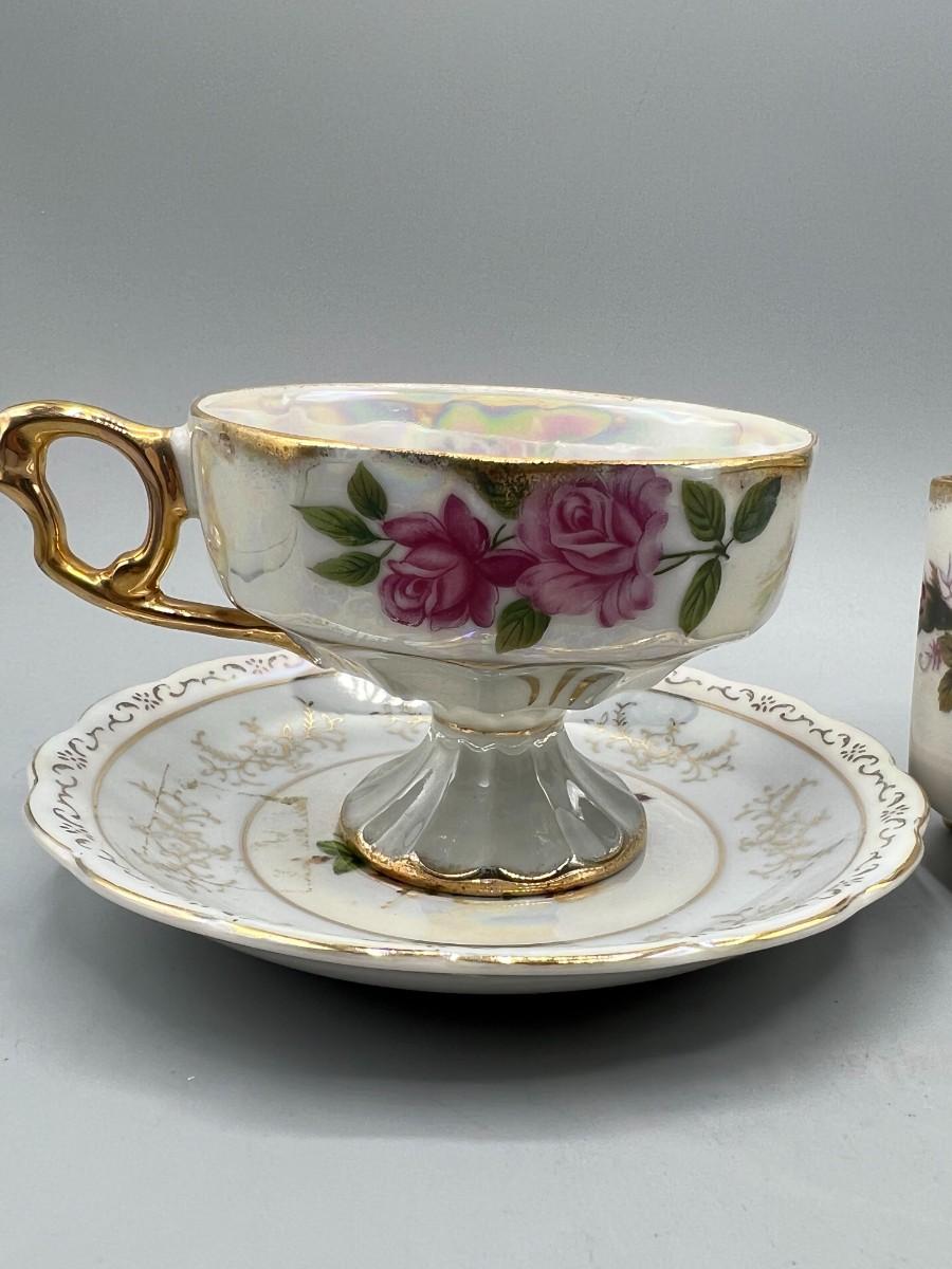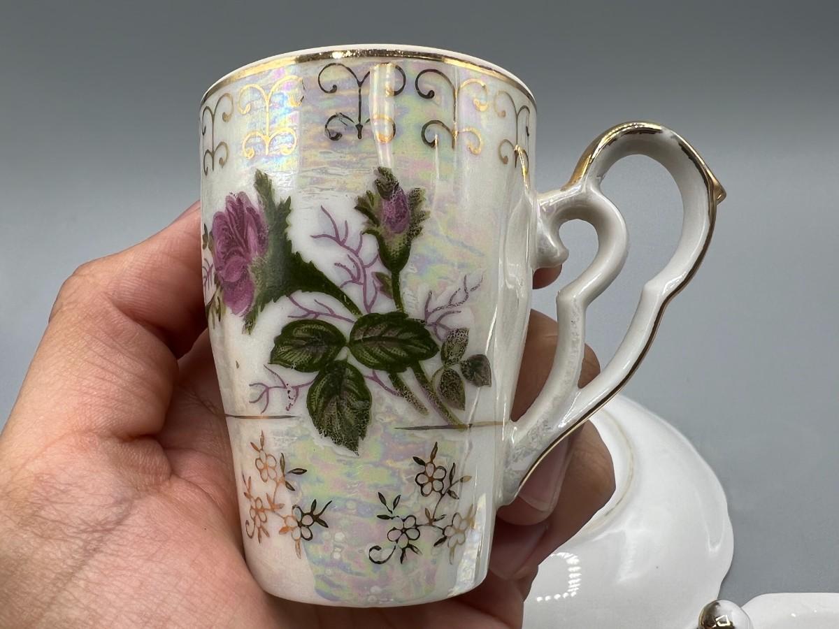 Retro Ceramic Opalescent Rose Pattern Tea Set Sugar Bowl, Teacup, & Creamer Serving Cup