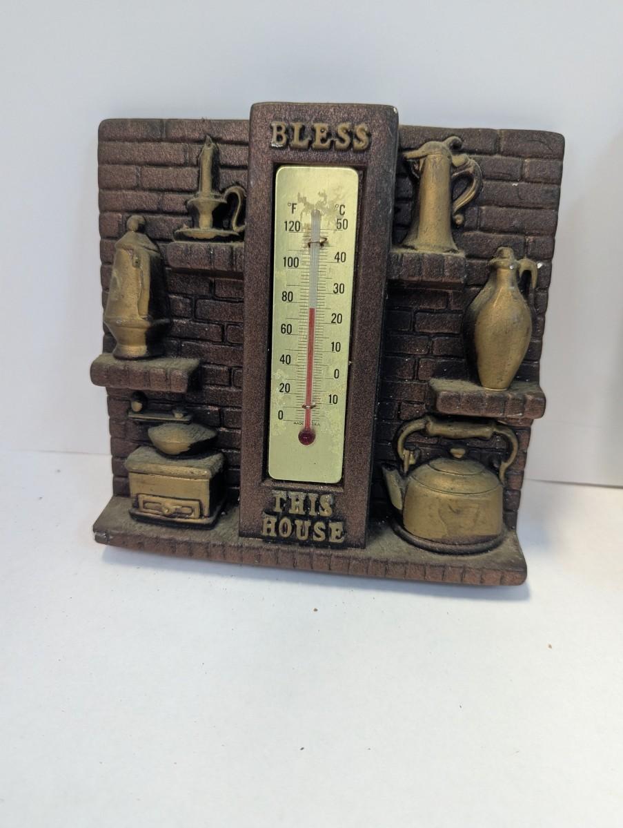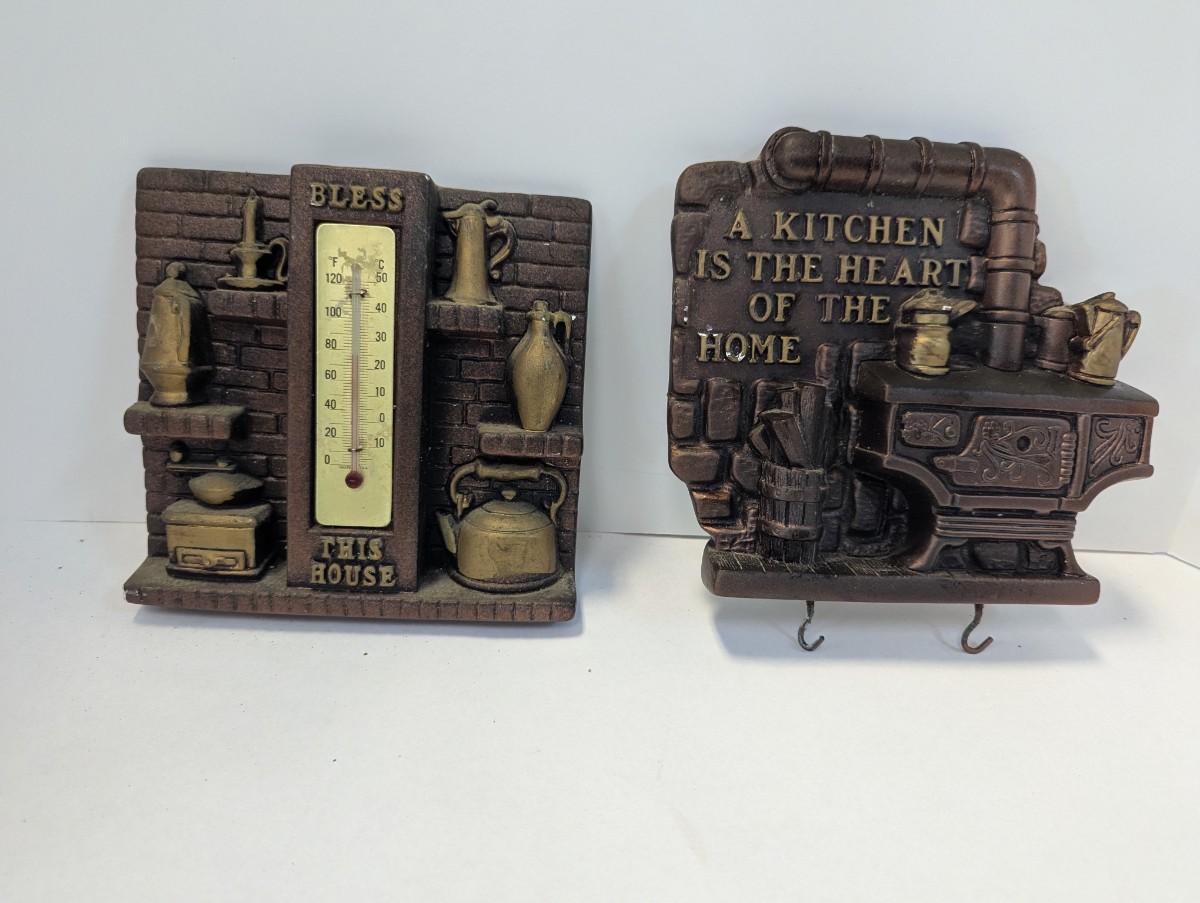 Retro Chalkware Thermometer 1975 Miller Studio Bless This House Wall Hanging & 1974 Kitchen Is The Heart Of The Home