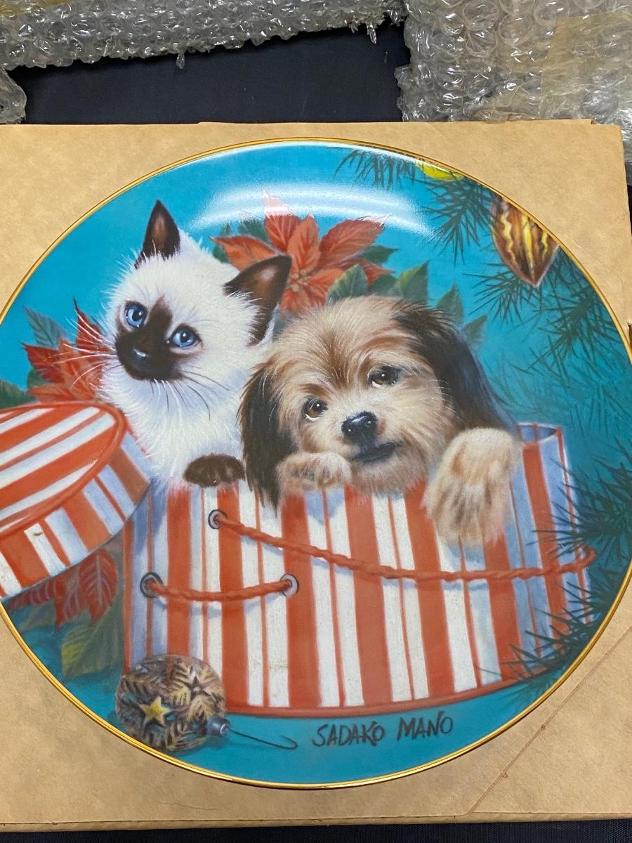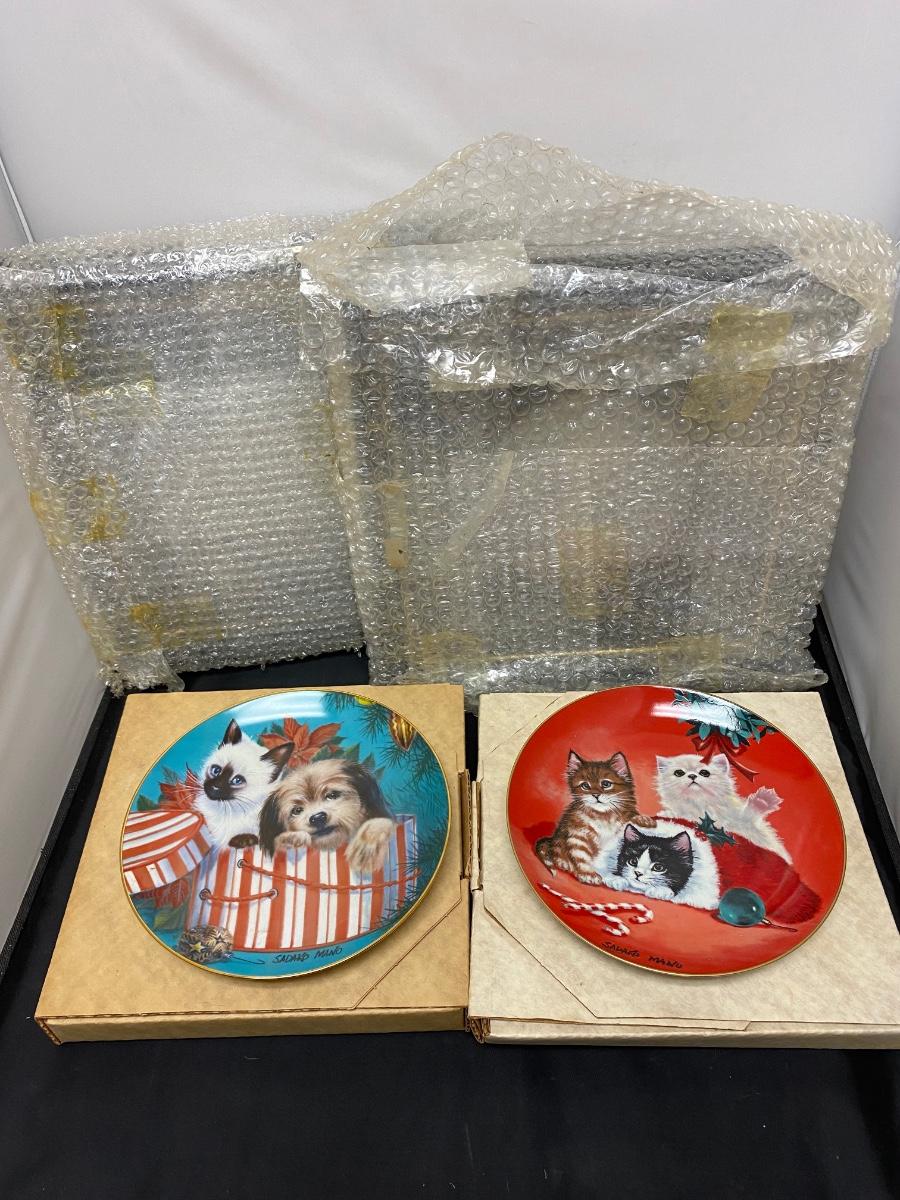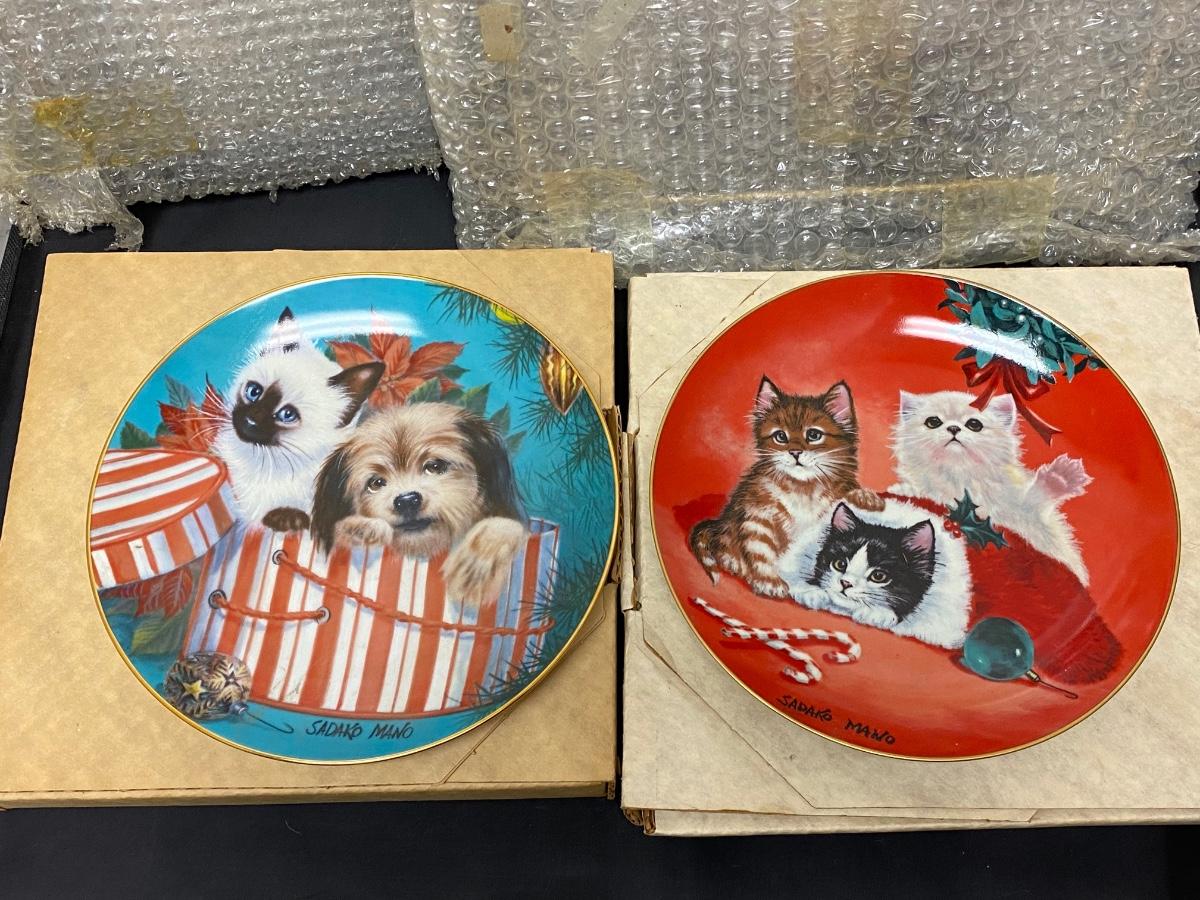Pair of retro Christmas holiday pet themed collector plates from Sadako Mano. Early 1980s. Come in their original shipper boxes and include a pair of unused plate display frames.