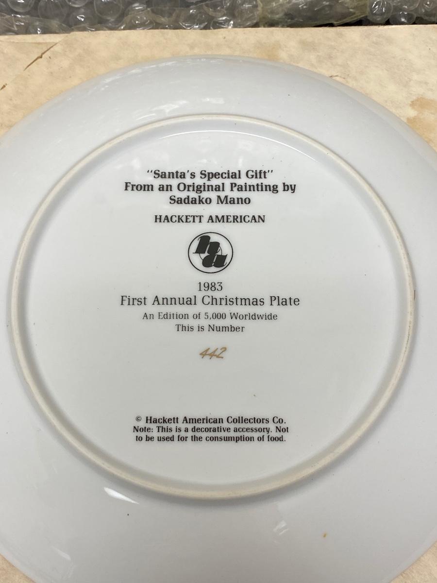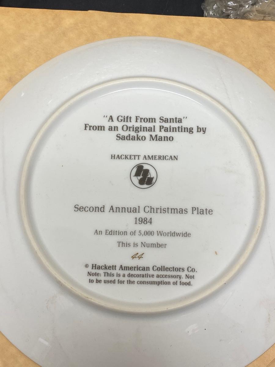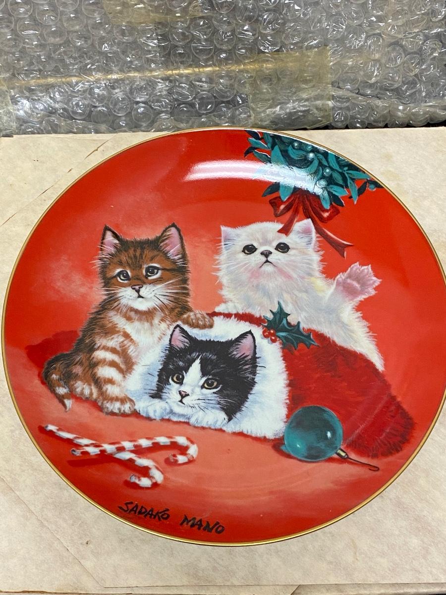 Pair of retro Christmas holiday pet themed collector plates from Sadako Mano. Early 1980s. Come in their original shipper boxes and include a pair of unused plate display frames.