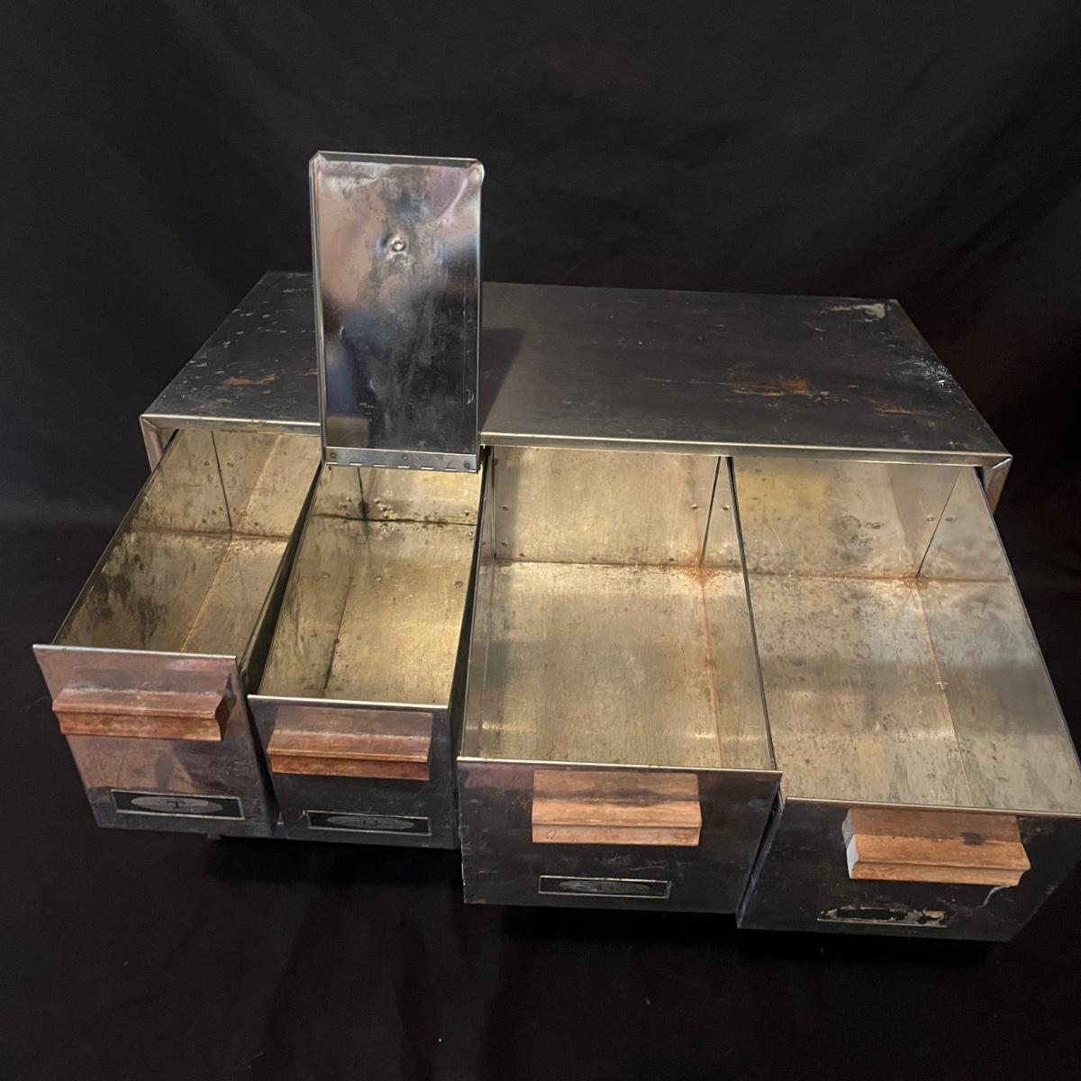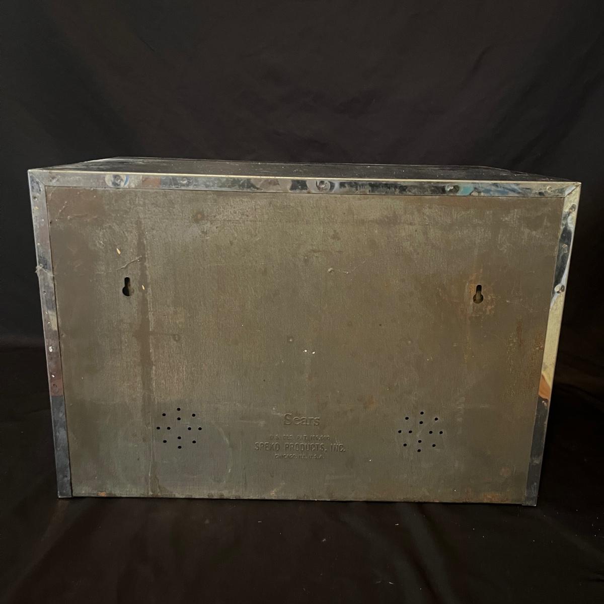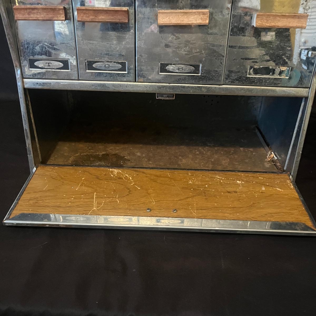 Lot includes a retro chrome breadbox with four canister drawers on top. Box measures 18” x 10” x 12”H. Box has scratches, nicks and tape residue on it, see pictures.