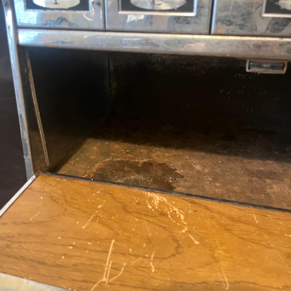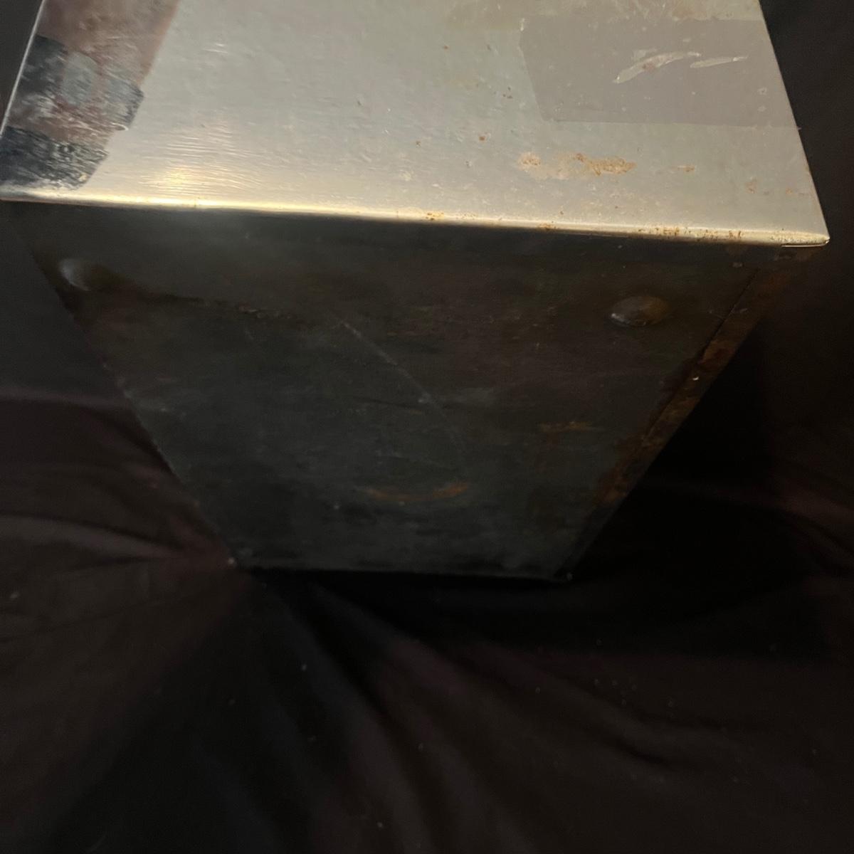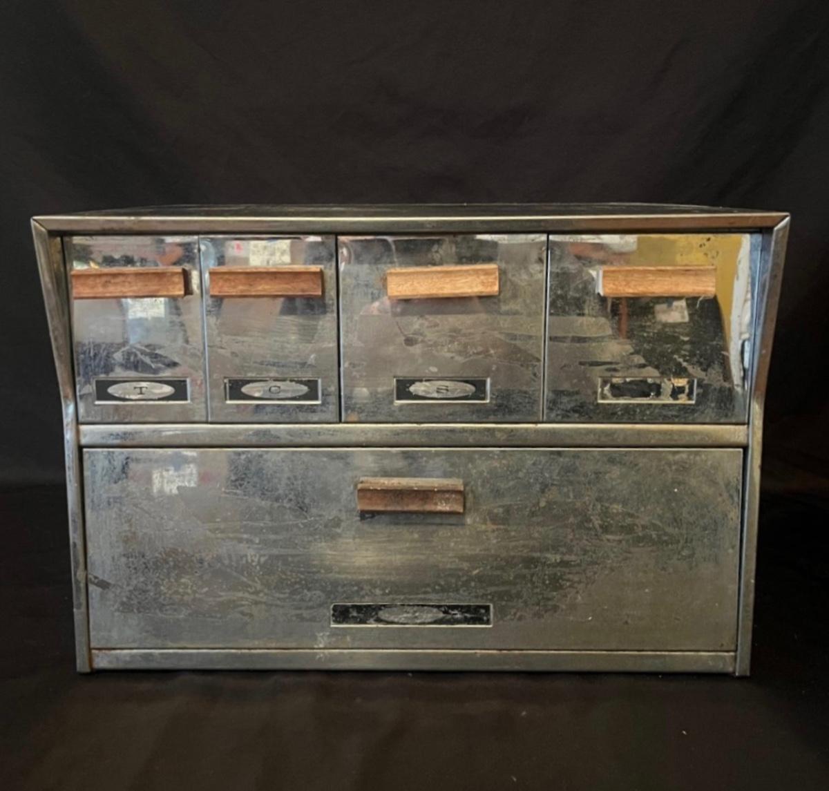 Lot includes a retro chrome breadbox with four canister drawers on top. Box measures 18” x 10” x 12”H. Box has scratches, nicks and tape residue on it, see pictures.