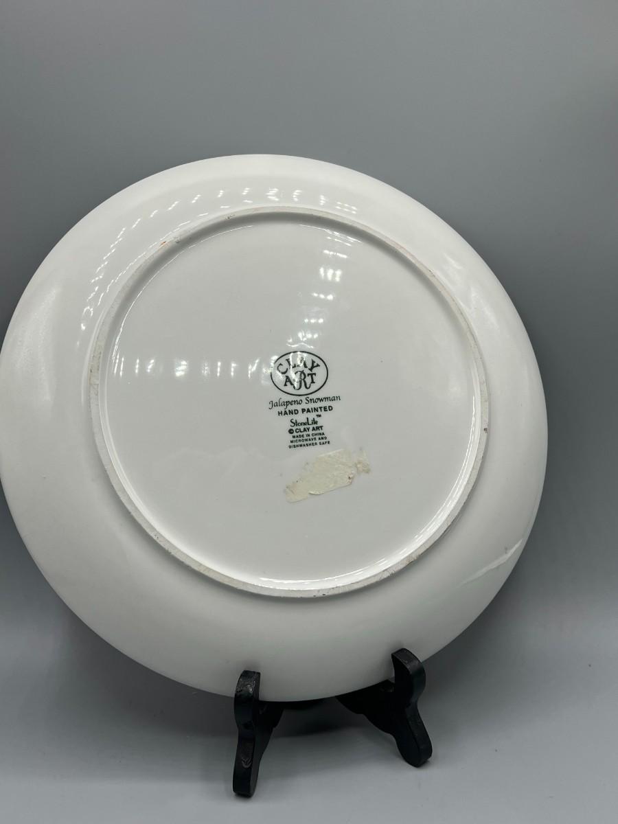 Retro Clay Art Hand Painted Dinner Jalapeno Snowman Festive Plate, there is no significant cracks or chips to the plate and is in good useable condition. Check pictures for more details and for sizing.