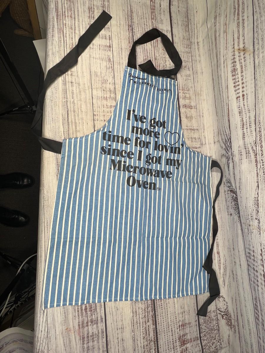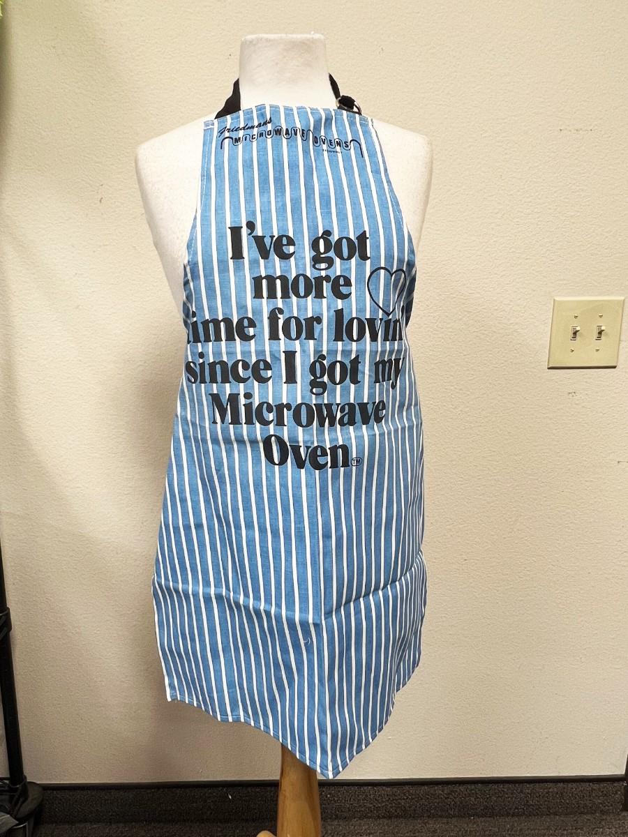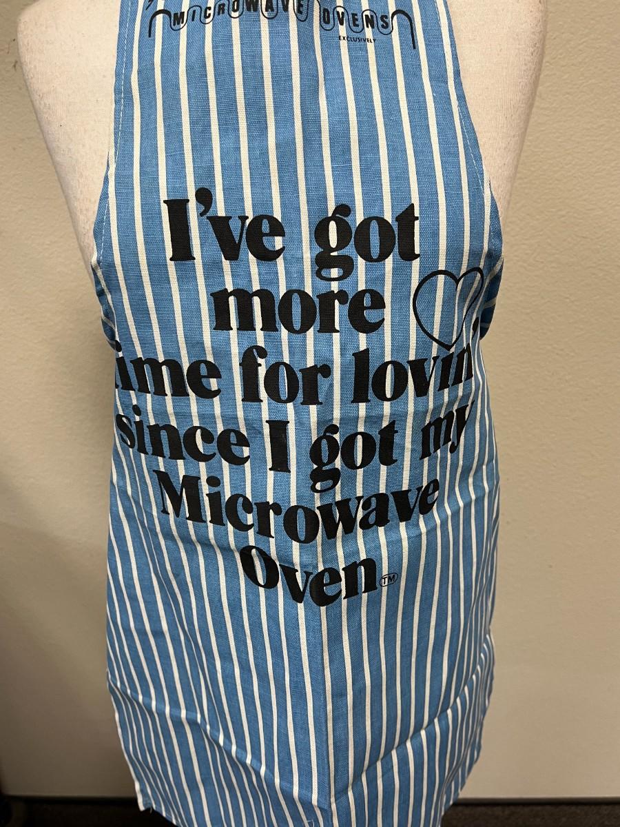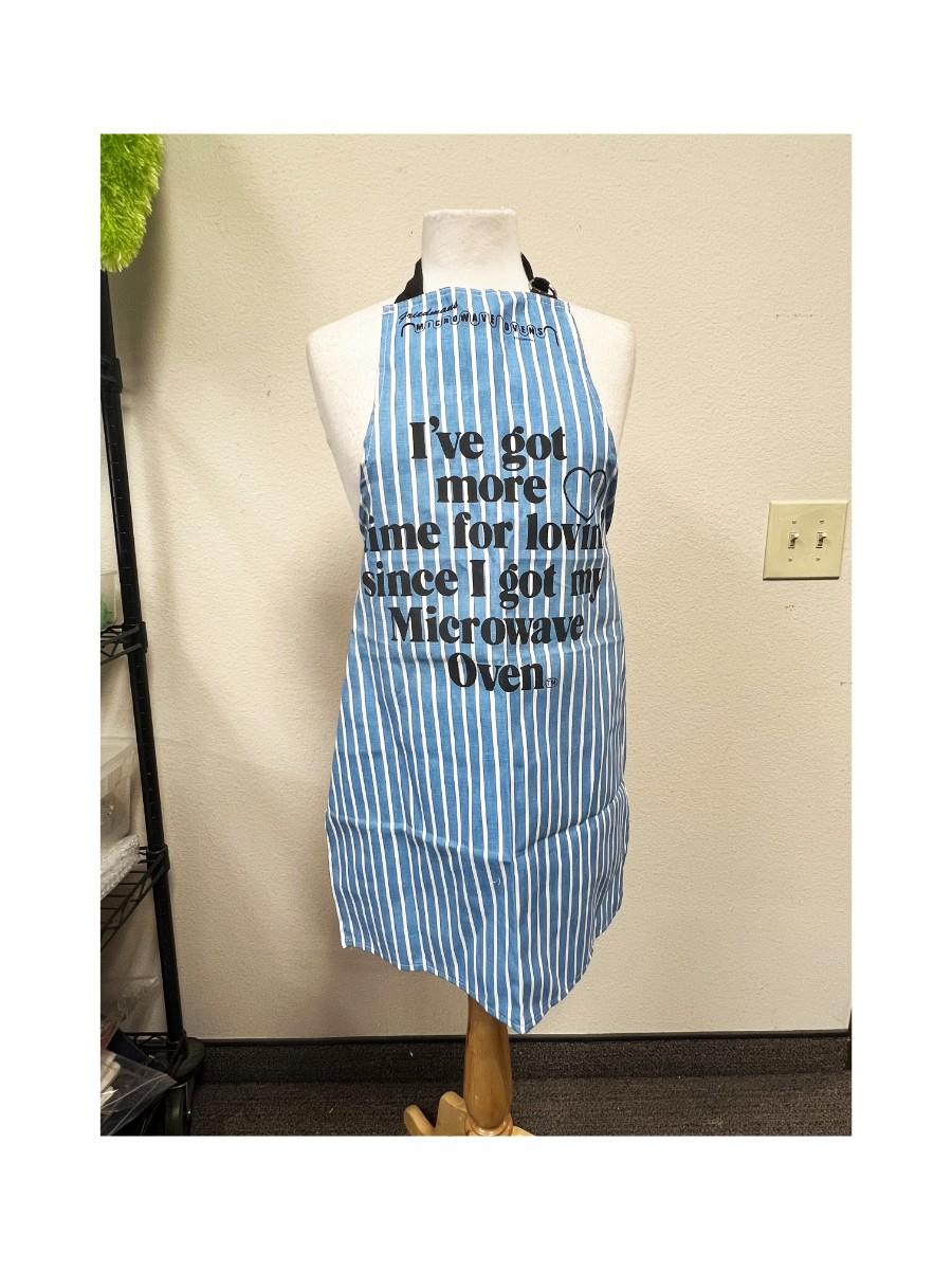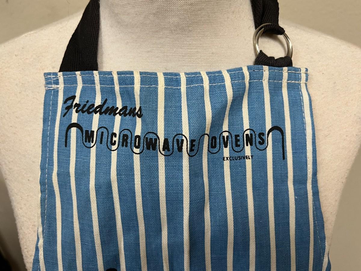 Retro Collectible Friedmans Microwave Ovens Blue Striped Cooking Apron, there is no significant tears or rips to the apron and is in good vintage and useable condition. Check pictures for more details and for sizing.