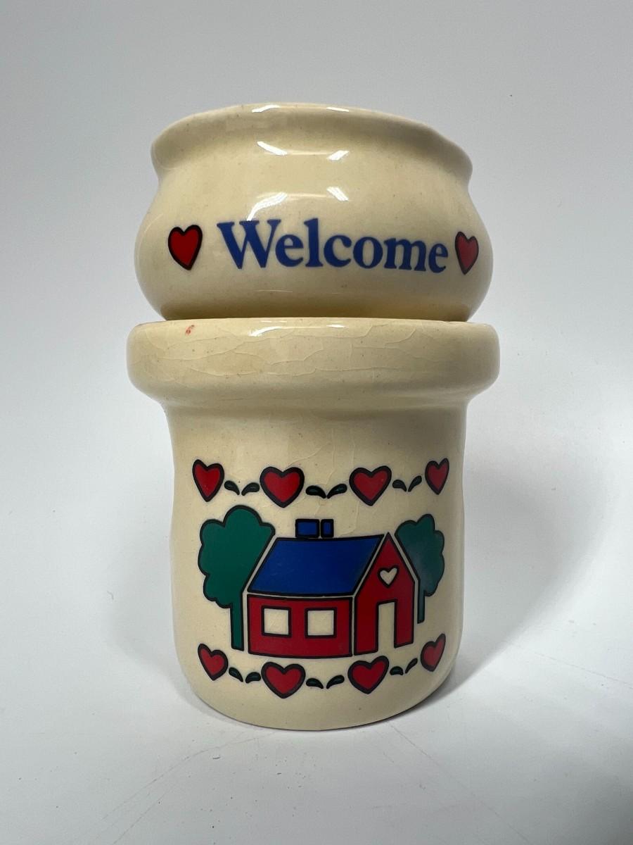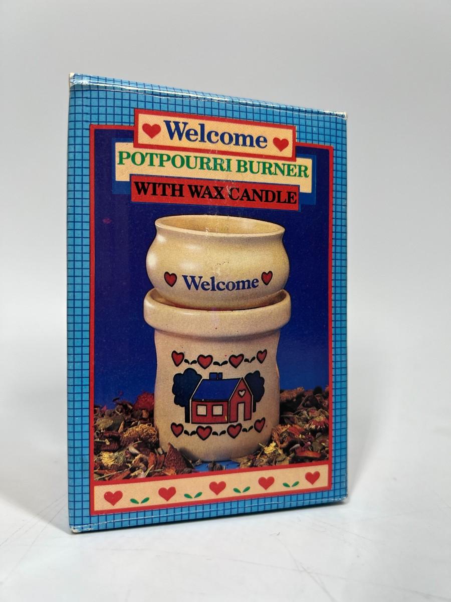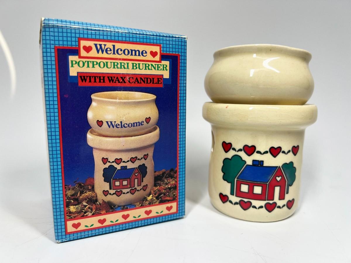 Retro Comfy Home Giftco Ceramic Welcome Potpourri Burner, there is no significant damage to the ceramic burner and is in good retro condition. Comes with original box and instruction sheet, check pictures for more details and for sizing.