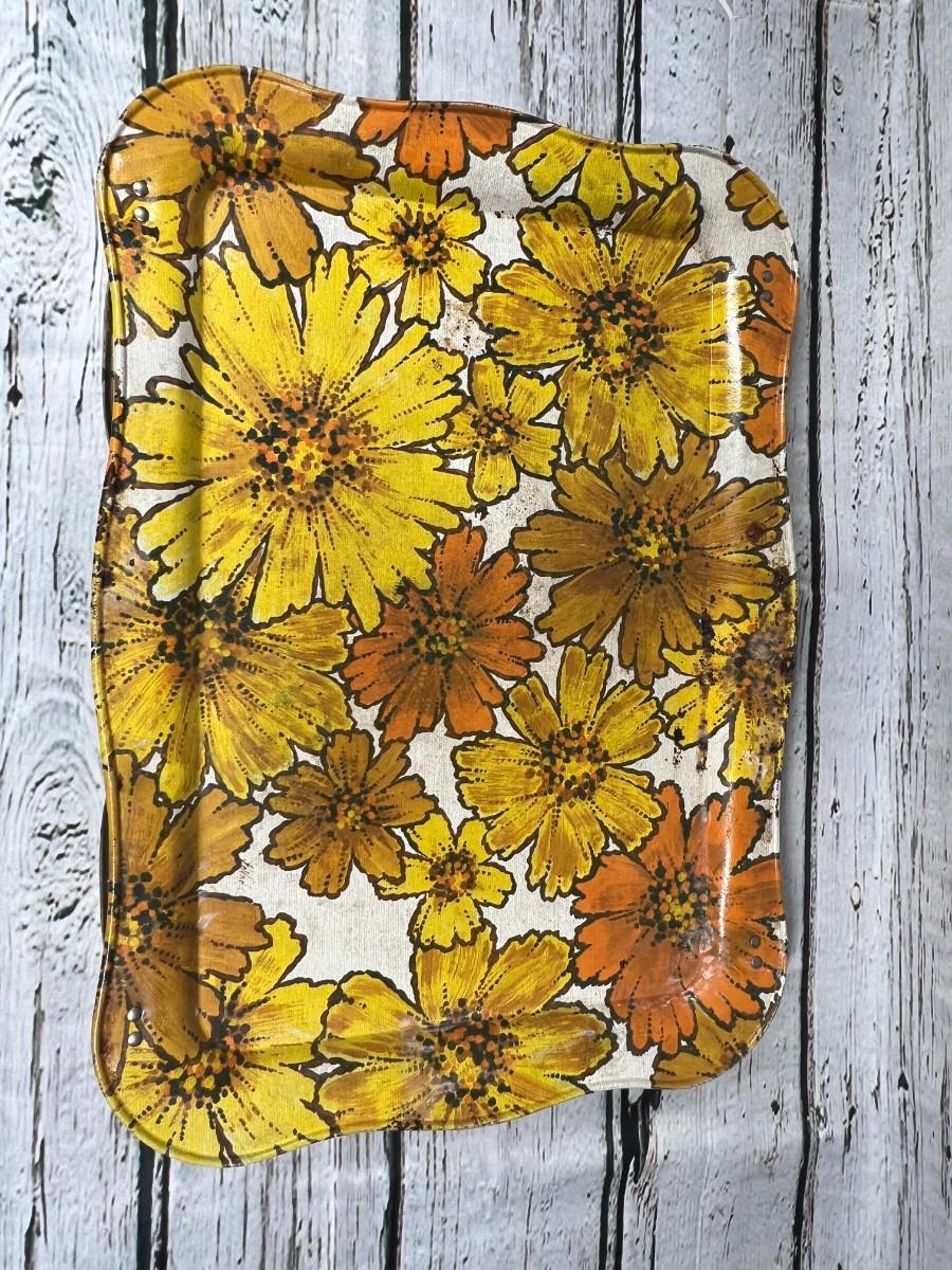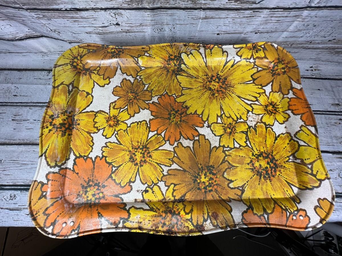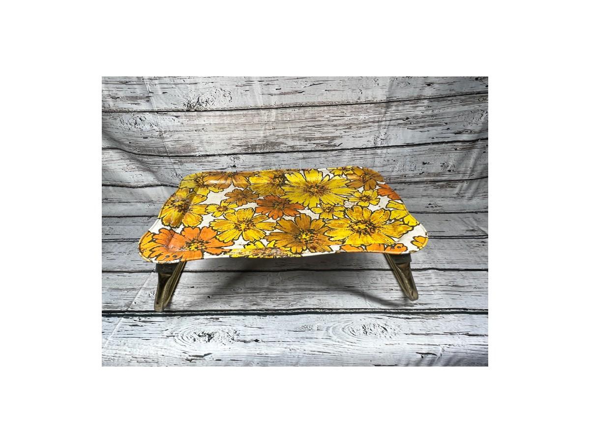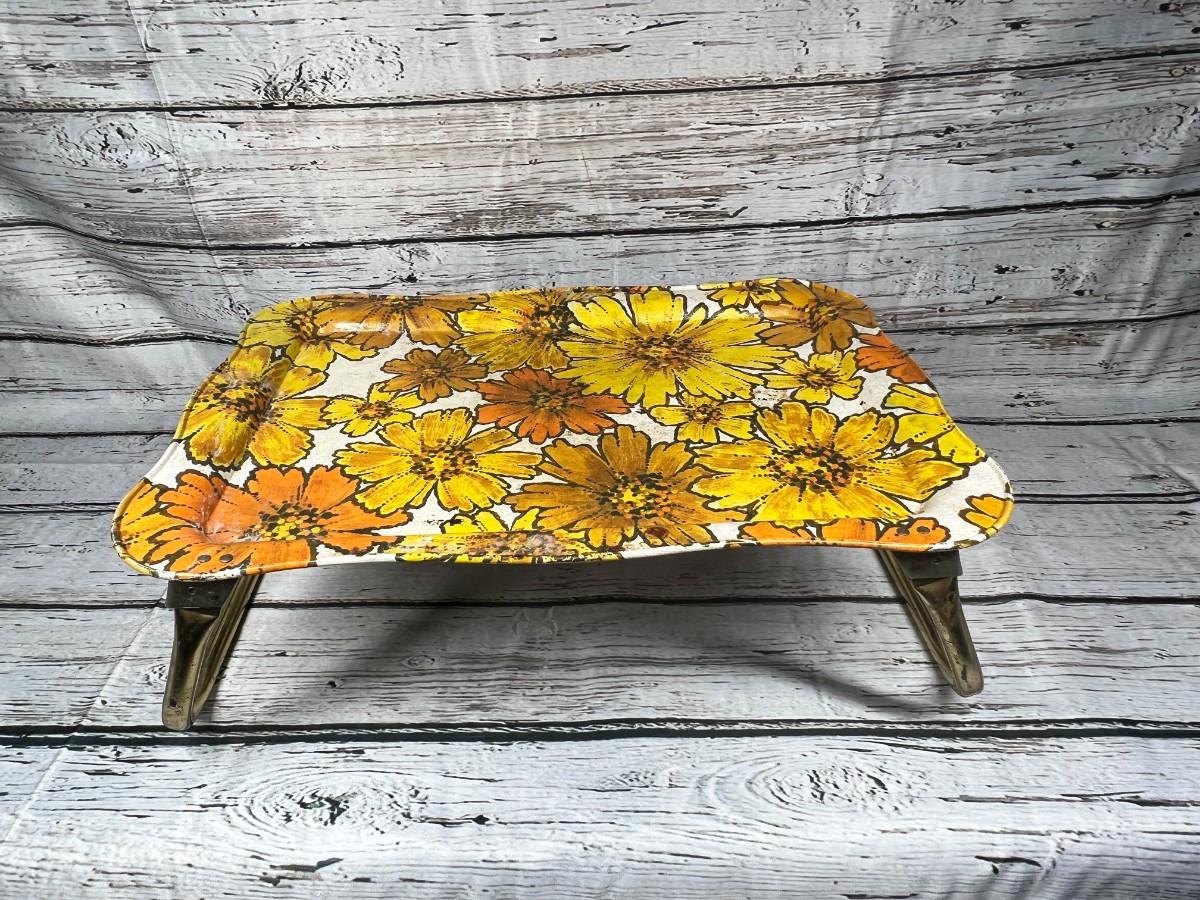 Retro Daisy Flower Foldable Metal TV Dinner Tray, there is some wear to the tray, but there is no significant damage and is in overall fair condition. Check pictures for more details and for sizing.