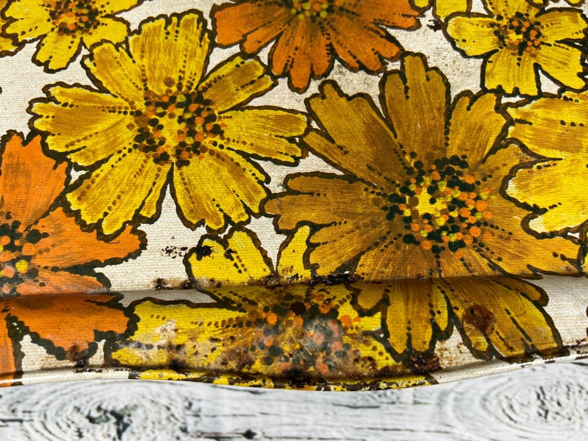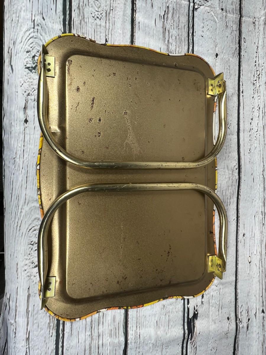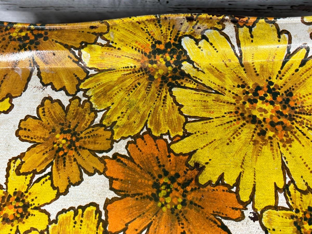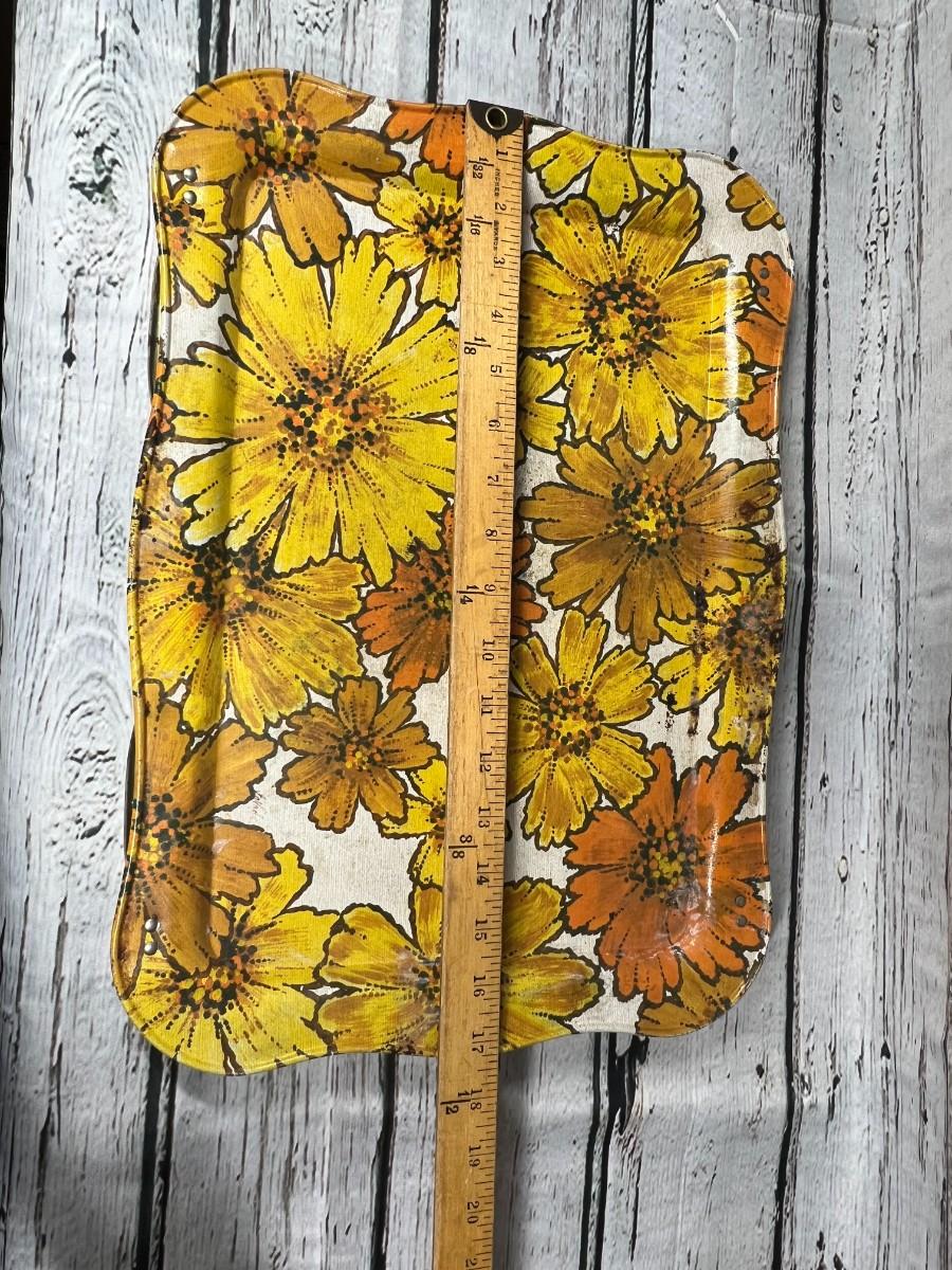 Retro Daisy Flower Foldable Metal TV Dinner Tray, there is some wear to the tray, but there is no significant damage and is in overall fair condition. Check pictures for more details and for sizing.