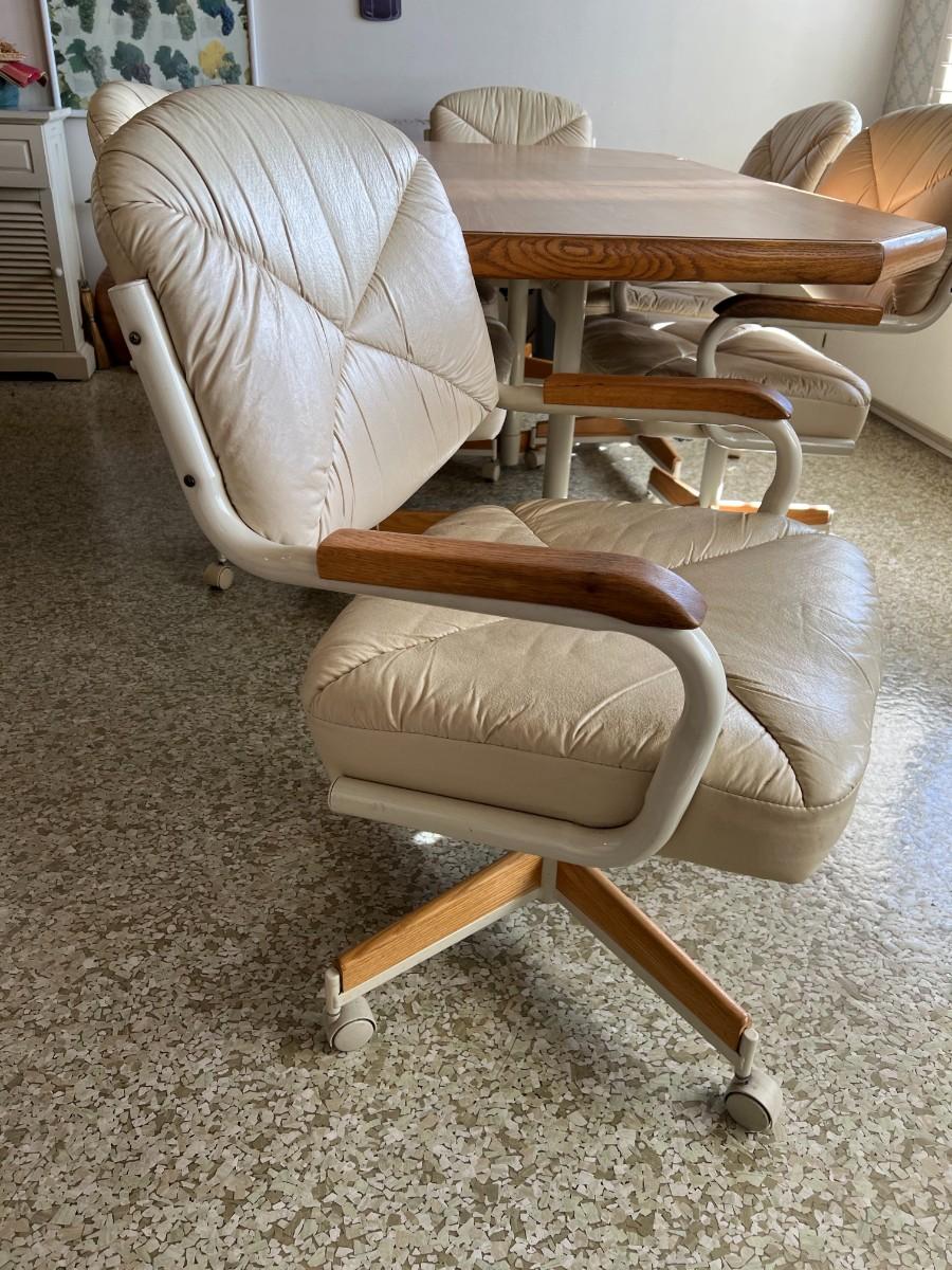 Retro Dining Room Extending Conference Table Set with White Vinyl Pleather Upholstered Swivel Chairs