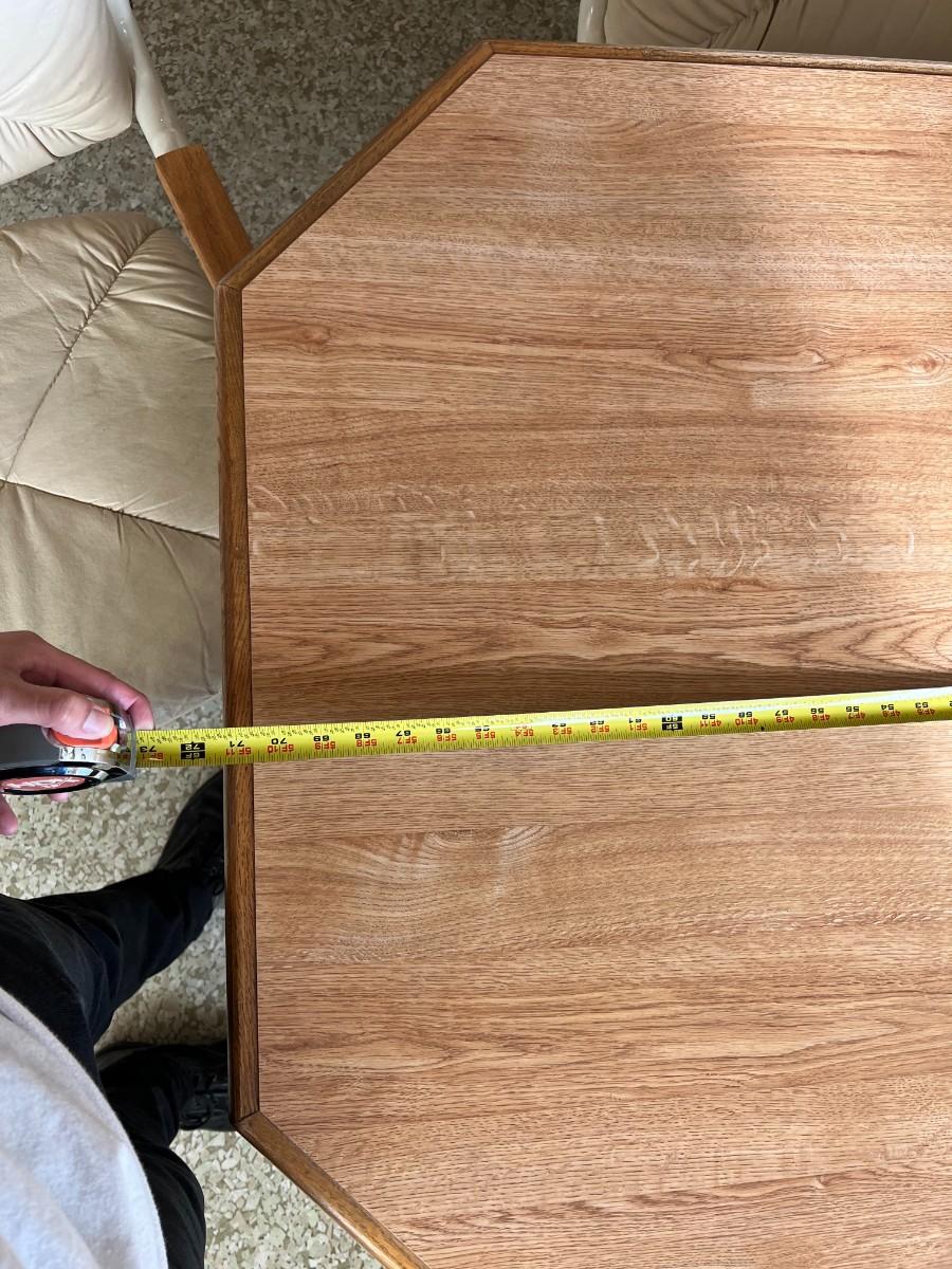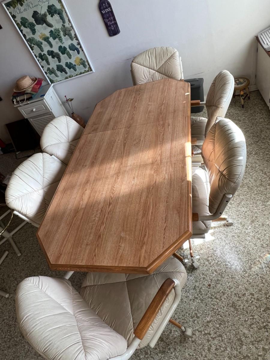 There is no significant damage to the table. Light signs of age and use to chairs. Check pictures for more details and for sizing.