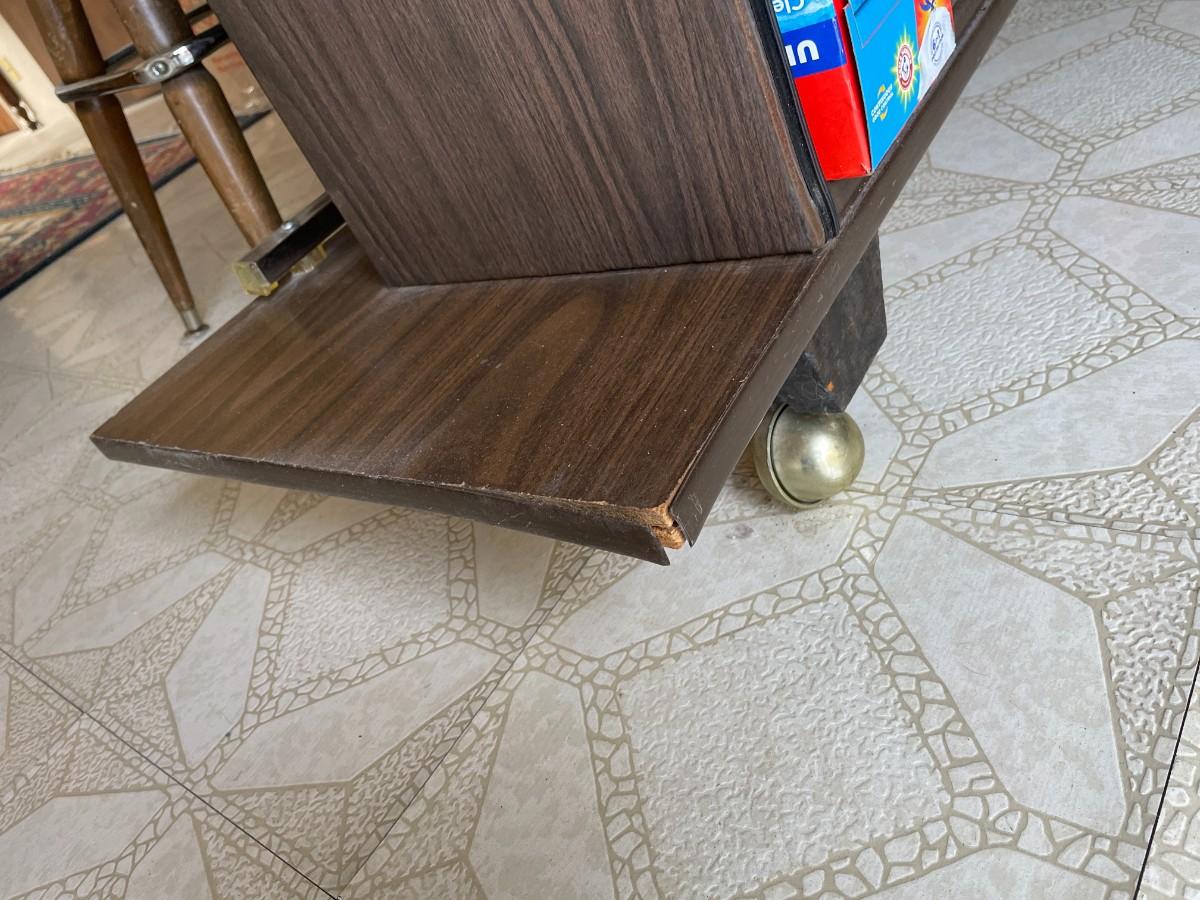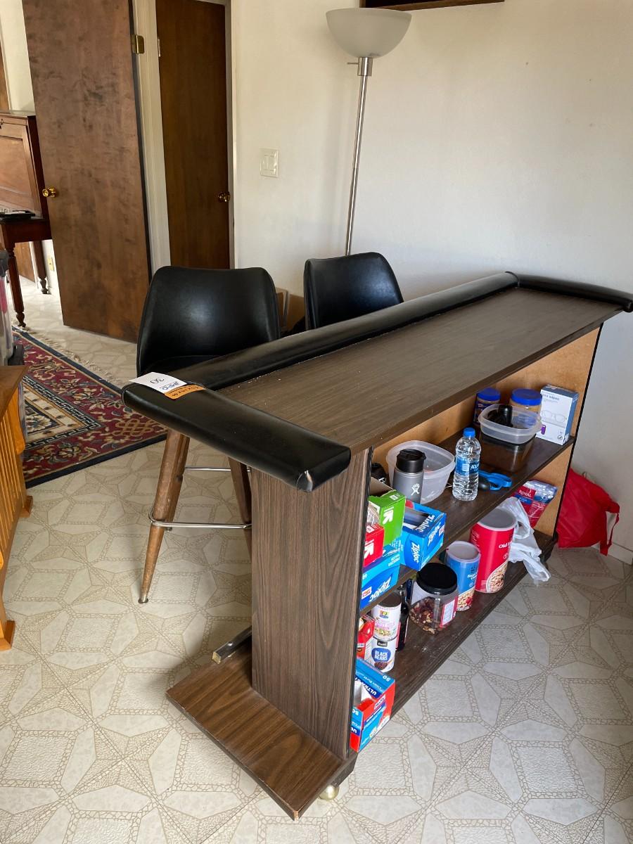 Vintage Bar on casters with shelves for bar supplies. Vinyl tufted padding on front, padded edge, laminated wood finish. Some damage - see photos. (Contents not included)