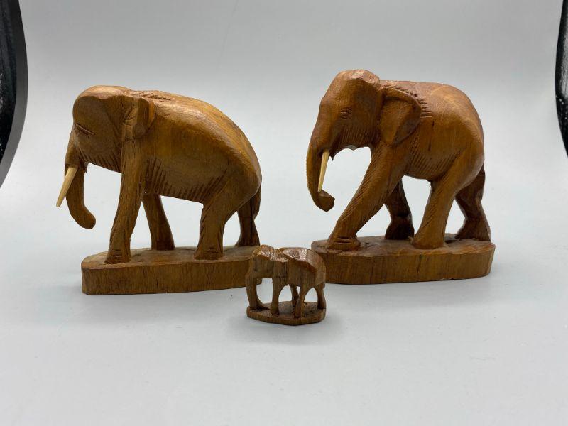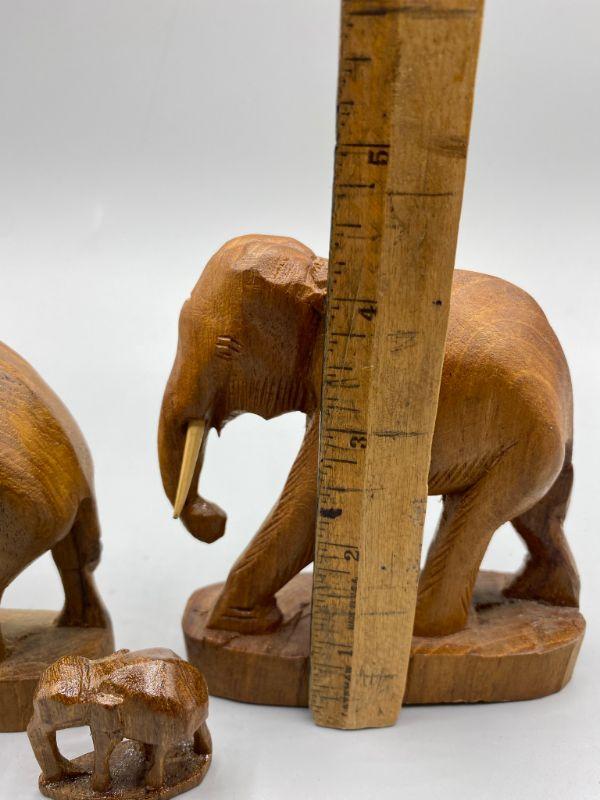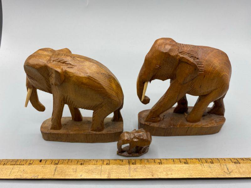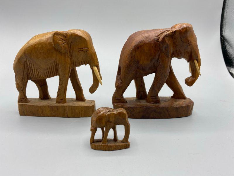 Retro carved wood elephant trio. The two larger are about the same size but different in carve and color. Lightweight wood. Display great. About 4.5" tall for the pair and 1.5" for the mini.