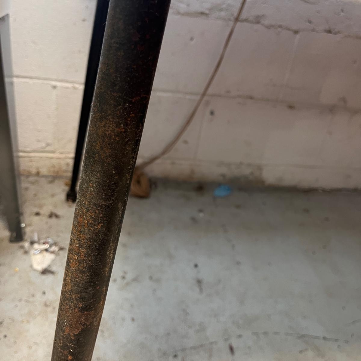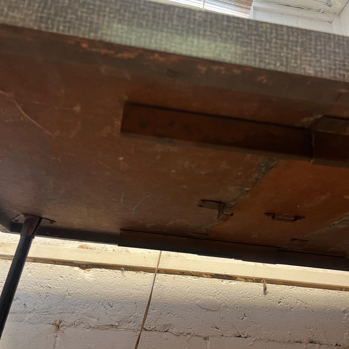 This retro table has a 8” leaf and measures 48” x 30” x 29”H with leaf in. Table has a Formica style finish with metal legs. Legs have surface rust and top of table has nicks and scratches, see pictures