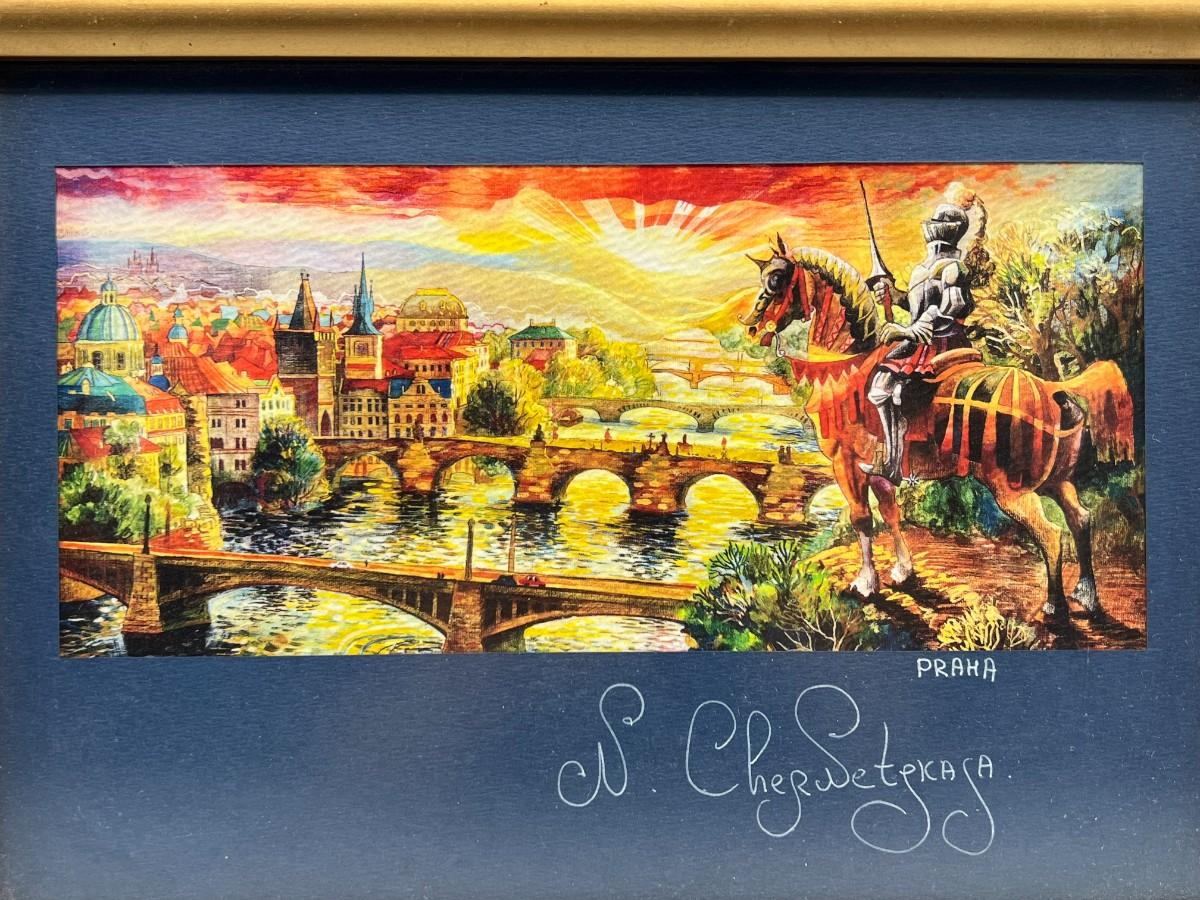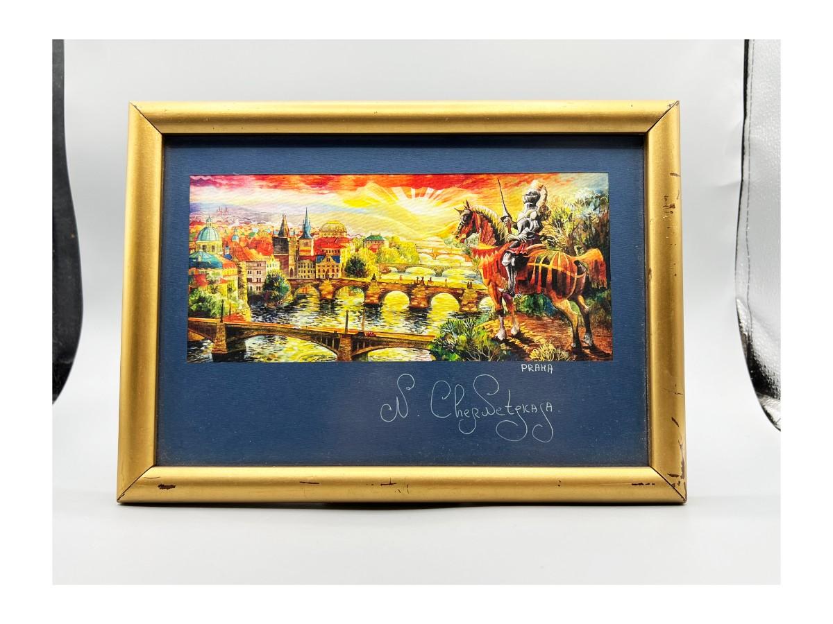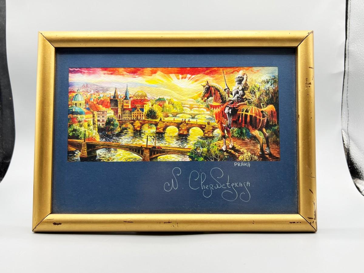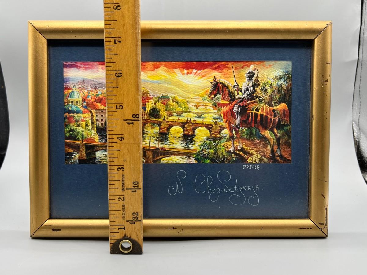 Retro Framed Artwork of Knight Looking Over the Czech Republic Prague Praha, there are no significant cracks or chips to the frame or protective glass and is in good displayable condition. Check pictures for more details and for sizing.