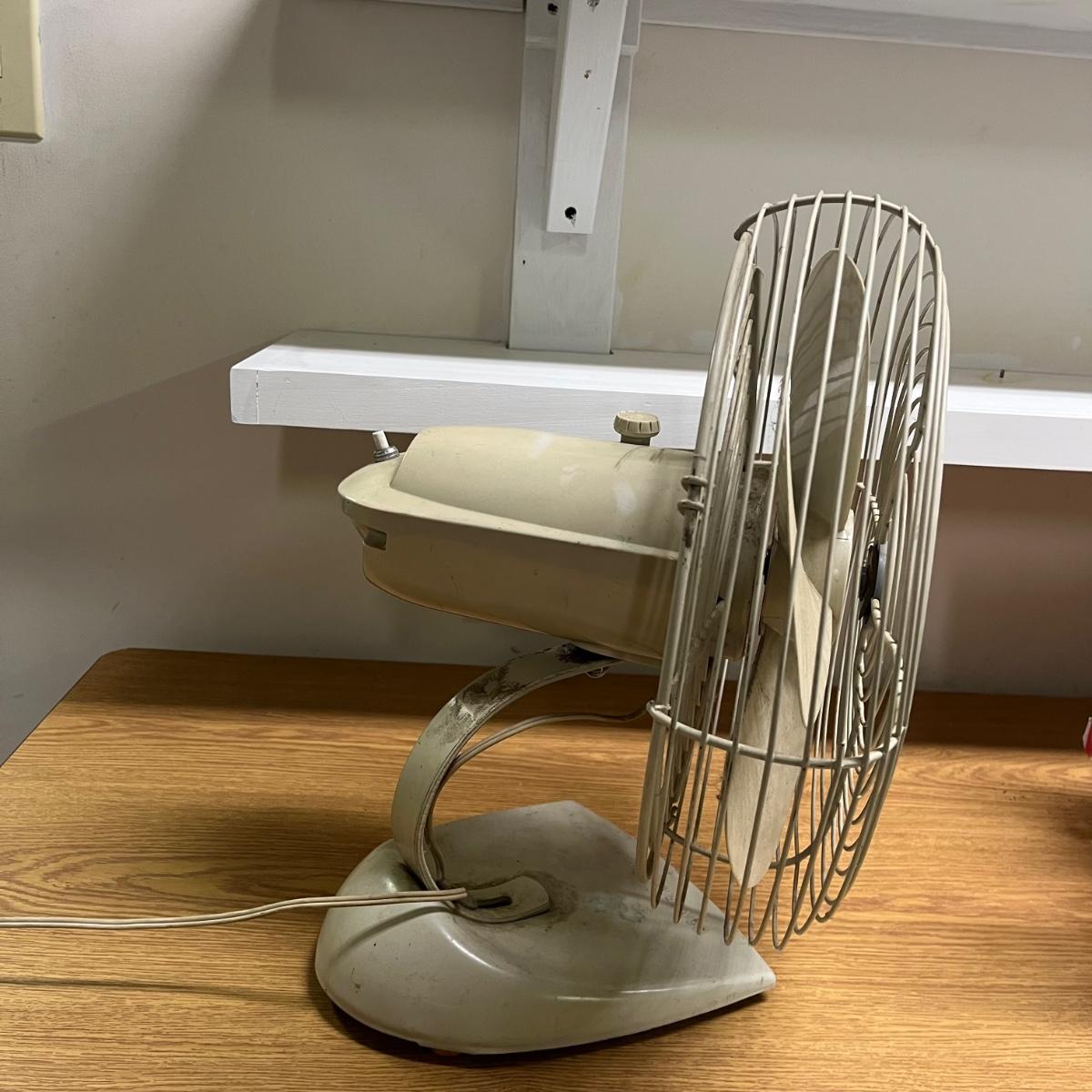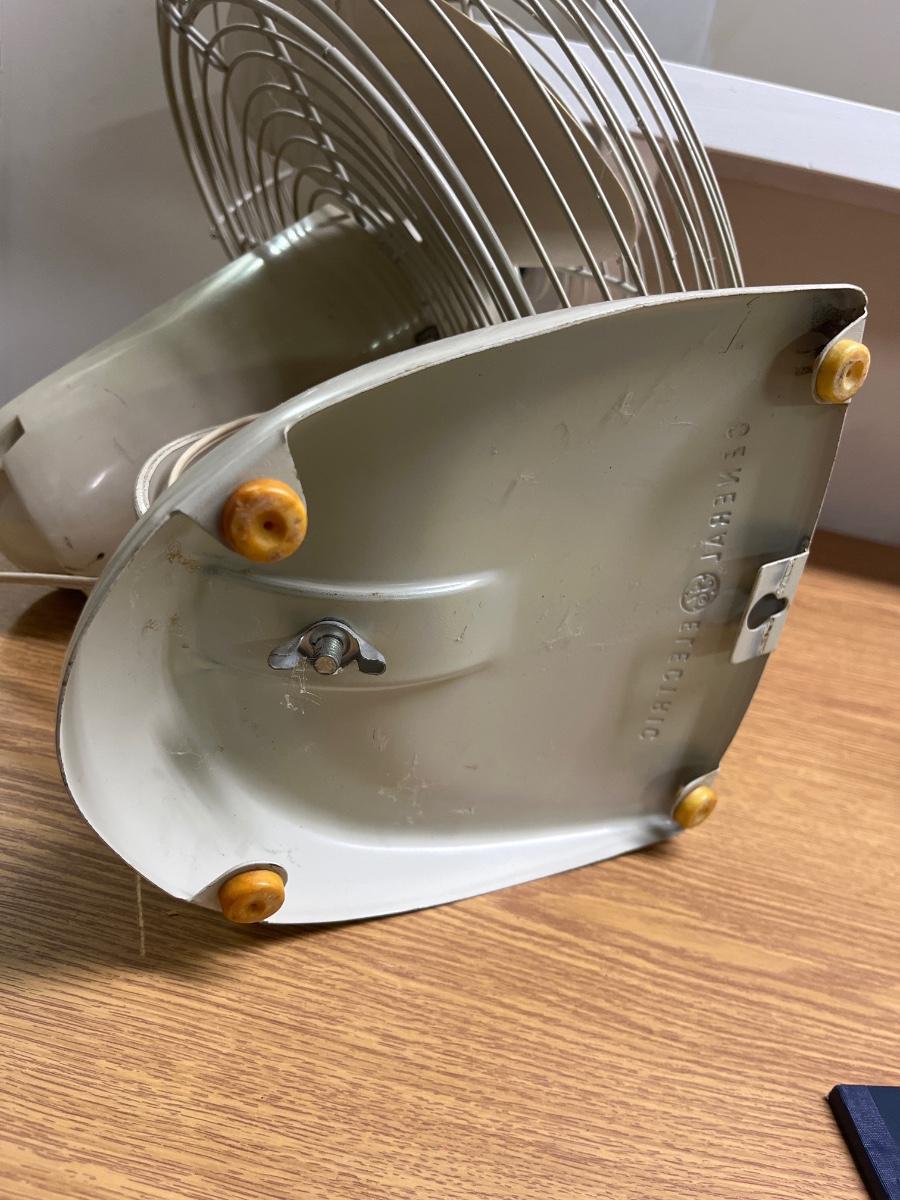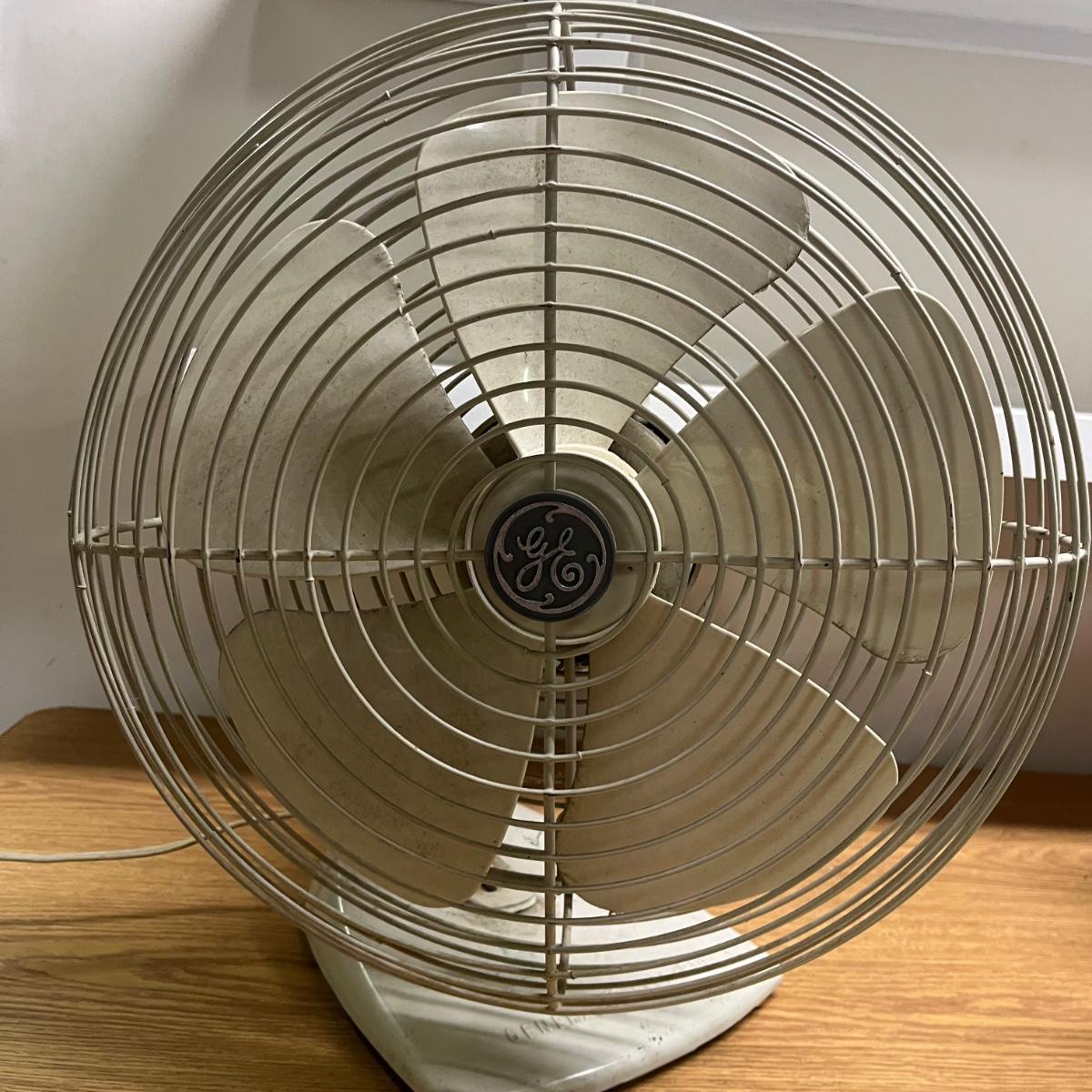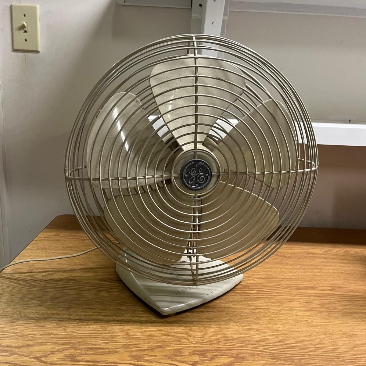 Lot includes a retro General Electric Metal oscillating fan with three speeds. Far powered on when plugged in. Fan measures 12” x 14” x 17”.
