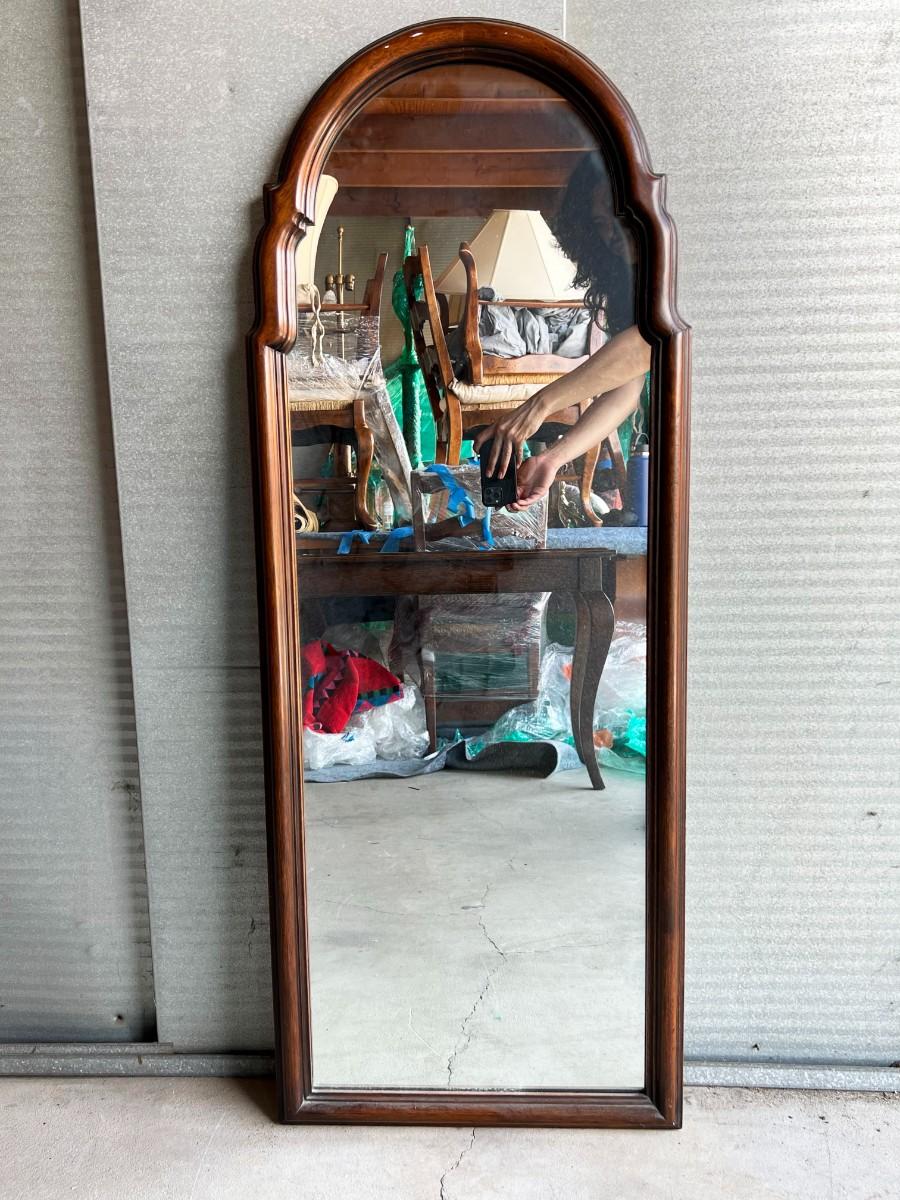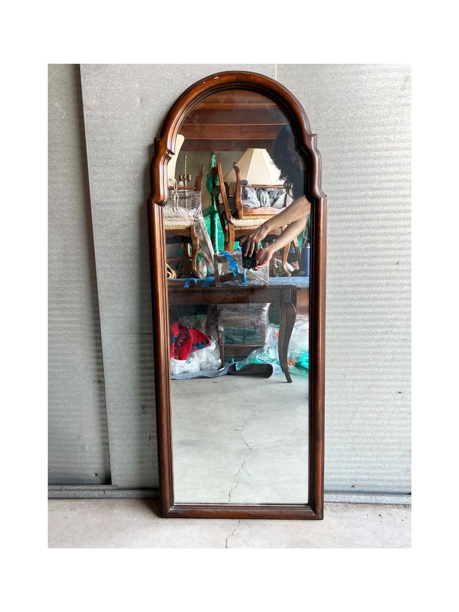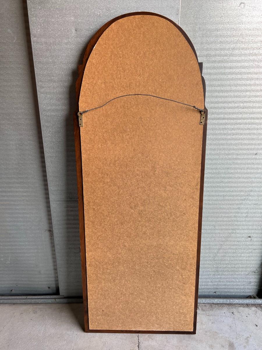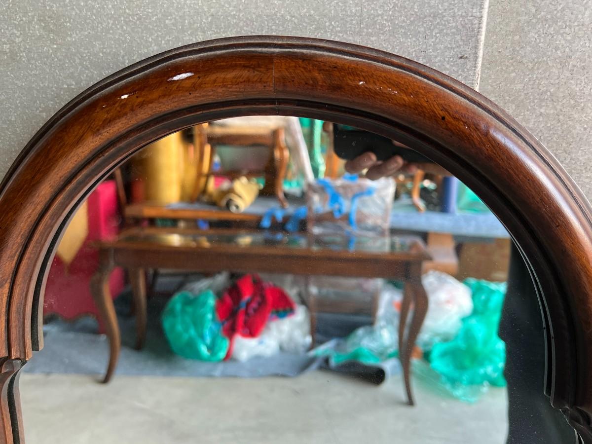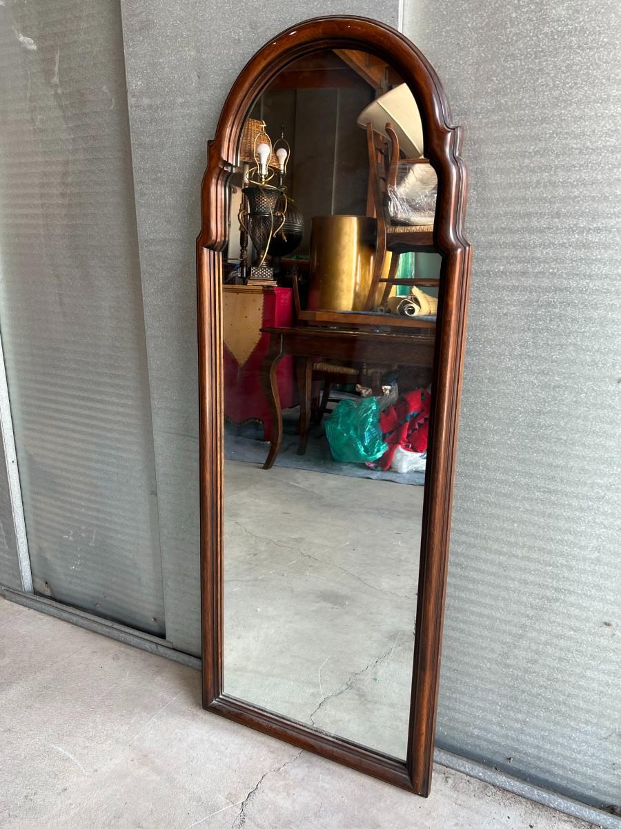 There is no significant damage to the mirror or the wood frame and is in good displayable condition. Check pictures for more details and for sizing.