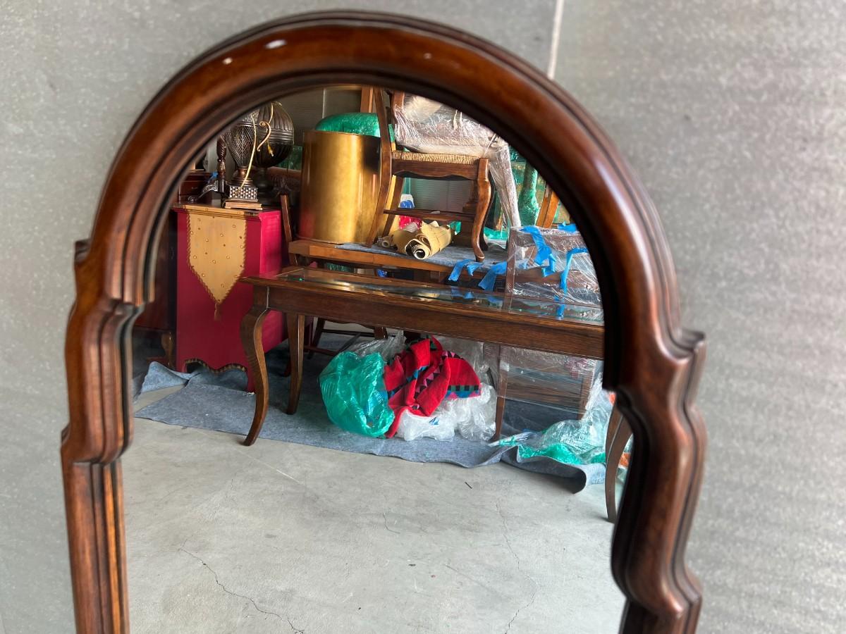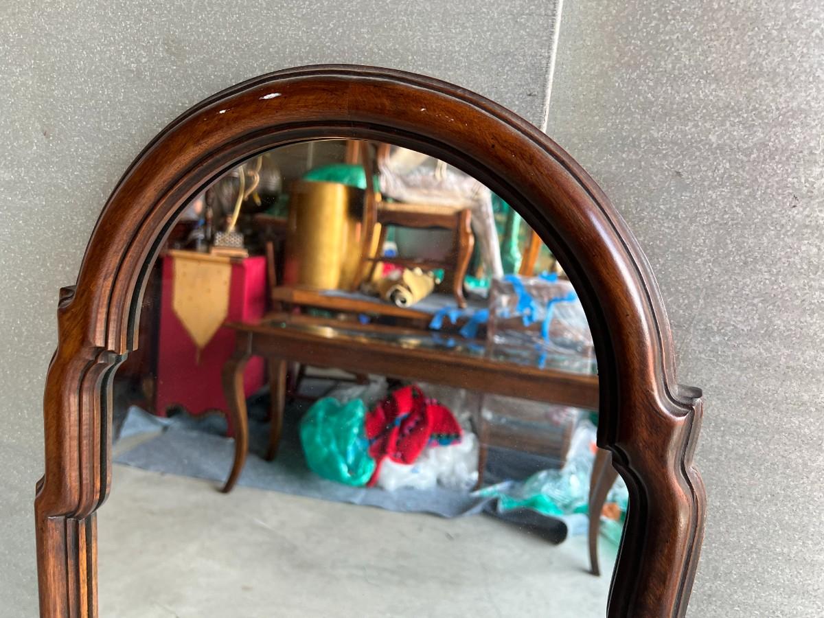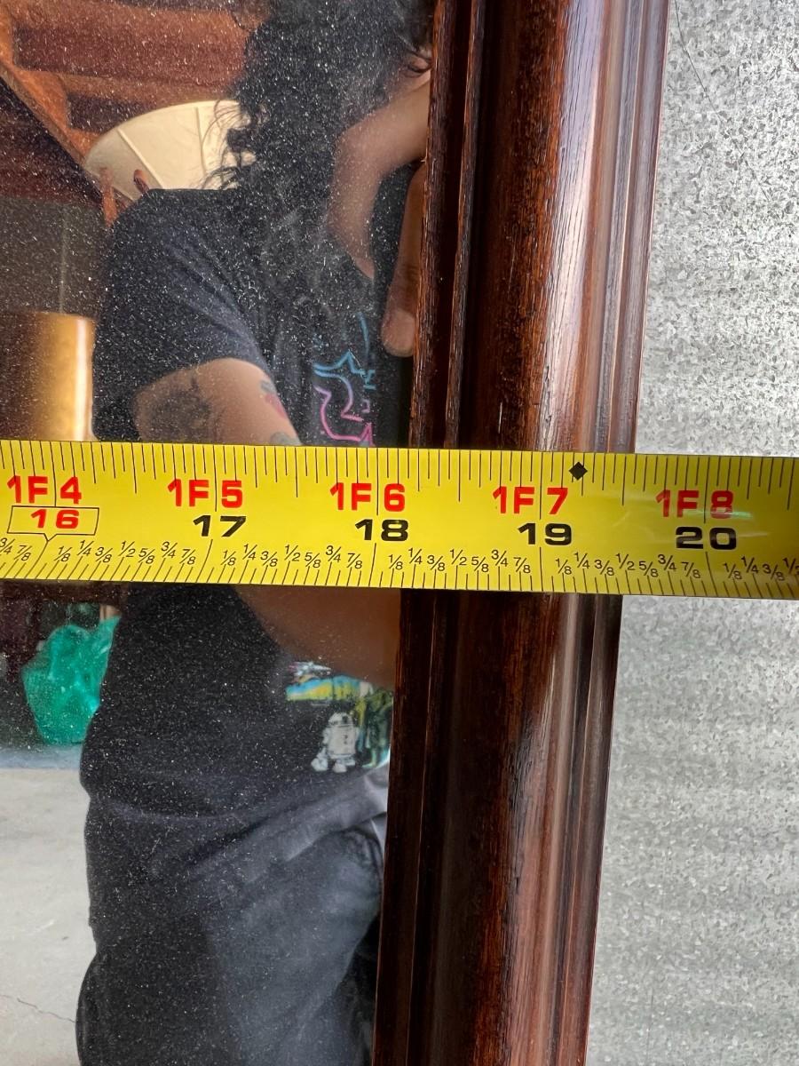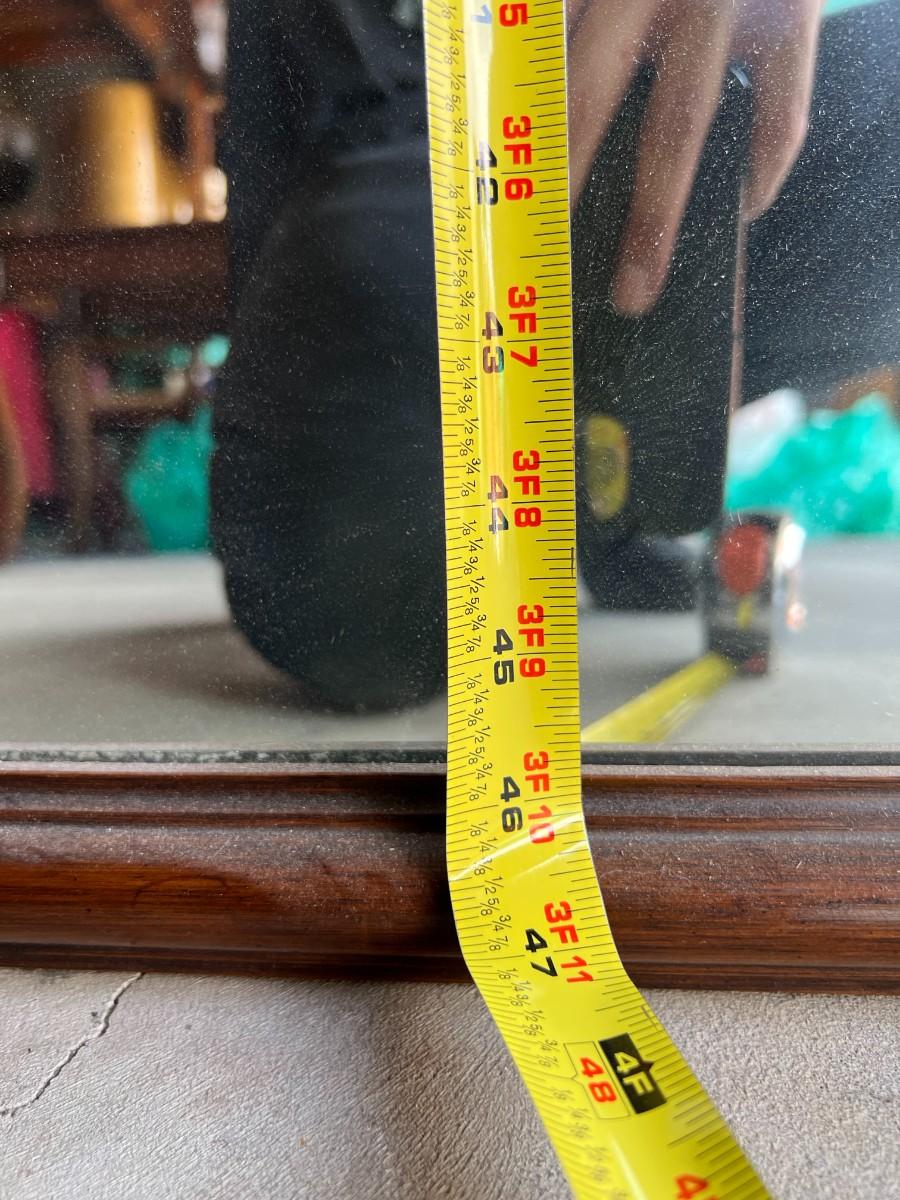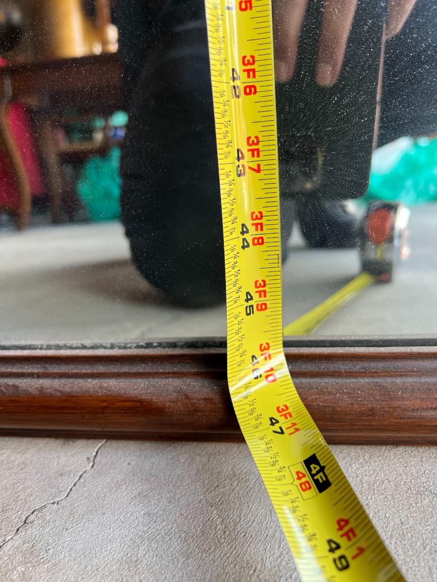 There is no significant damage to the mirror or the wood frame and is in good displayable condition. Check pictures for more details and for sizing.