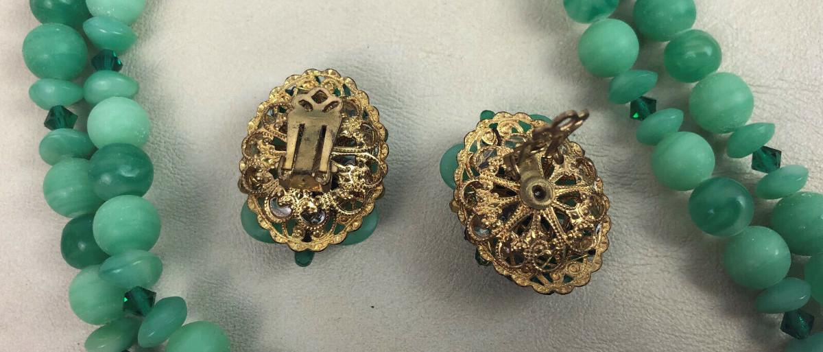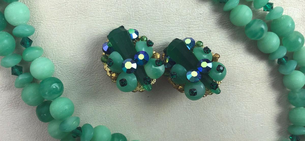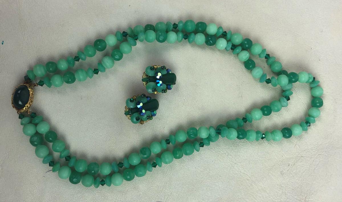 Double-strand necklace which I believe goes back to the sixties...Plastic and glass...Single strand 21"..Double 9 3/4"...Good condition...Made in Japan...Matching clip-on earrings..some tarnish on interior metal.