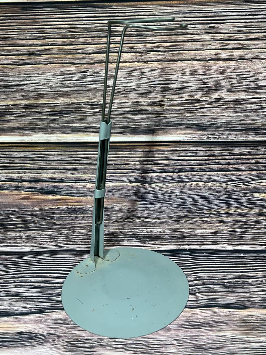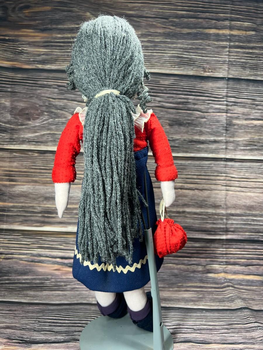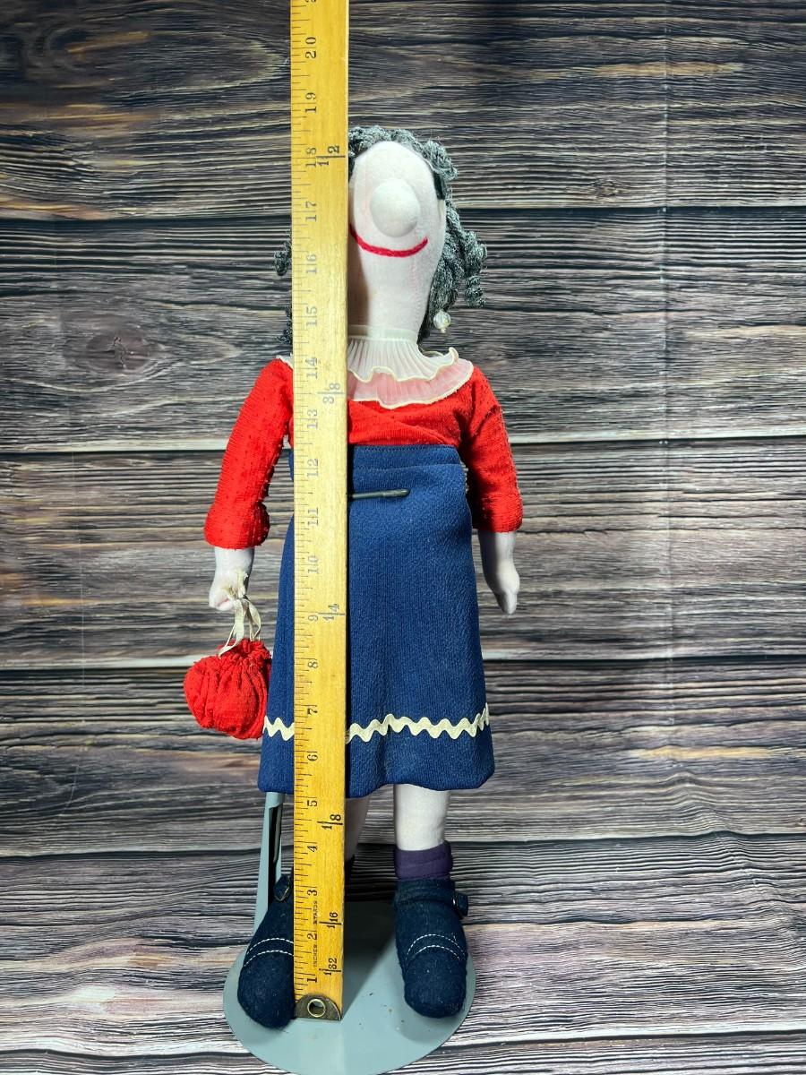 Retro Handmade Children Doll with Metal Display Stand, there is some light wear to the doll and the stand, but there is no signifncant damage and is in good collectible condition. Check pictures for more details and for sizing.