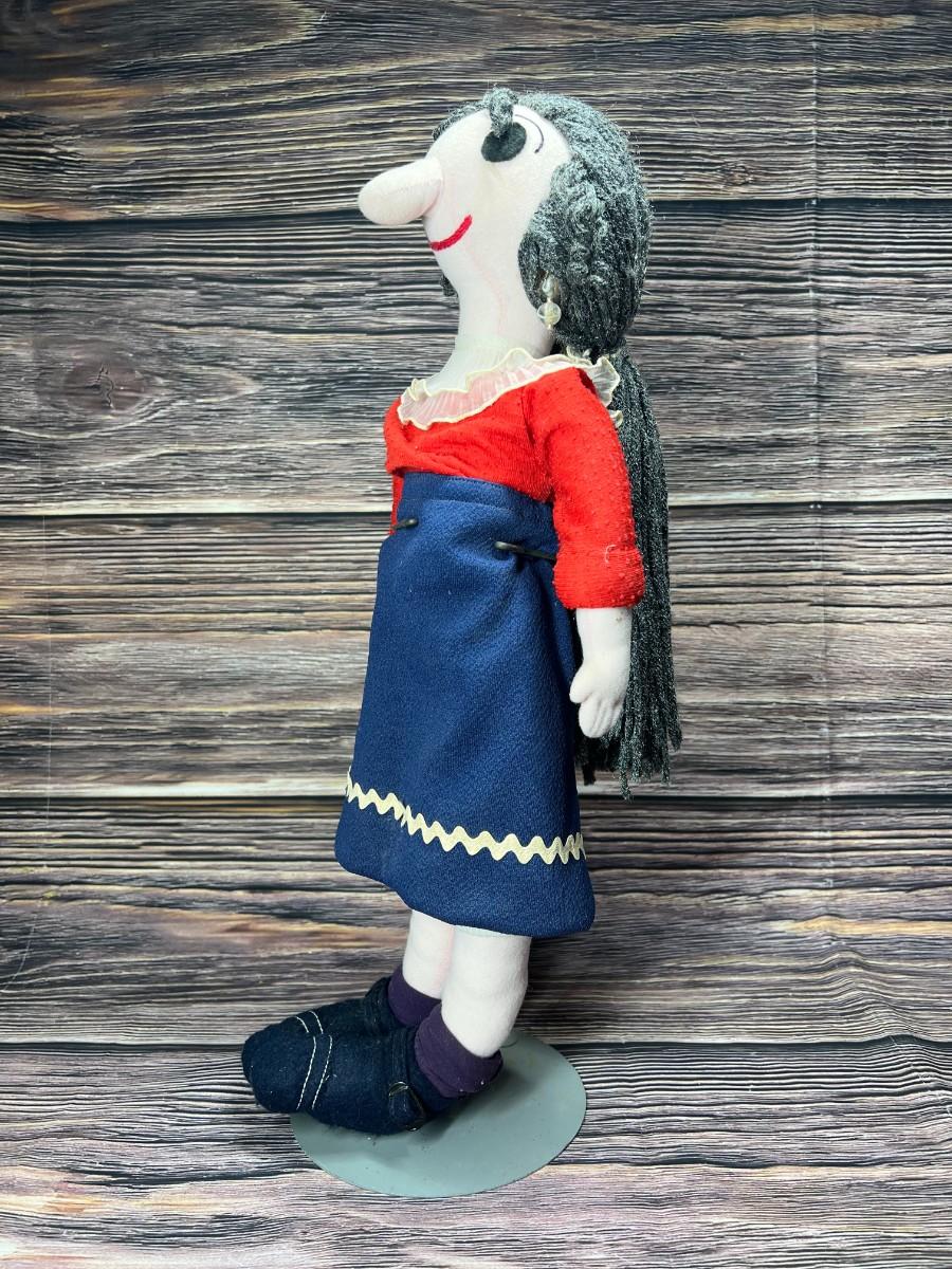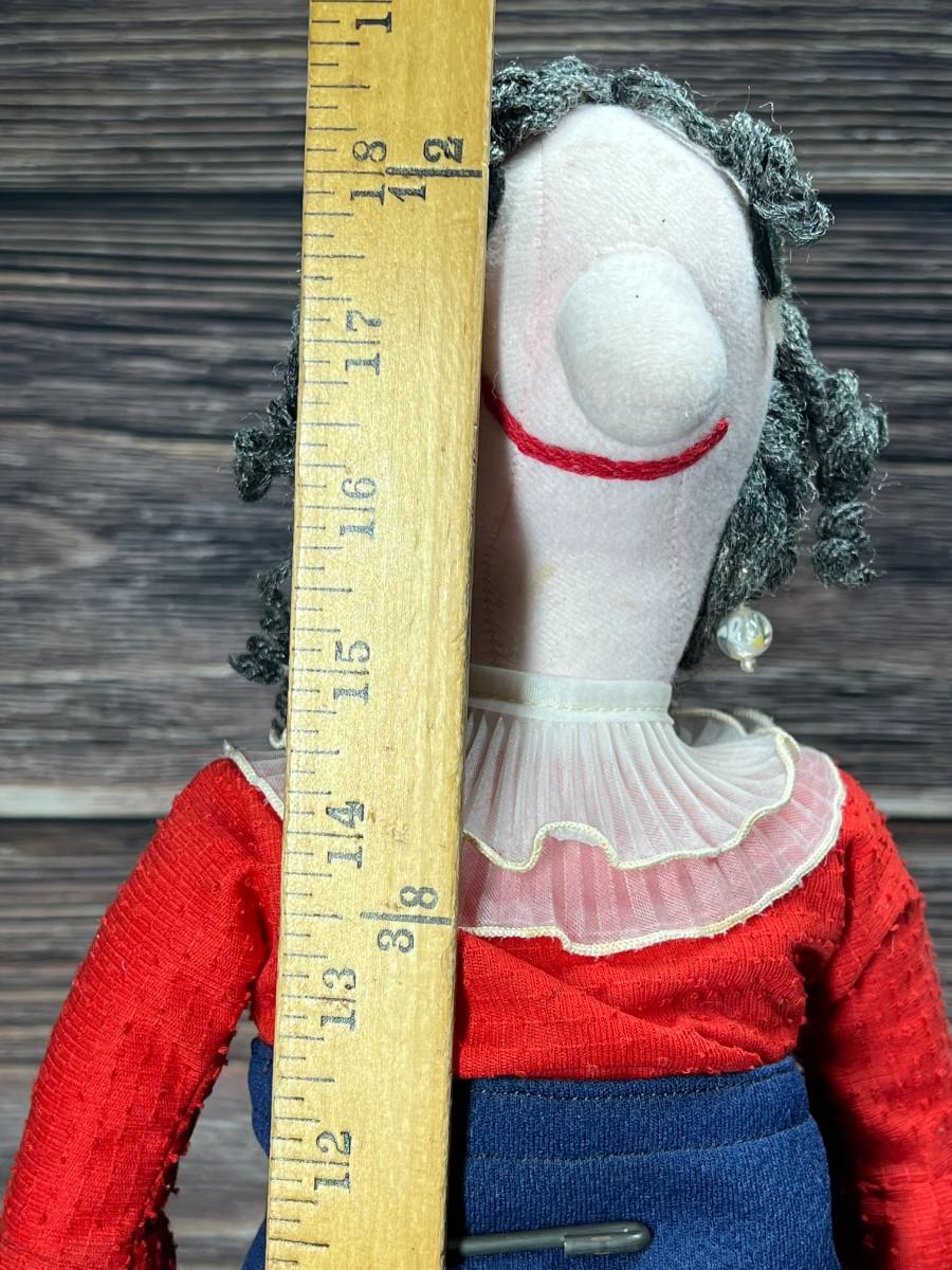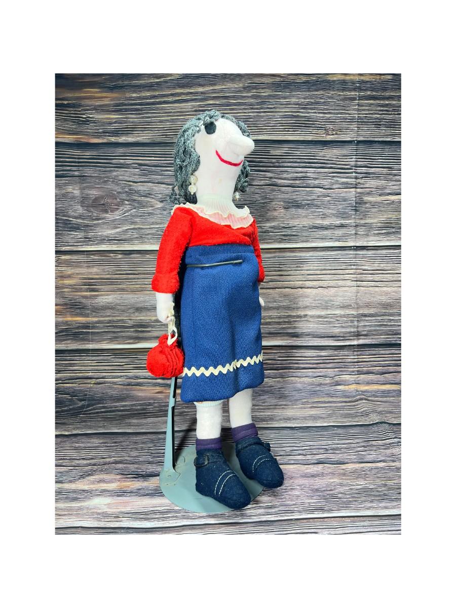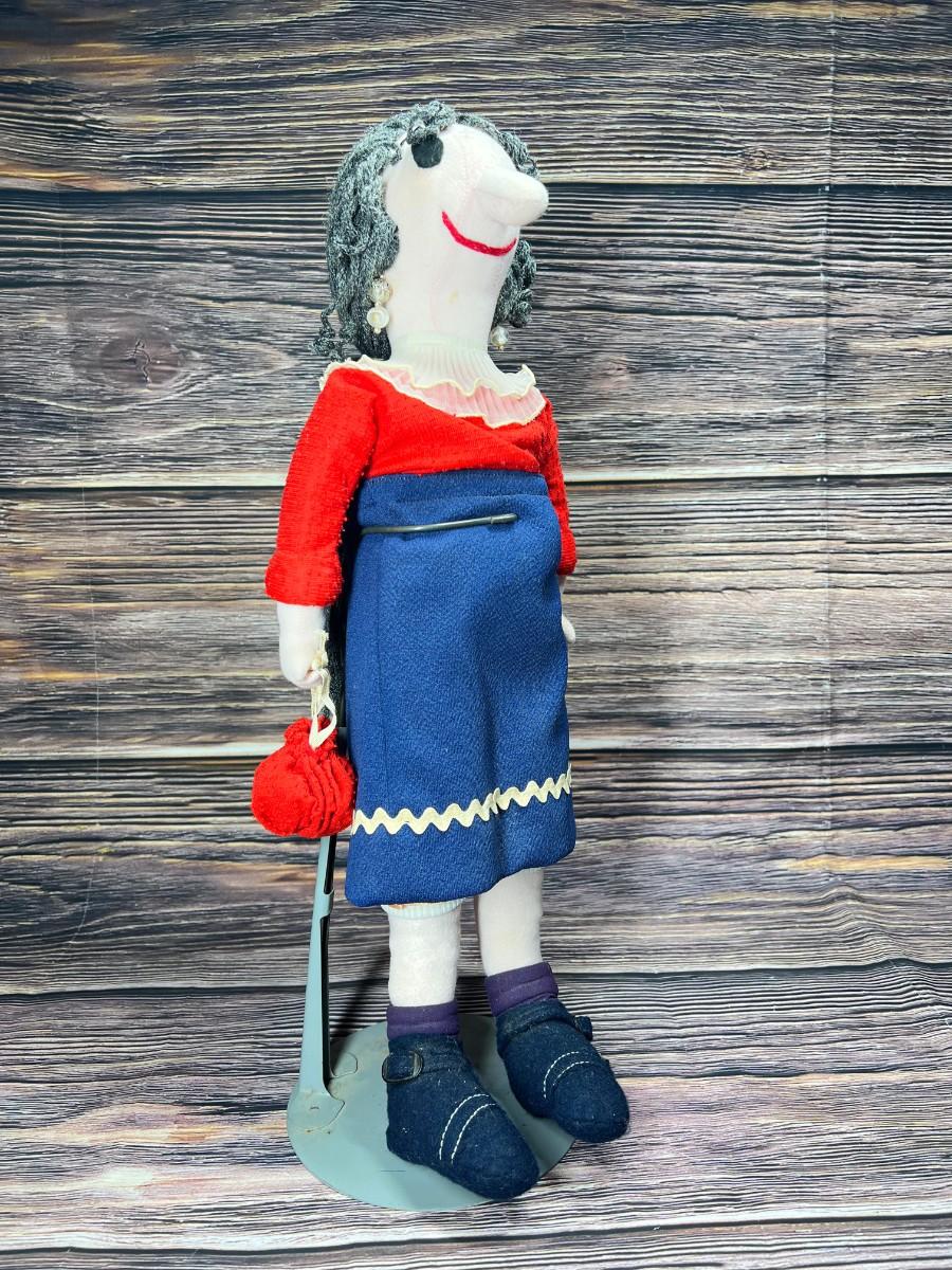 Retro Handmade Children Doll with Metal Display Stand, there is some light wear to the doll and the stand, but there is no signifncant damage and is in good collectible condition. Check pictures for more details and for sizing.