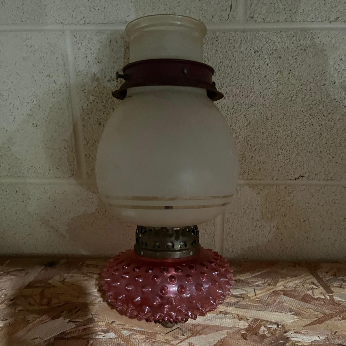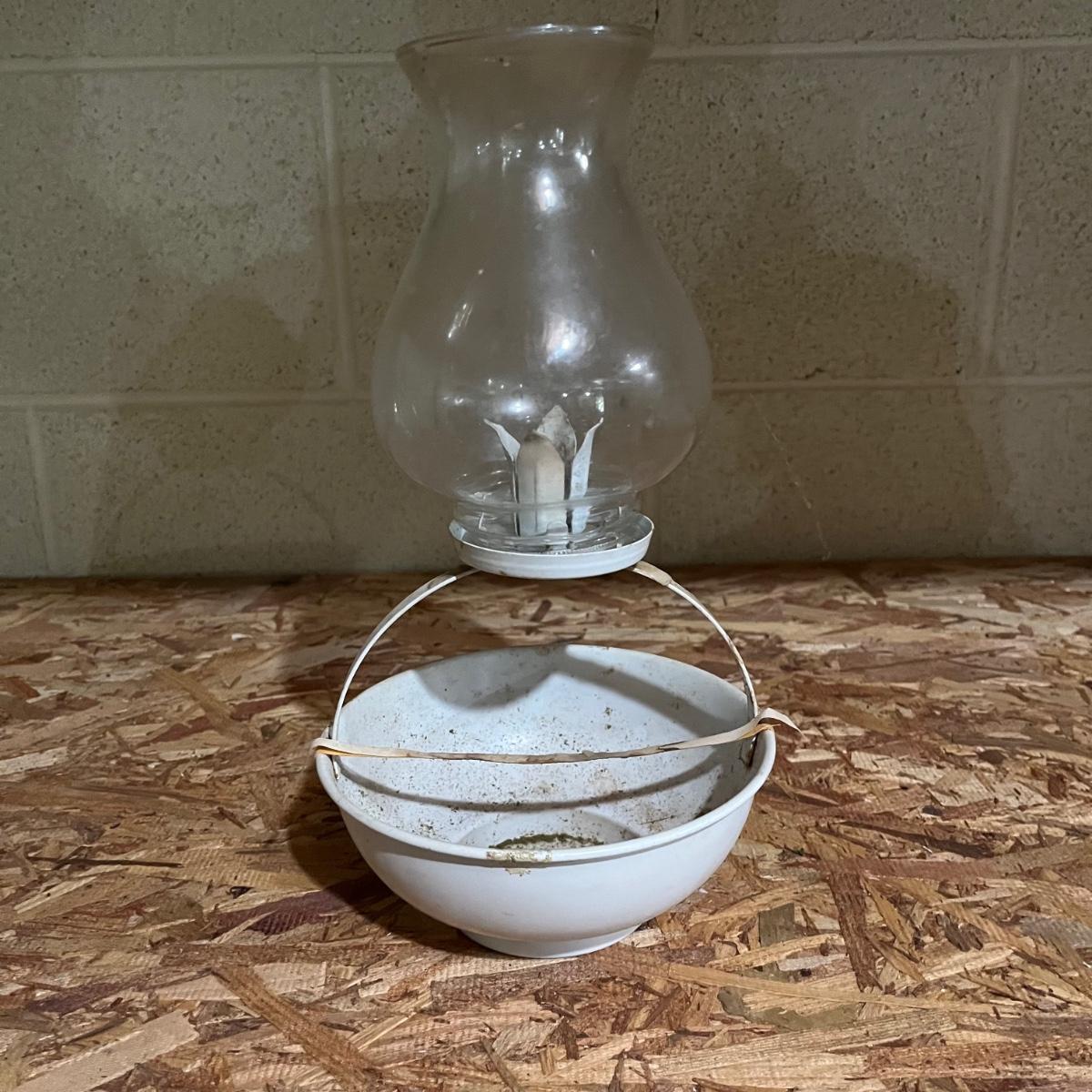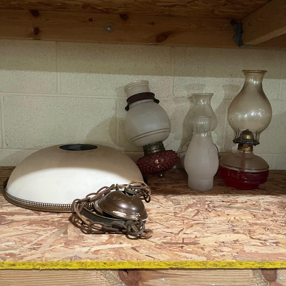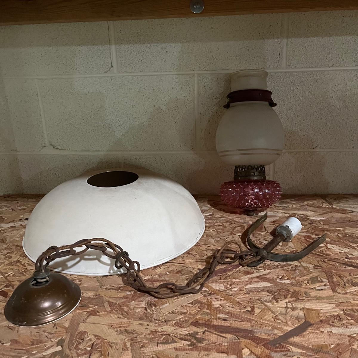 Lot includes a retro hanging lamp with a unique spiked glass body, an oil lamp, and a candleholder. Hanging lamp measures 16” D x 16” tall not including chain. Lamp was not tested.