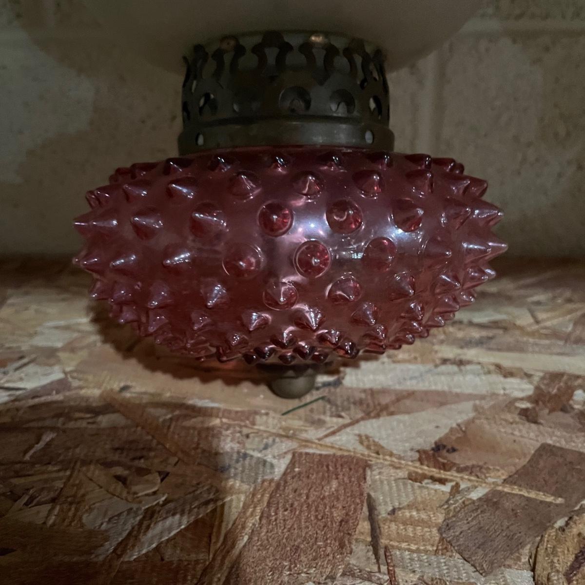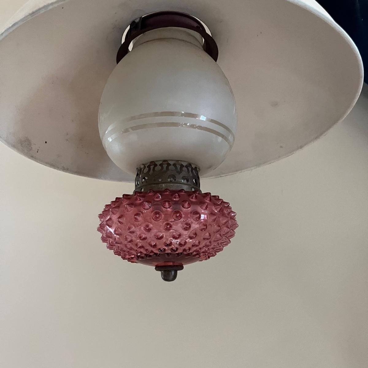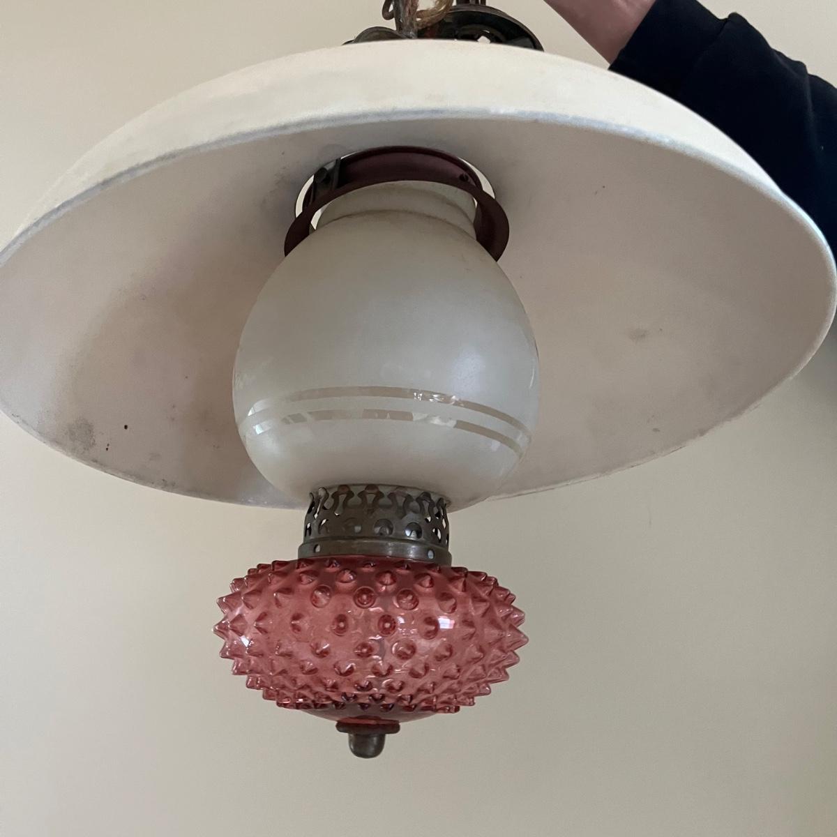Lot includes a retro hanging lamp with a unique spiked glass body, an oil lamp, and a candleholder. Hanging lamp measures 16” D x 16” tall not including chain. Lamp was not tested.