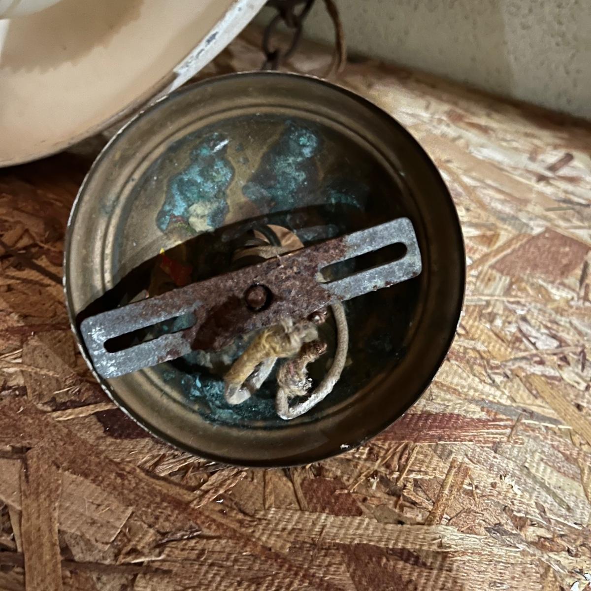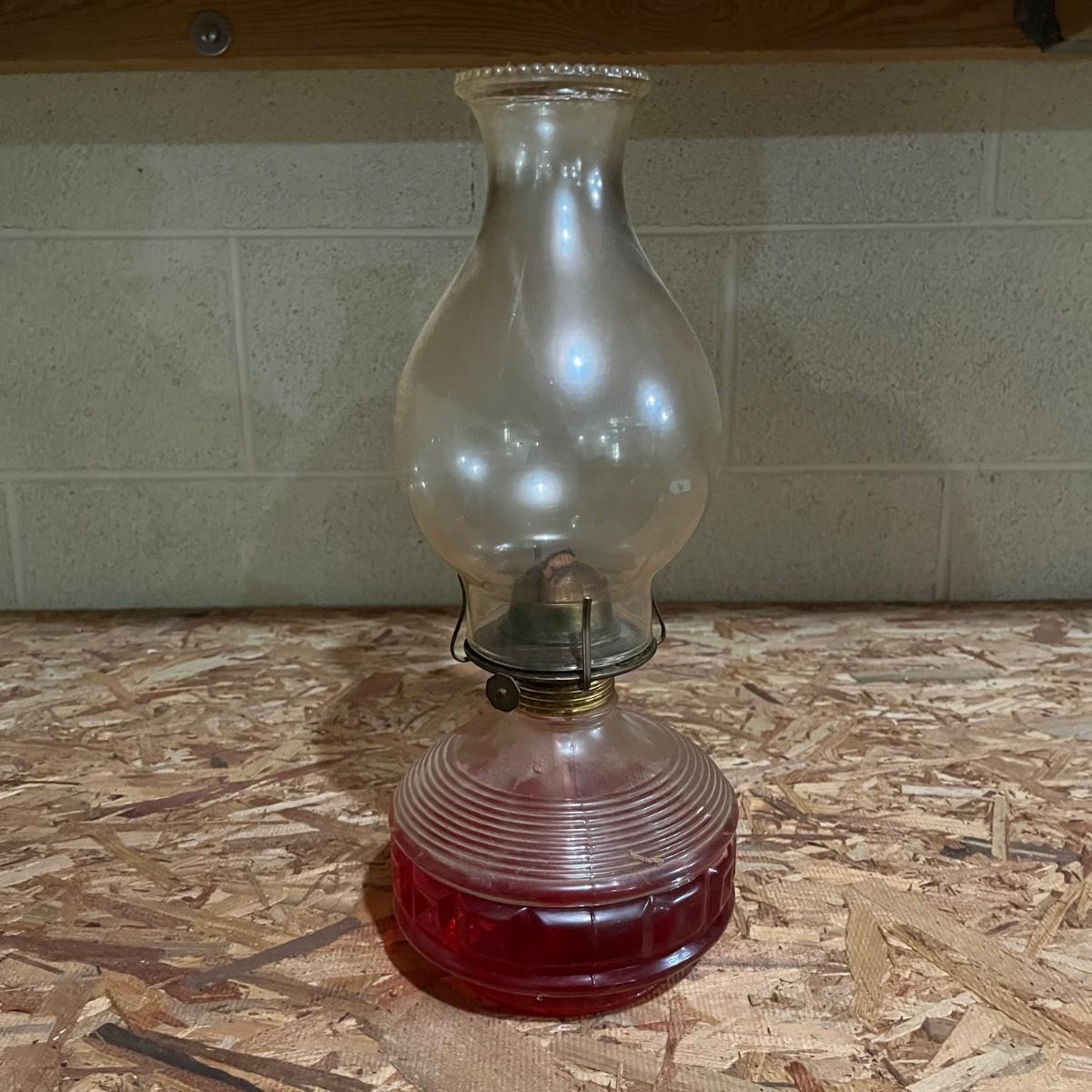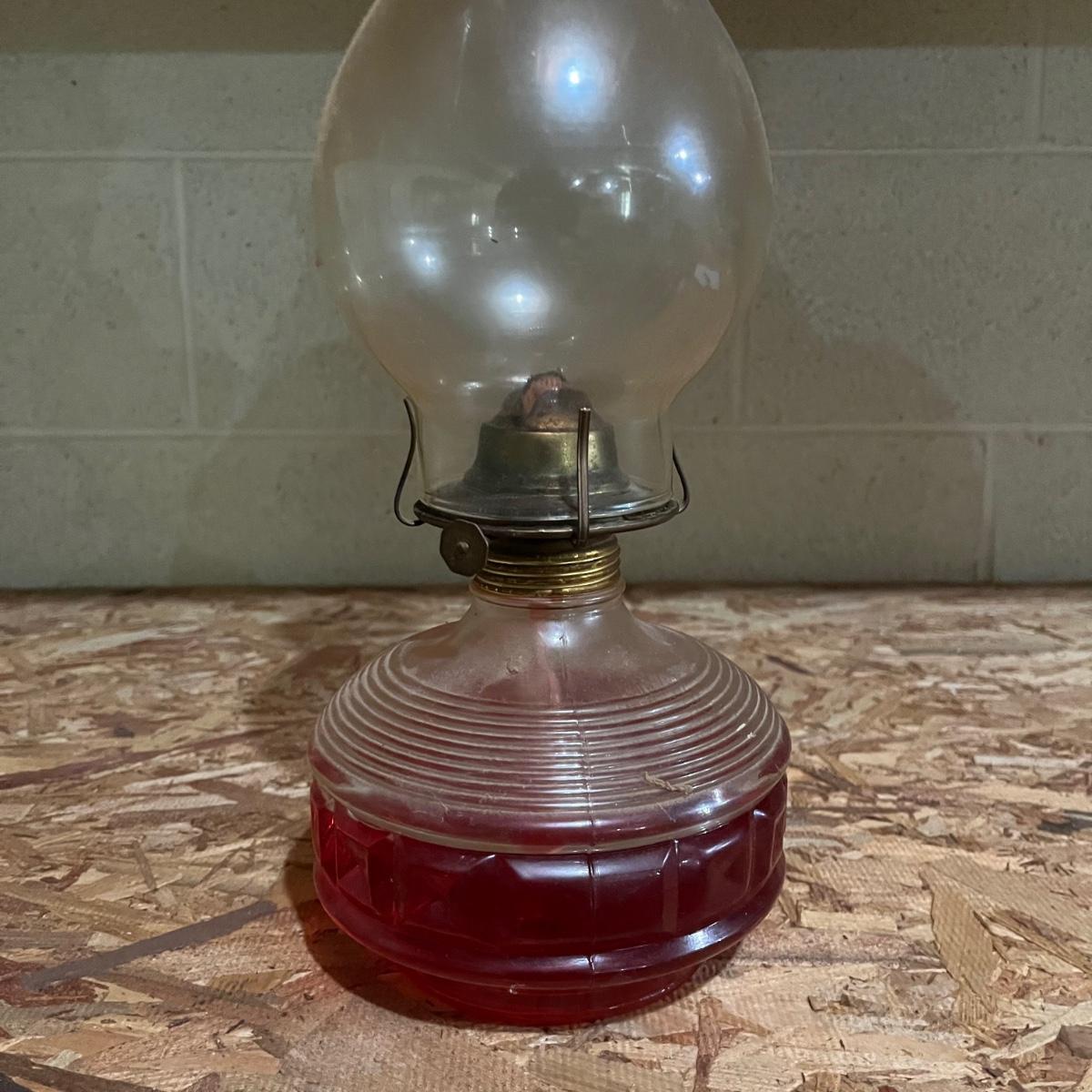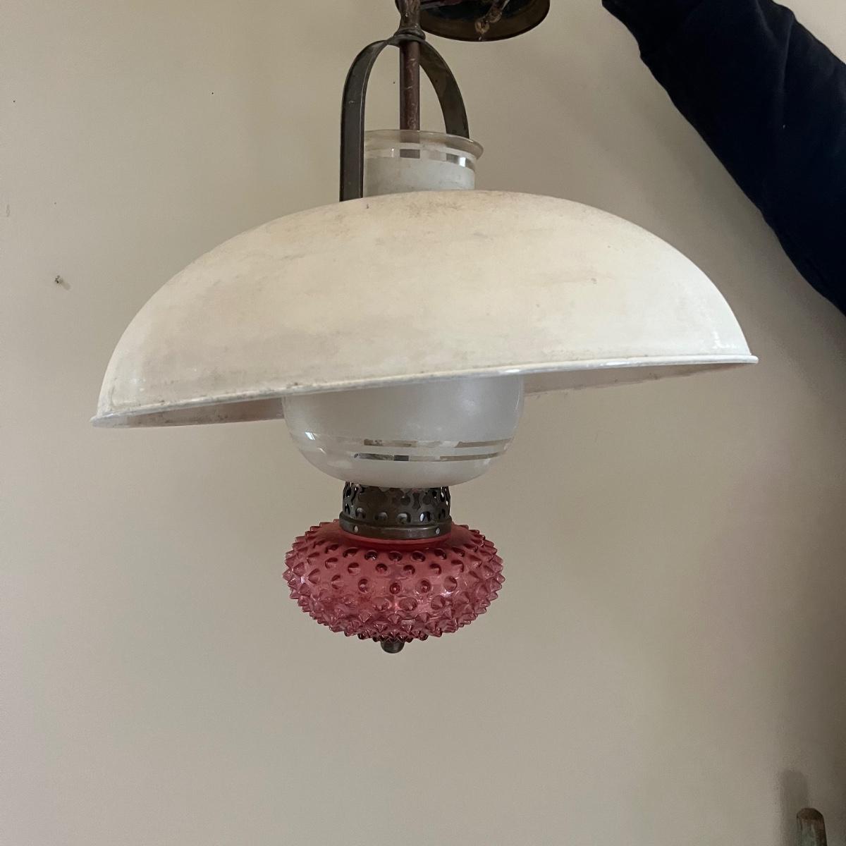 Lot includes a retro hanging lamp with a unique spiked glass body, an oil lamp, and a candleholder. Hanging lamp measures 16” D x 16” tall not including chain. Lamp was not tested.