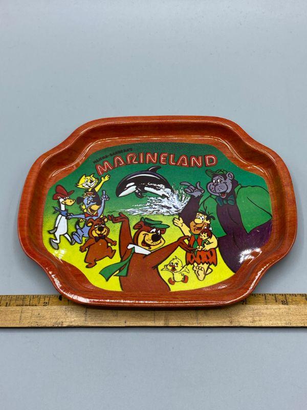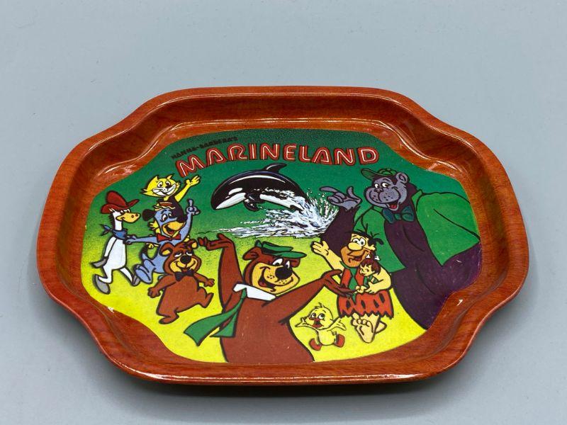 In the late 70s to early 80s Marineland was known as Hanna-Barbera's Marineland. This practically mint metal tray is a flaskback souvenir. Small, only 7" size. Great for display or as a trinket dish. Features some of Hanna-Barbera's greatest cartoon characters and what made Marineland so special, a killer whale.