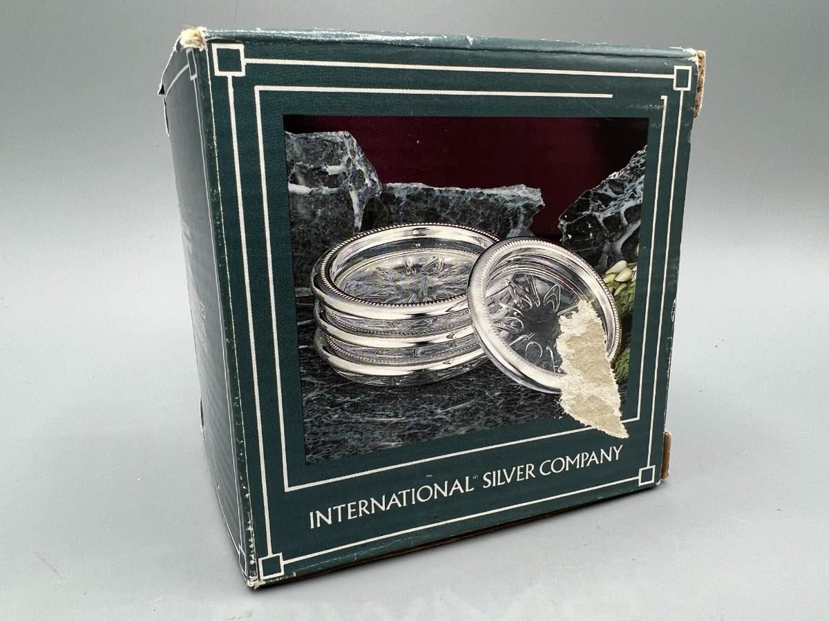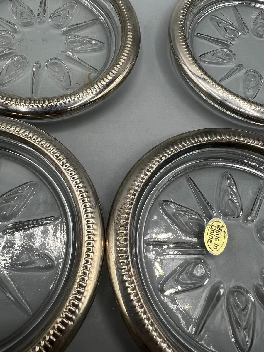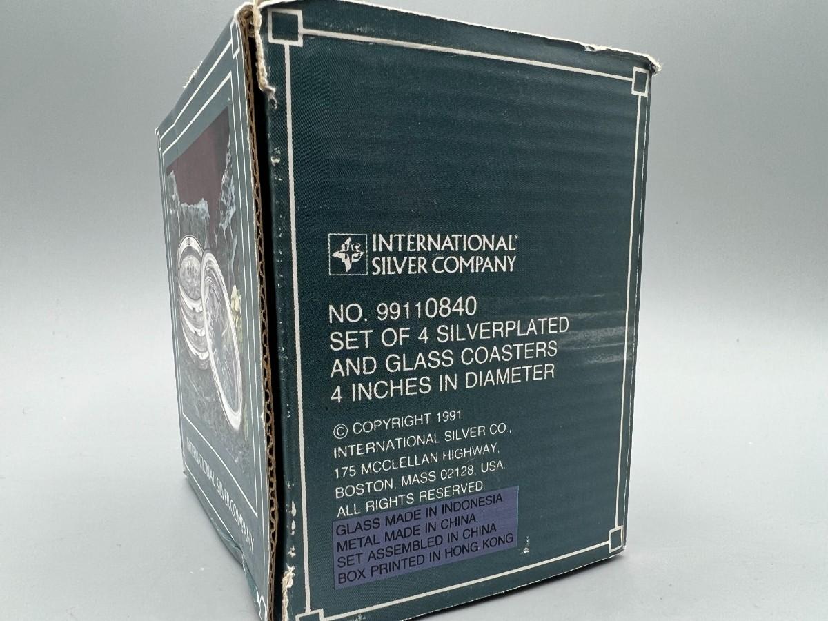 Retro International Silver Company Set of 4 Silver Plated Glass Coasters, there is no significant damage to the coasters and is in good useable condition. Comes with original box, check pictures for more details and for sizing.