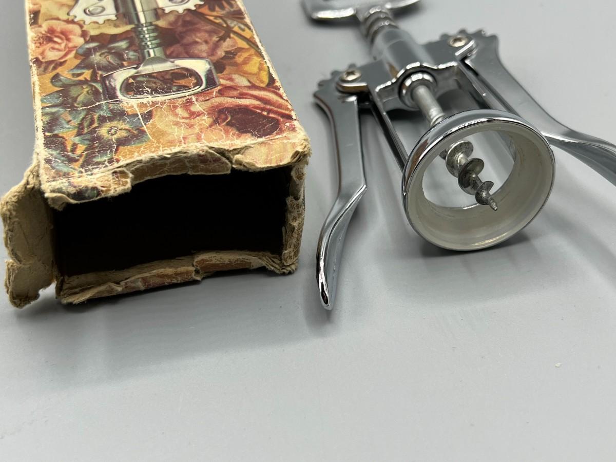 Retro Italian Kitchenware Wine Vino Cork Bottle Opener with Original Box, there is some ripping to the box, but there is no damage to the opener and is in good usable condition. Check pictures for more details and for sizing.