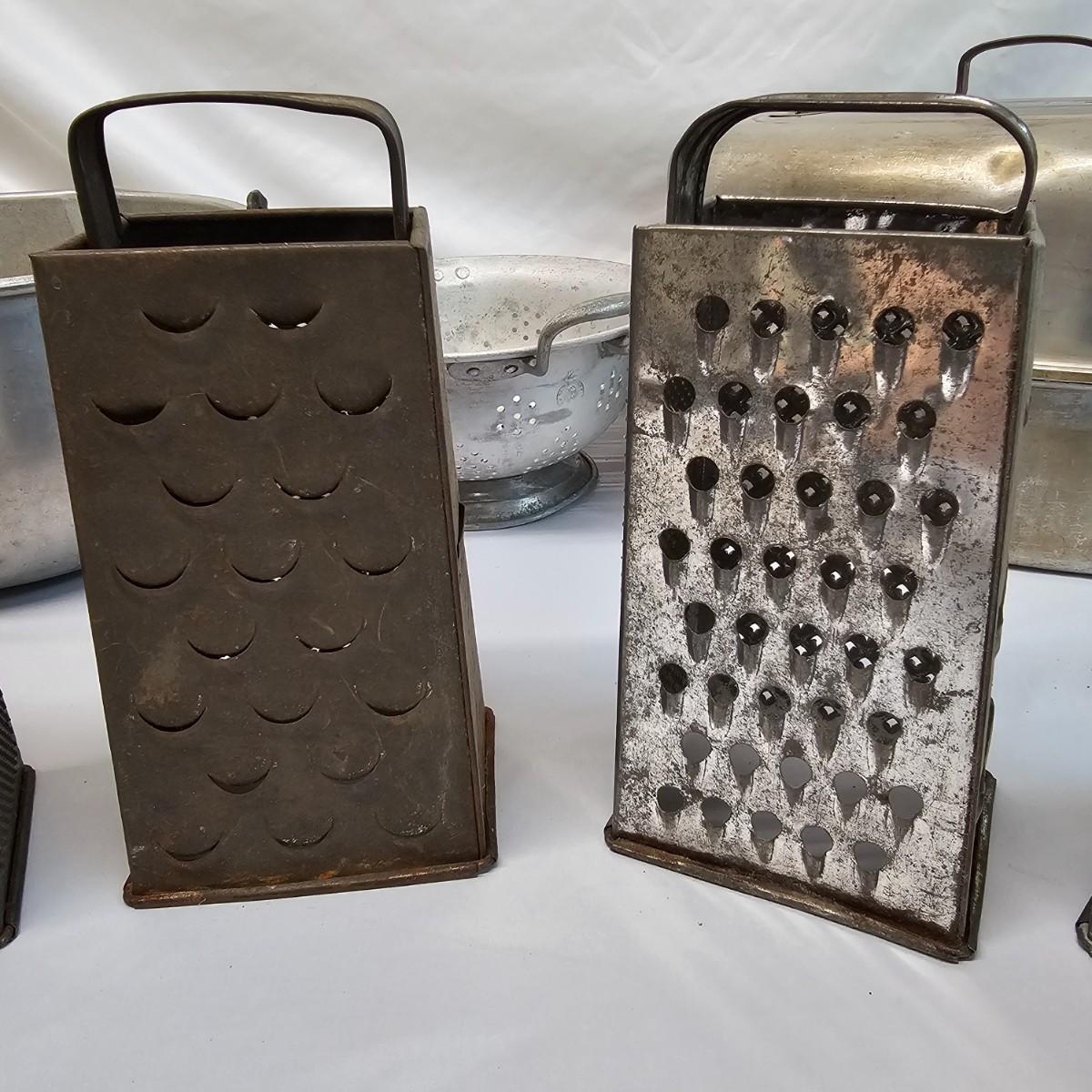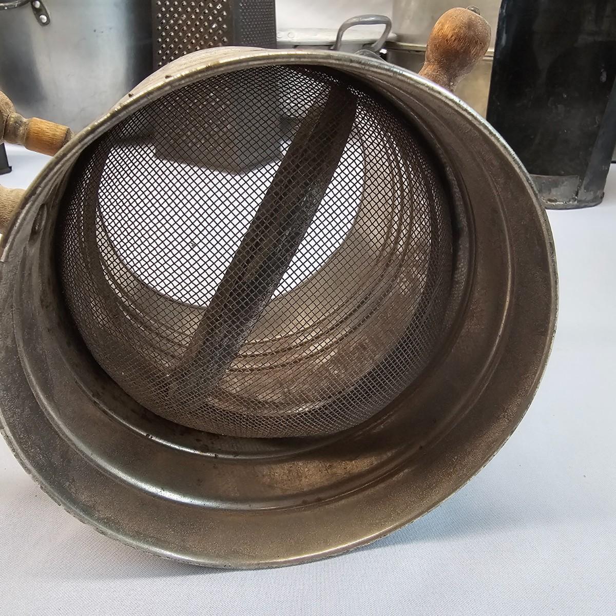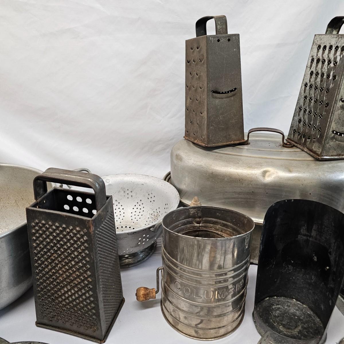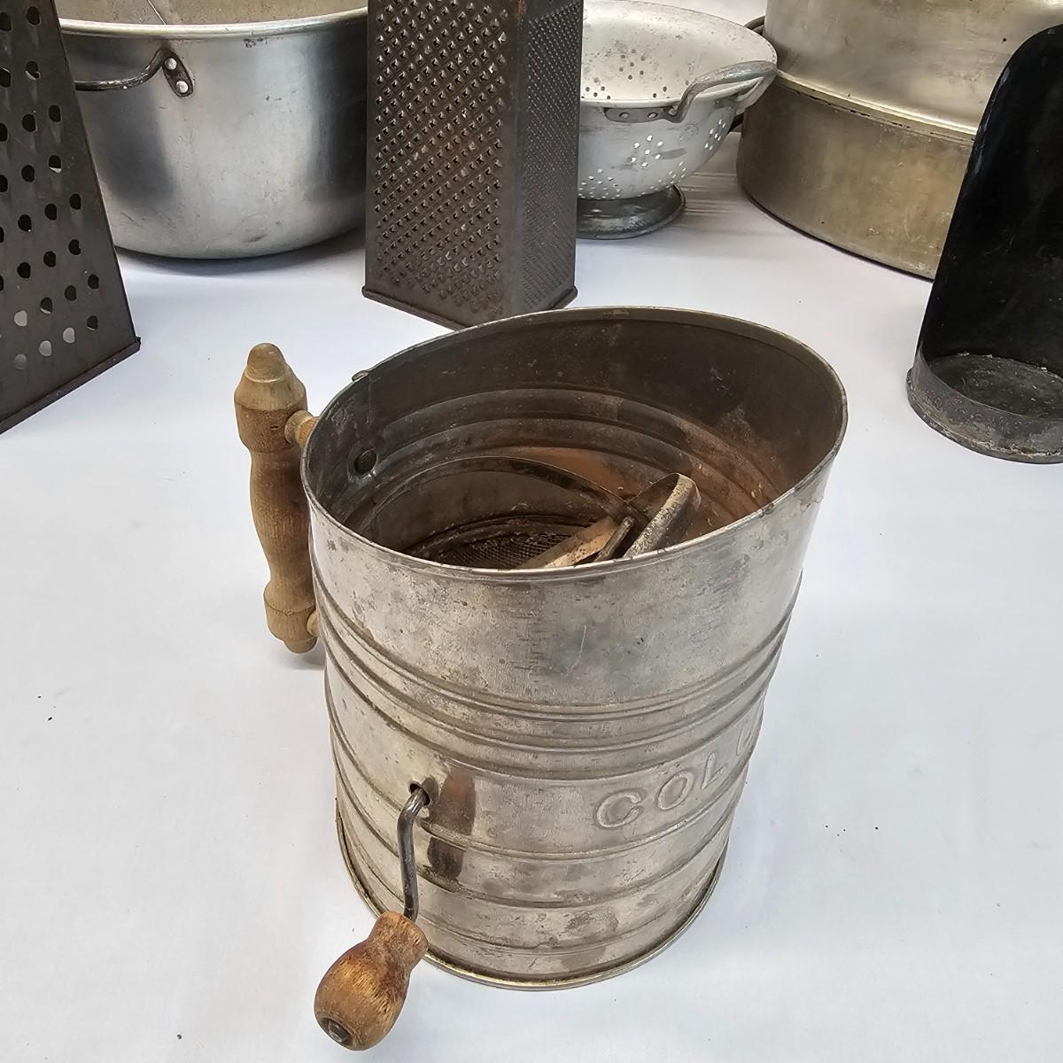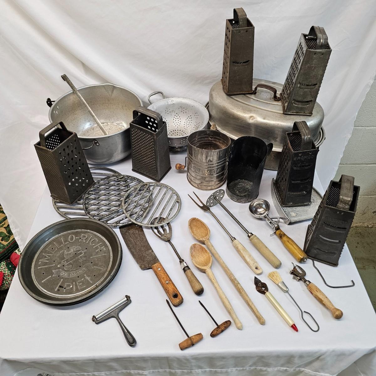 Roaster, collander, spoons, fork, graters and more make up this unique collection of kitchen Items. Rotary style sifter, swing bar ice cream scoop, pie tins and more. Roaster pan by Mirro, has lift out tray and measures 15.5" x 10" x 8.5"H. Large bowl with handle is 11.5"D x 6"H. Graters average 3.5" x 4.5" x 8.5"H. Mrs. Smith's pie tins are 9.5"D, and longest wooden spoon is 13". Items show signs of age and use. See photos for details. Shipping available.