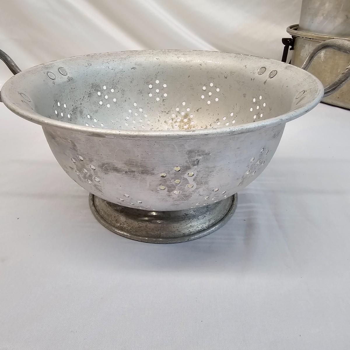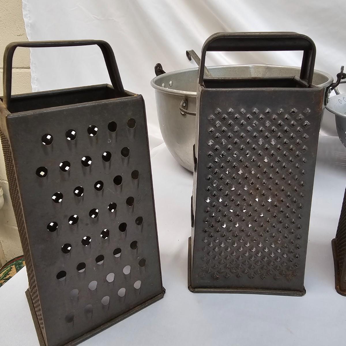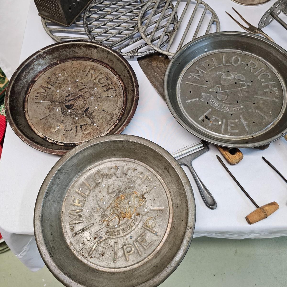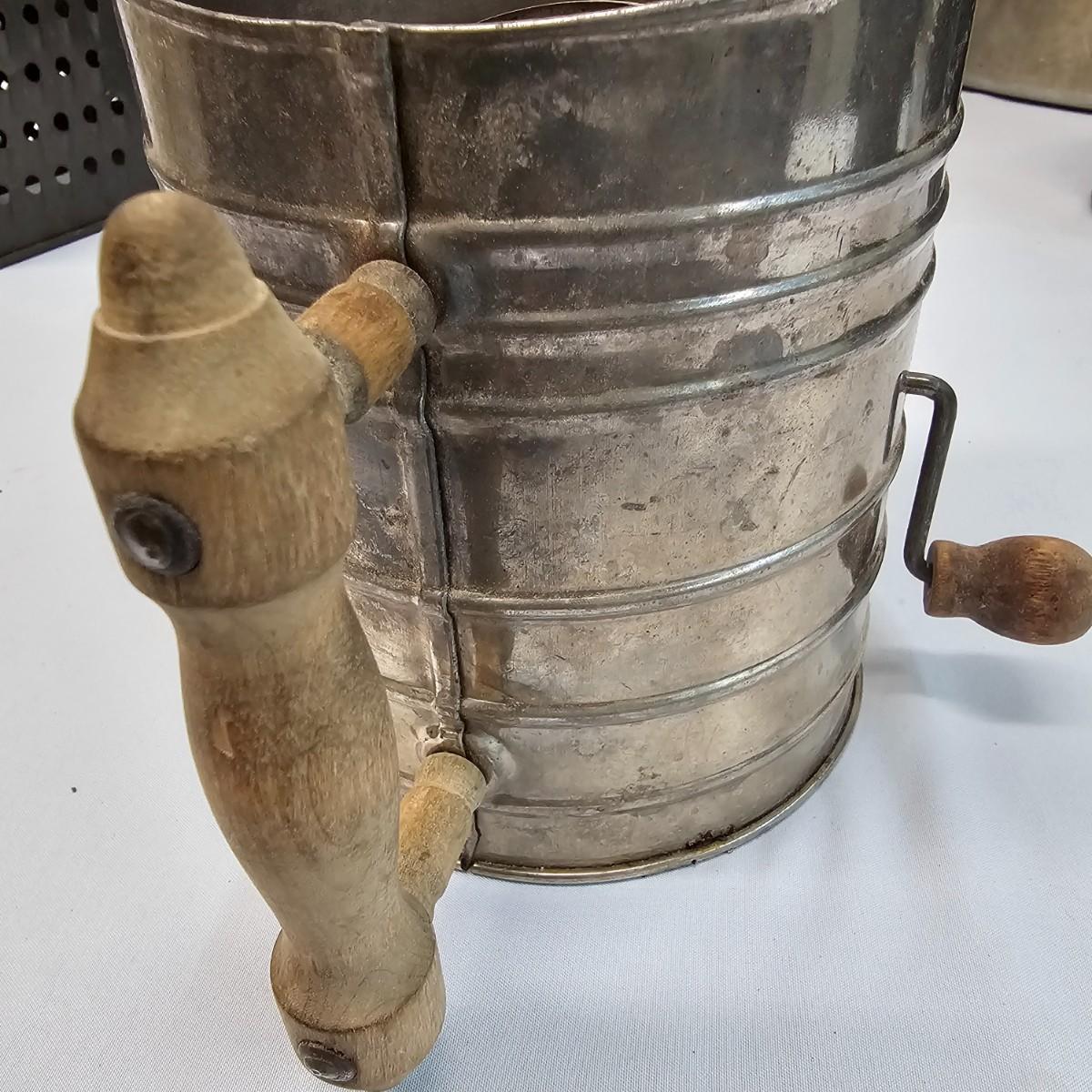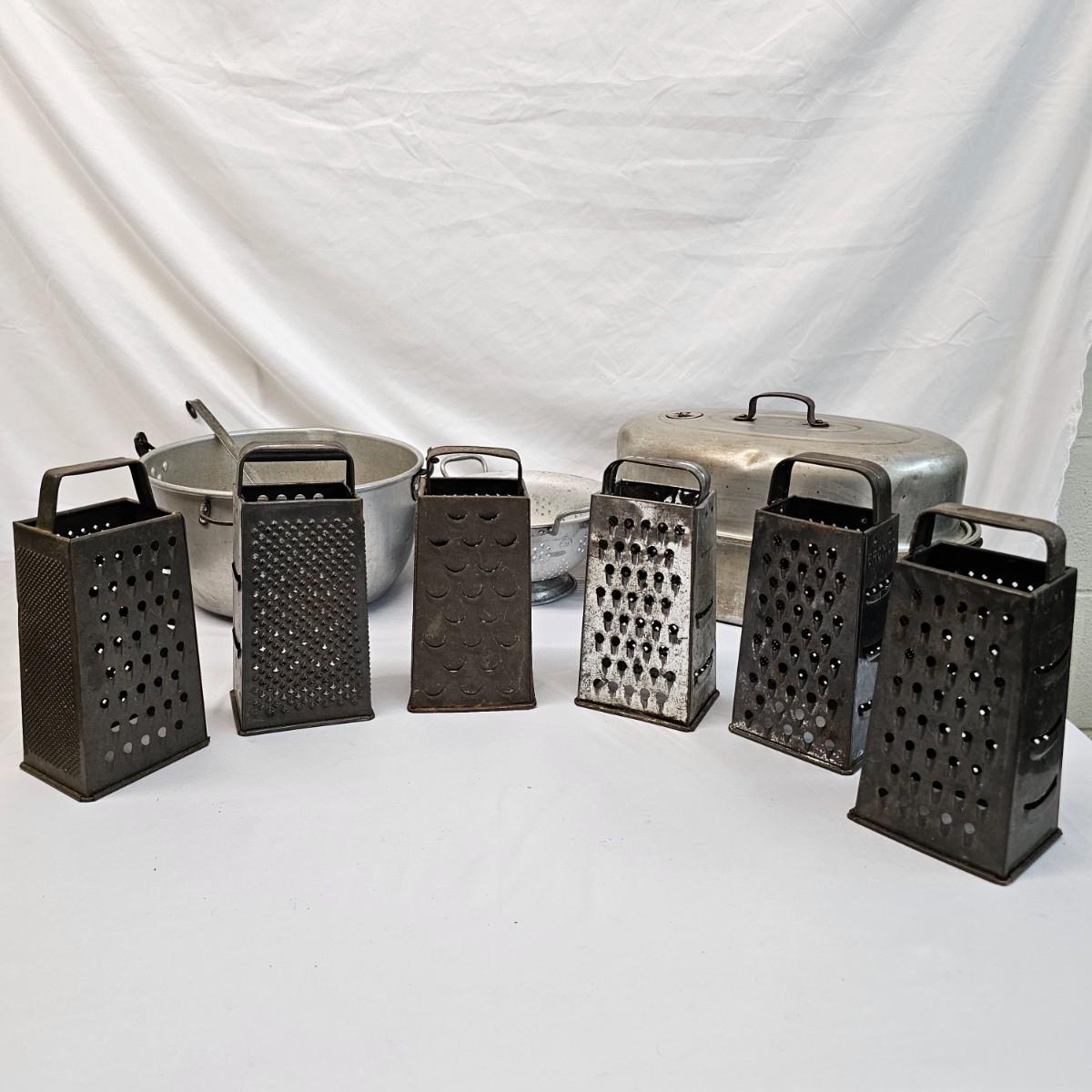 Roaster, collander, spoons, fork, graters and more make up this unique collection of kitchen Items. Rotary style sifter, swing bar ice cream scoop, pie tins and more. Roaster pan by Mirro, has lift out tray and measures 15.5" x 10" x 8.5"H. Large bowl with handle is 11.5"D x 6"H. Graters average 3.5" x 4.5" x 8.5"H. Mrs. Smith's pie tins are 9.5"D, and longest wooden spoon is 13". Items show signs of age and use. See photos for details. Shipping available.