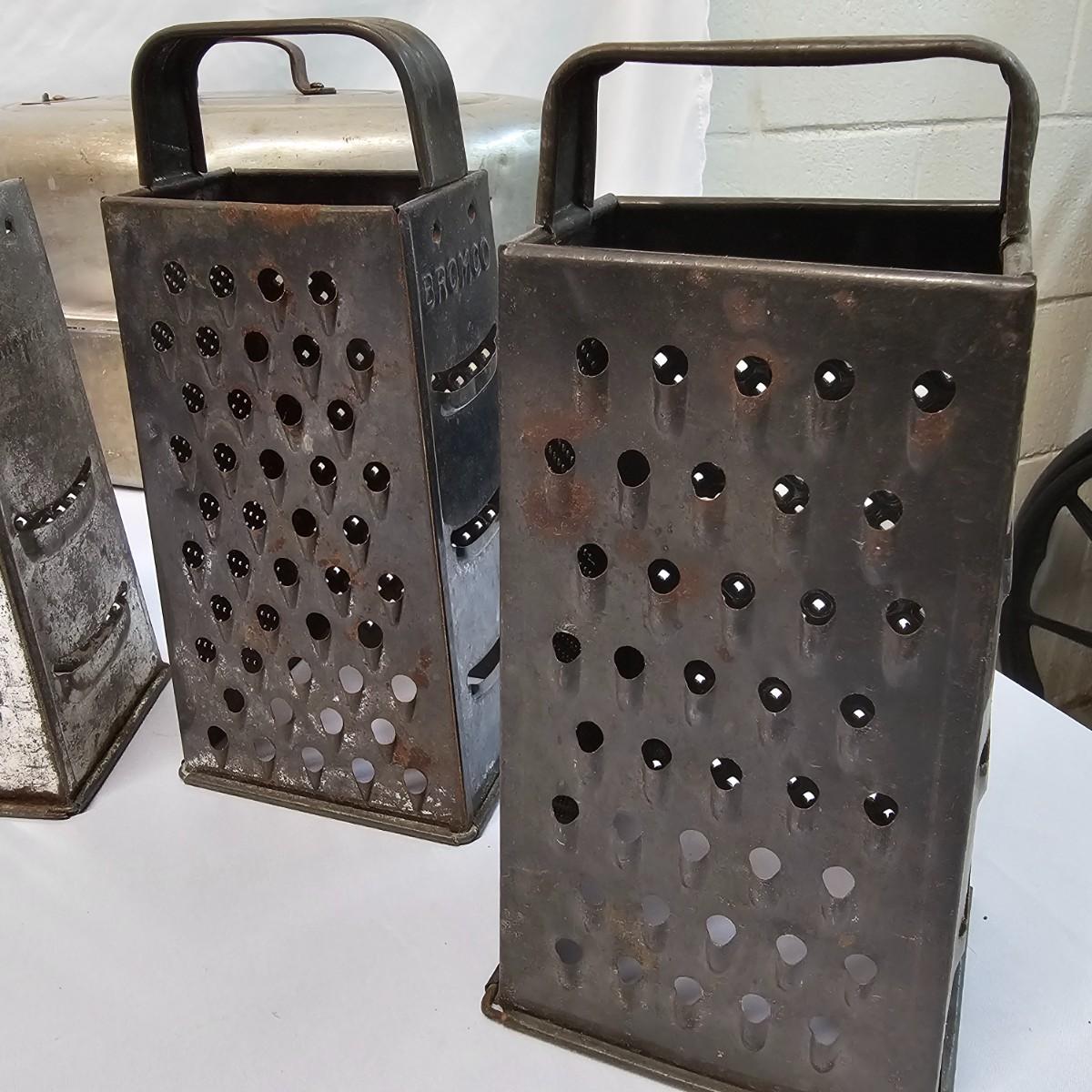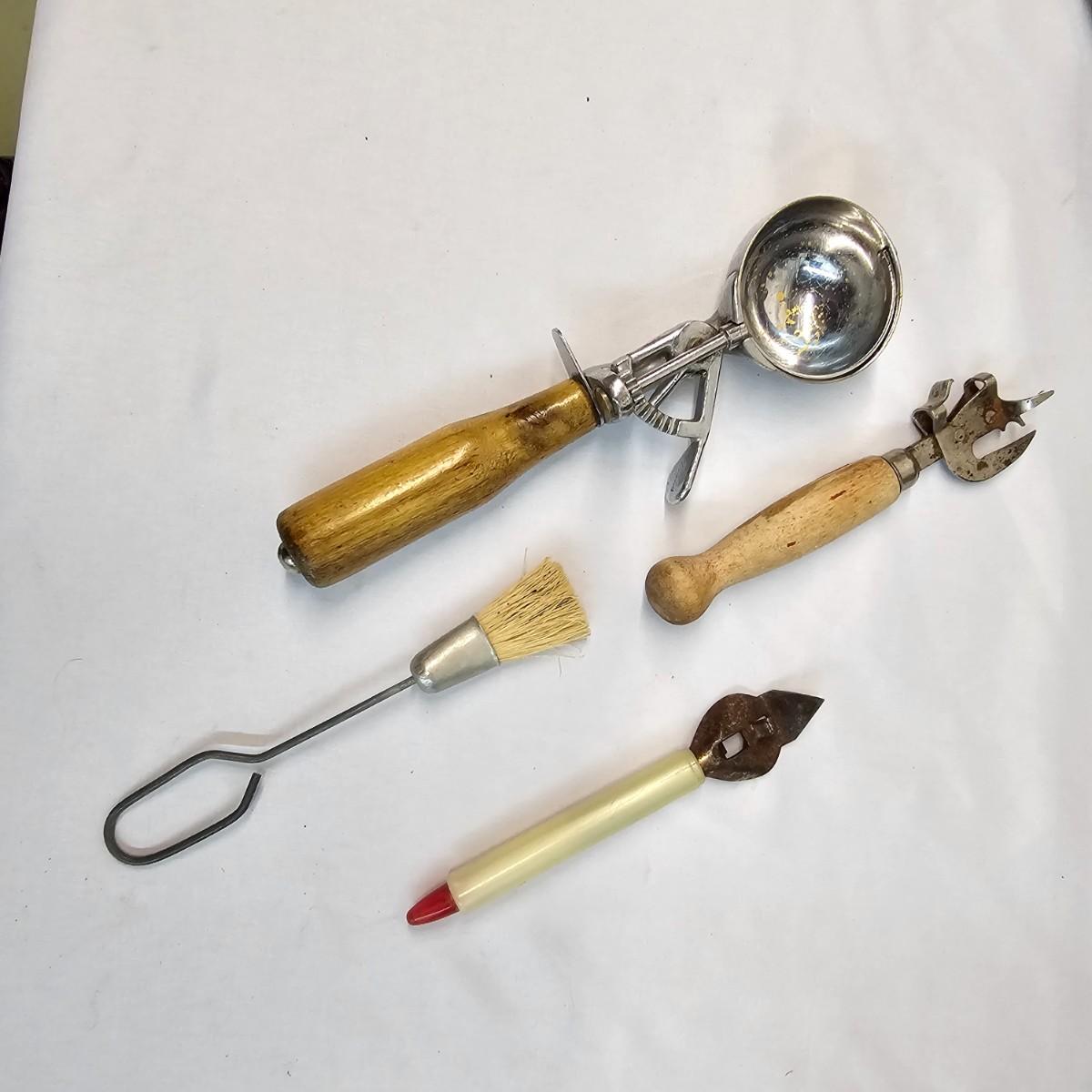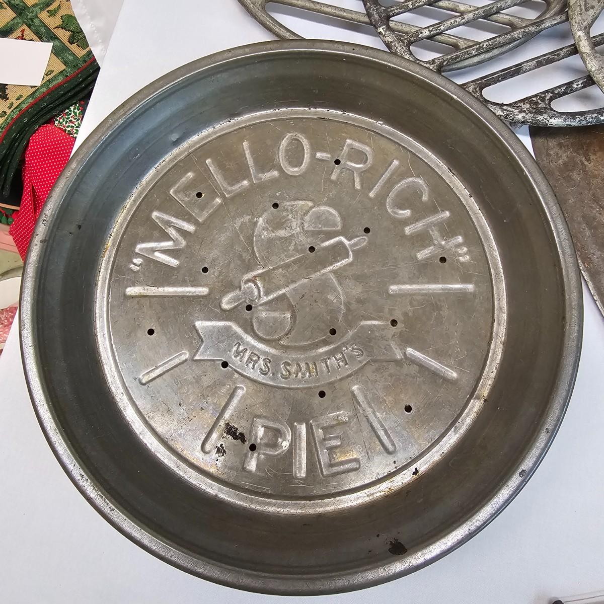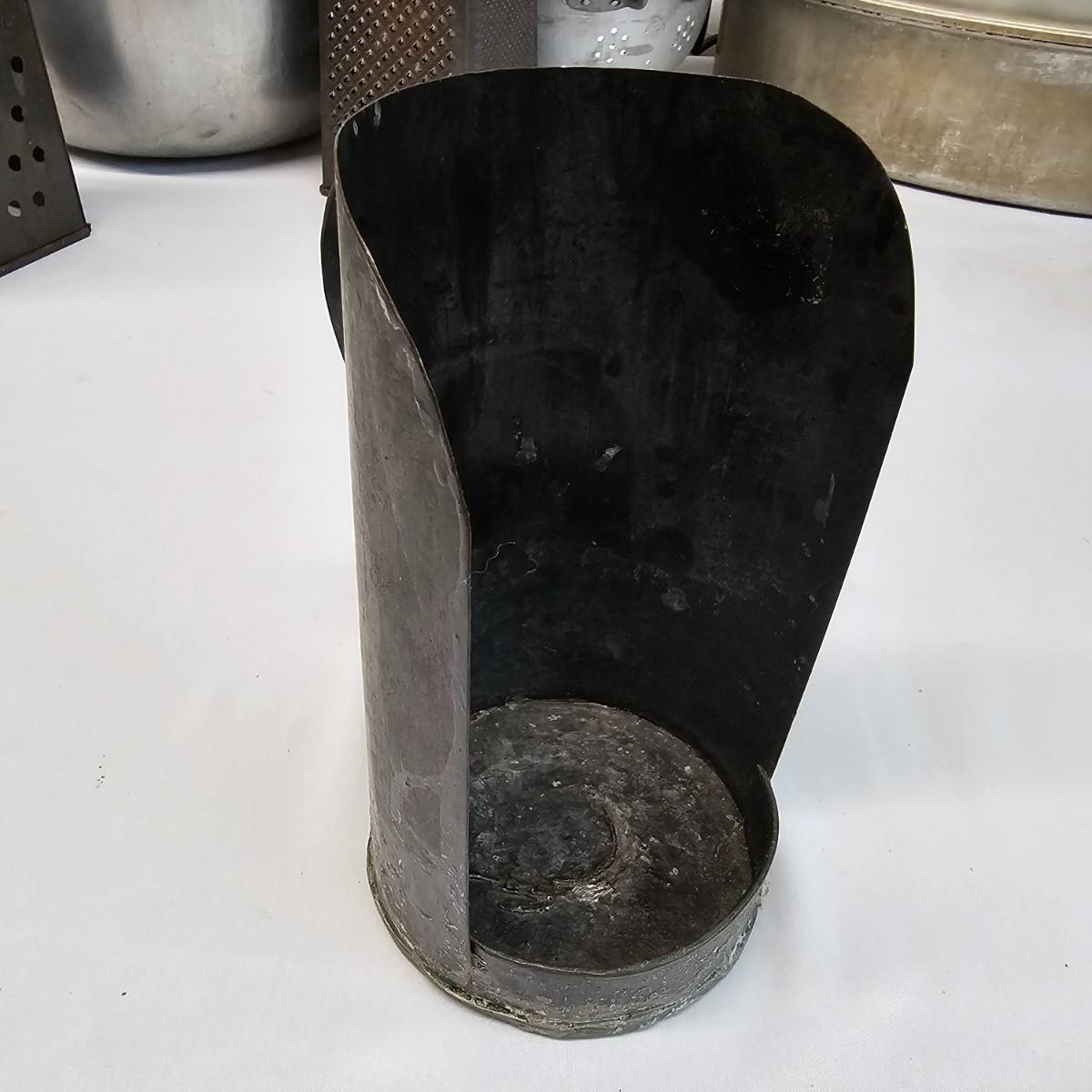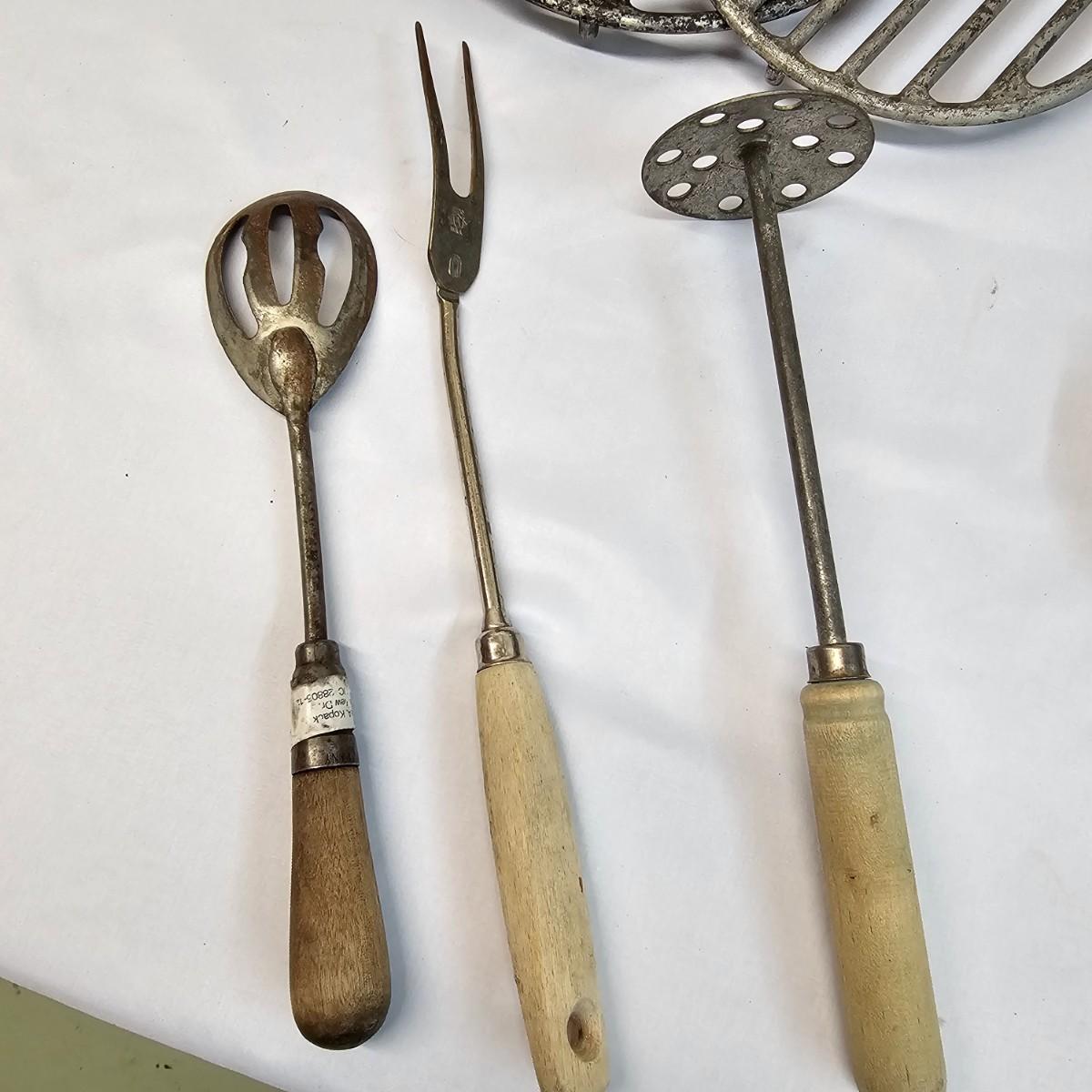 Roaster, collander, spoons, fork, graters and more make up this unique collection of kitchen Items. Rotary style sifter, swing bar ice cream scoop, pie tins and more. Roaster pan by Mirro, has lift out tray and measures 15.5" x 10" x 8.5"H. Large bowl with handle is 11.5"D x 6"H. Graters average 3.5" x 4.5" x 8.5"H. Mrs. Smith's pie tins are 9.5"D, and longest wooden spoon is 13". Items show signs of age and use. See photos for details. Shipping available.