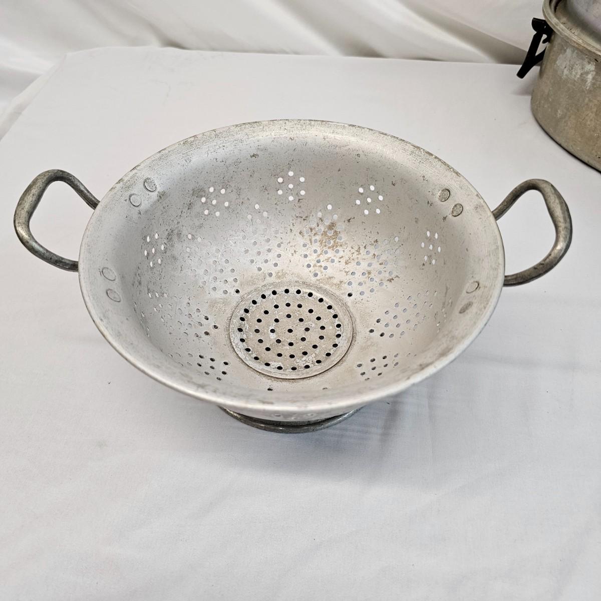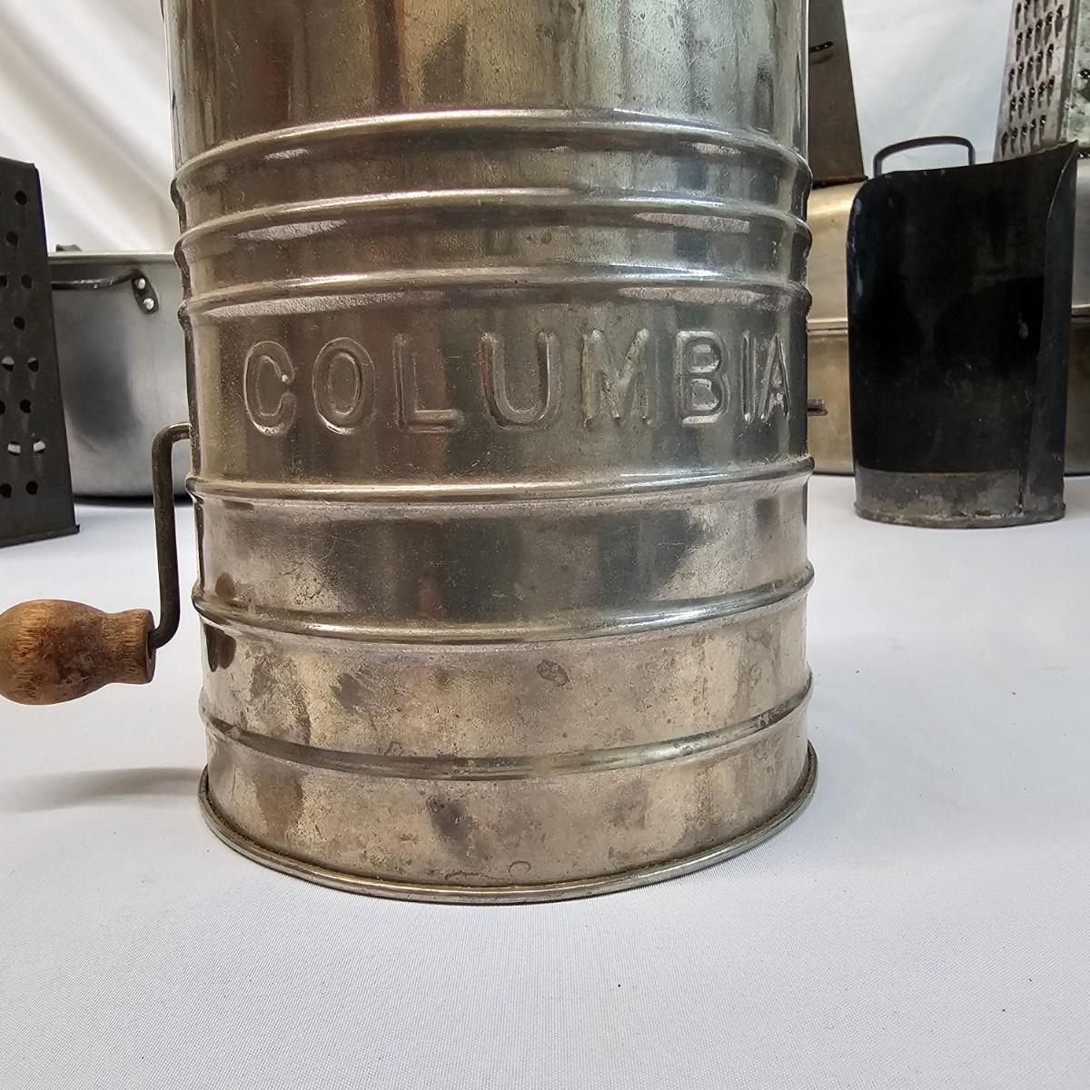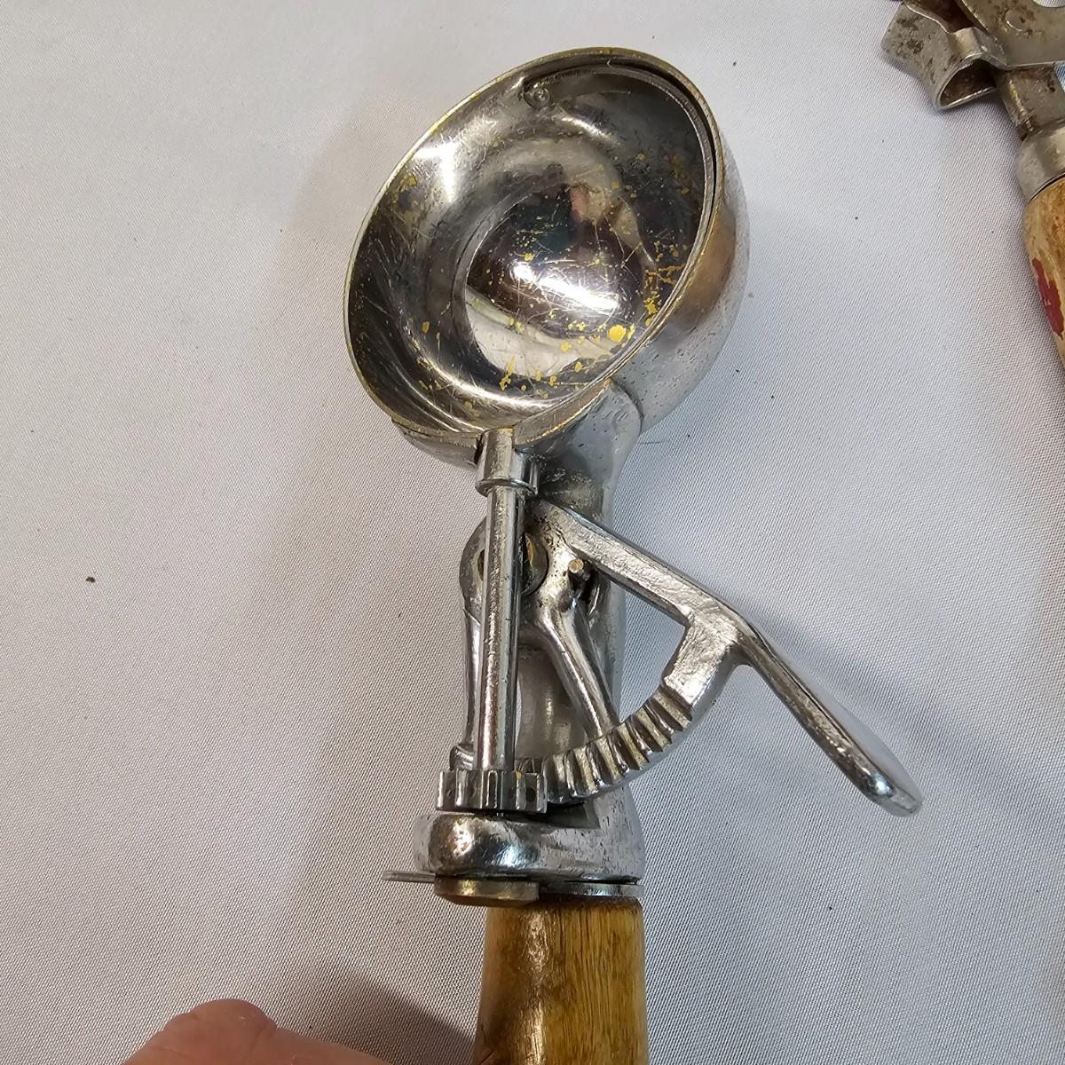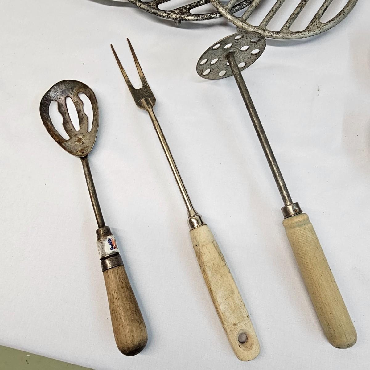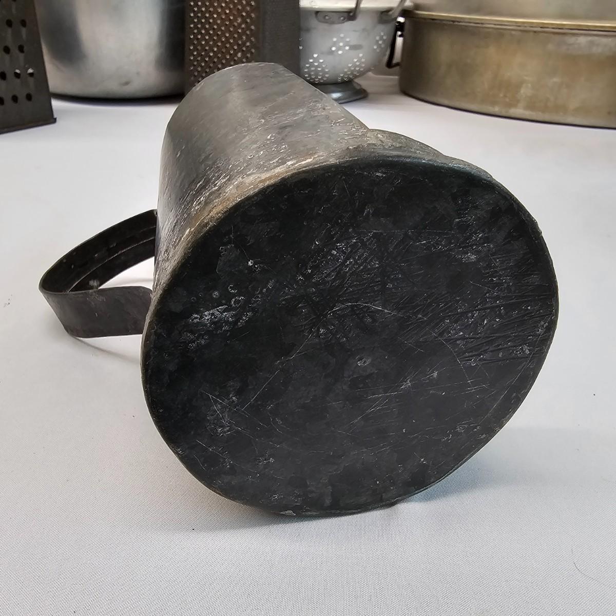 Roaster, collander, spoons, fork, graters and more make up this unique collection of kitchen Items. Rotary style sifter, swing bar ice cream scoop, pie tins and more. Roaster pan by Mirro, has lift out tray and measures 15.5" x 10" x 8.5"H. Large bowl with handle is 11.5"D x 6"H. Graters average 3.5" x 4.5" x 8.5"H. Mrs. Smith's pie tins are 9.5"D, and longest wooden spoon is 13". Items show signs of age and use. See photos for details. Shipping available.
