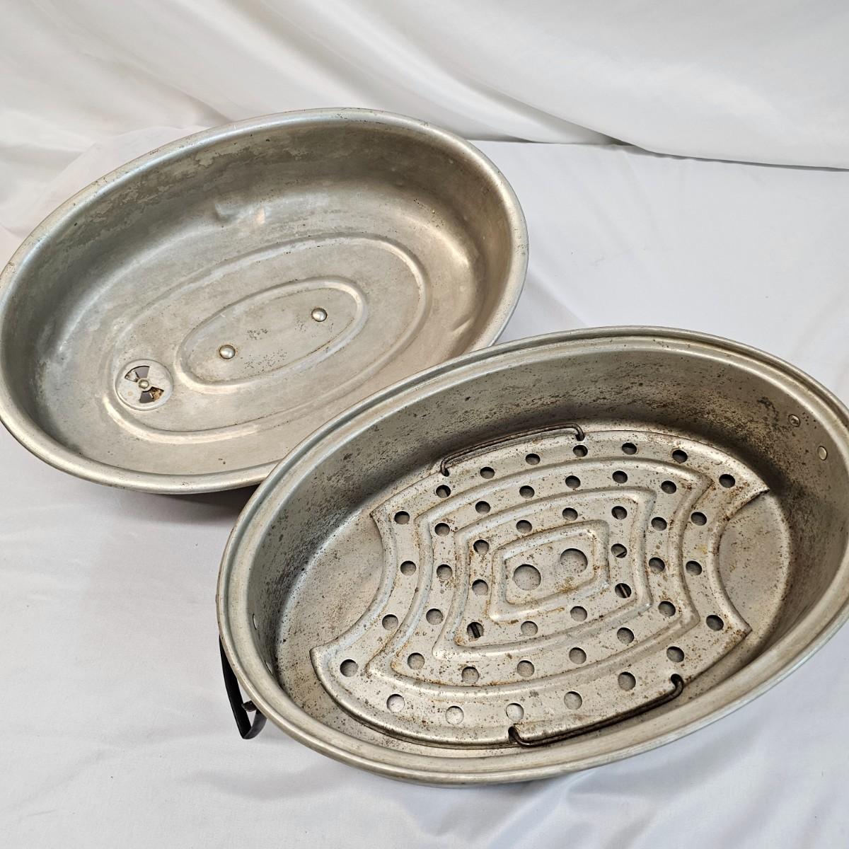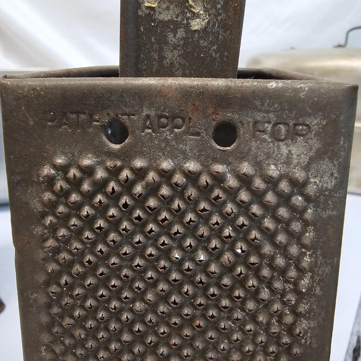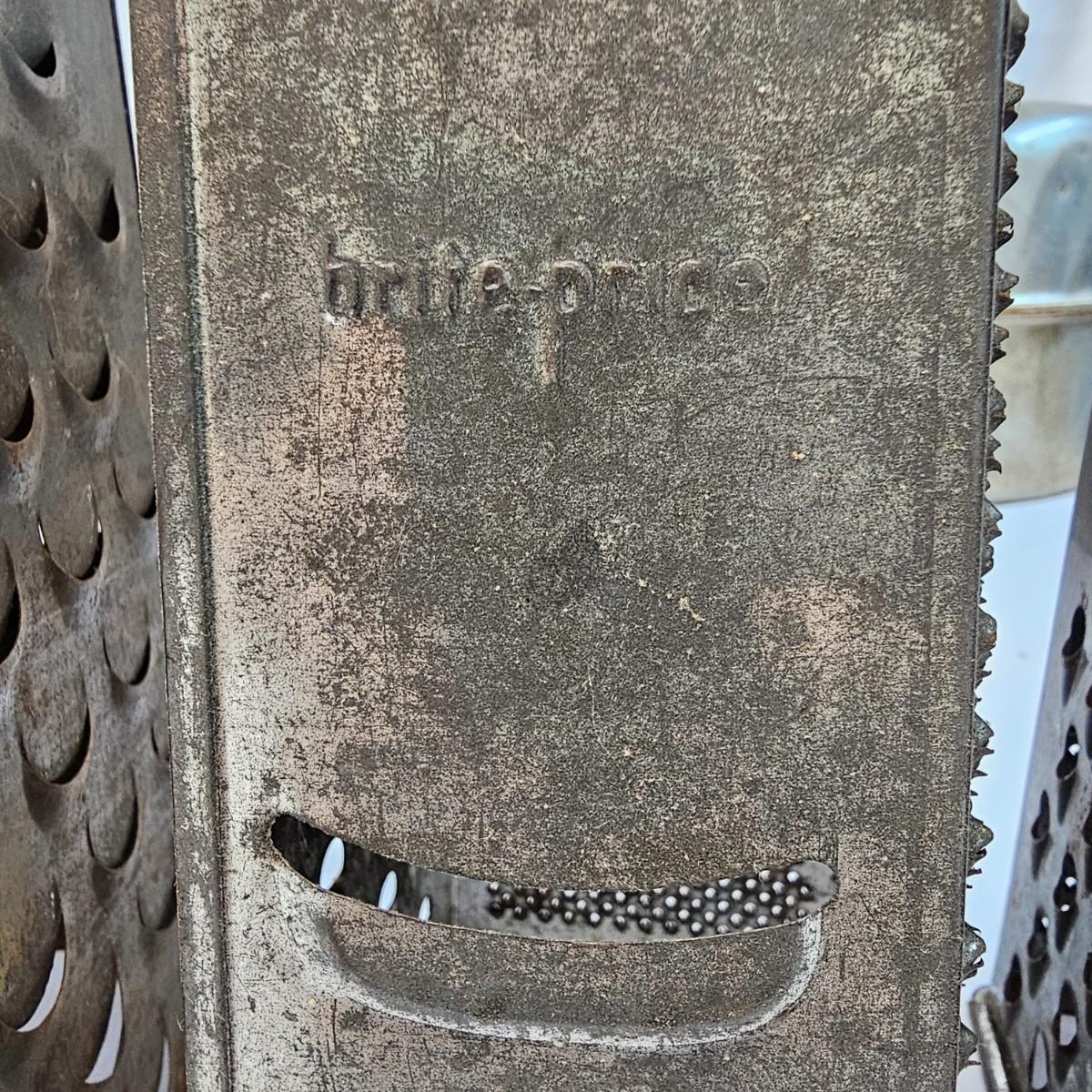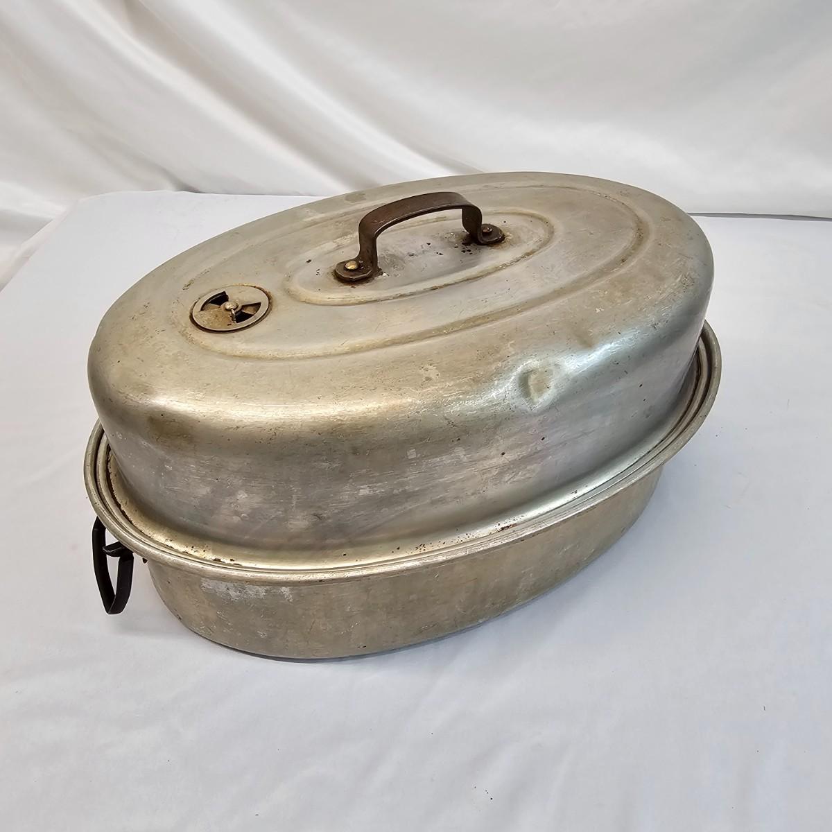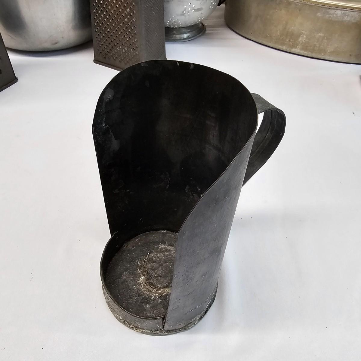 Roaster, collander, spoons, fork, graters and more make up this unique collection of kitchen Items. Rotary style sifter, swing bar ice cream scoop, pie tins and more. Roaster pan by Mirro, has lift out tray and measures 15.5" x 10" x 8.5"H. Large bowl with handle is 11.5"D x 6"H. Graters average 3.5" x 4.5" x 8.5"H. Mrs. Smith's pie tins are 9.5"D, and longest wooden spoon is 13". Items show signs of age and use. See photos for details. Shipping available.