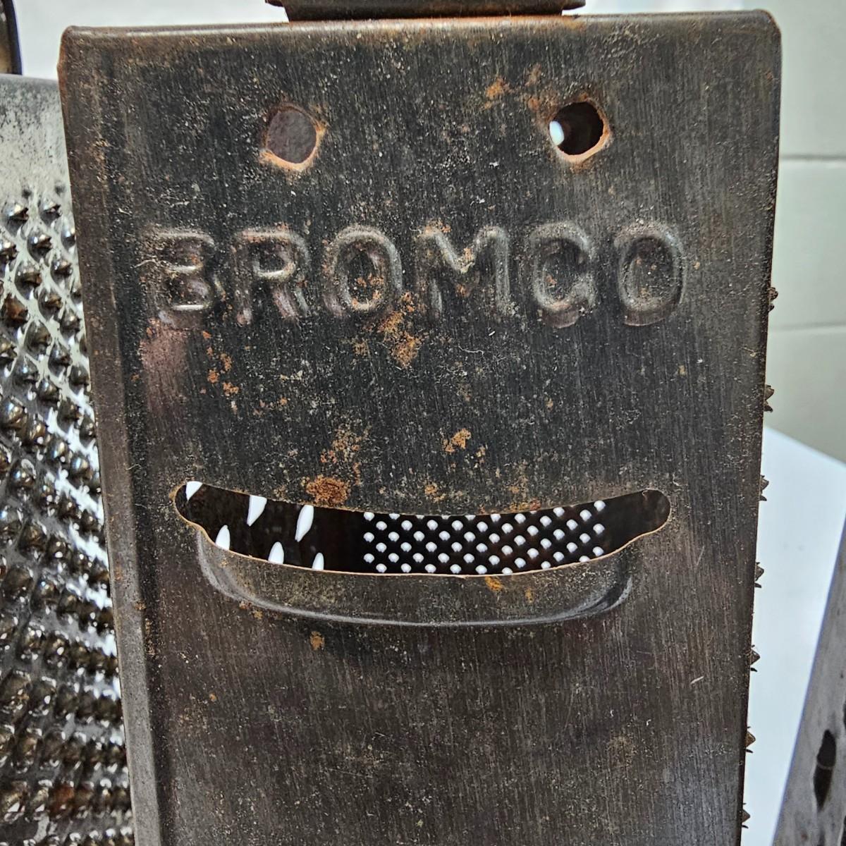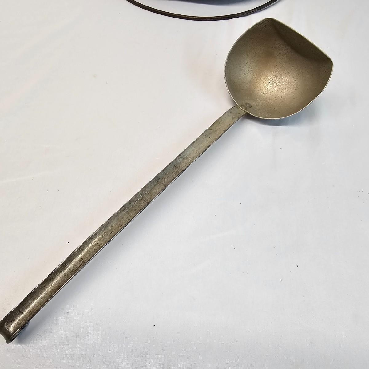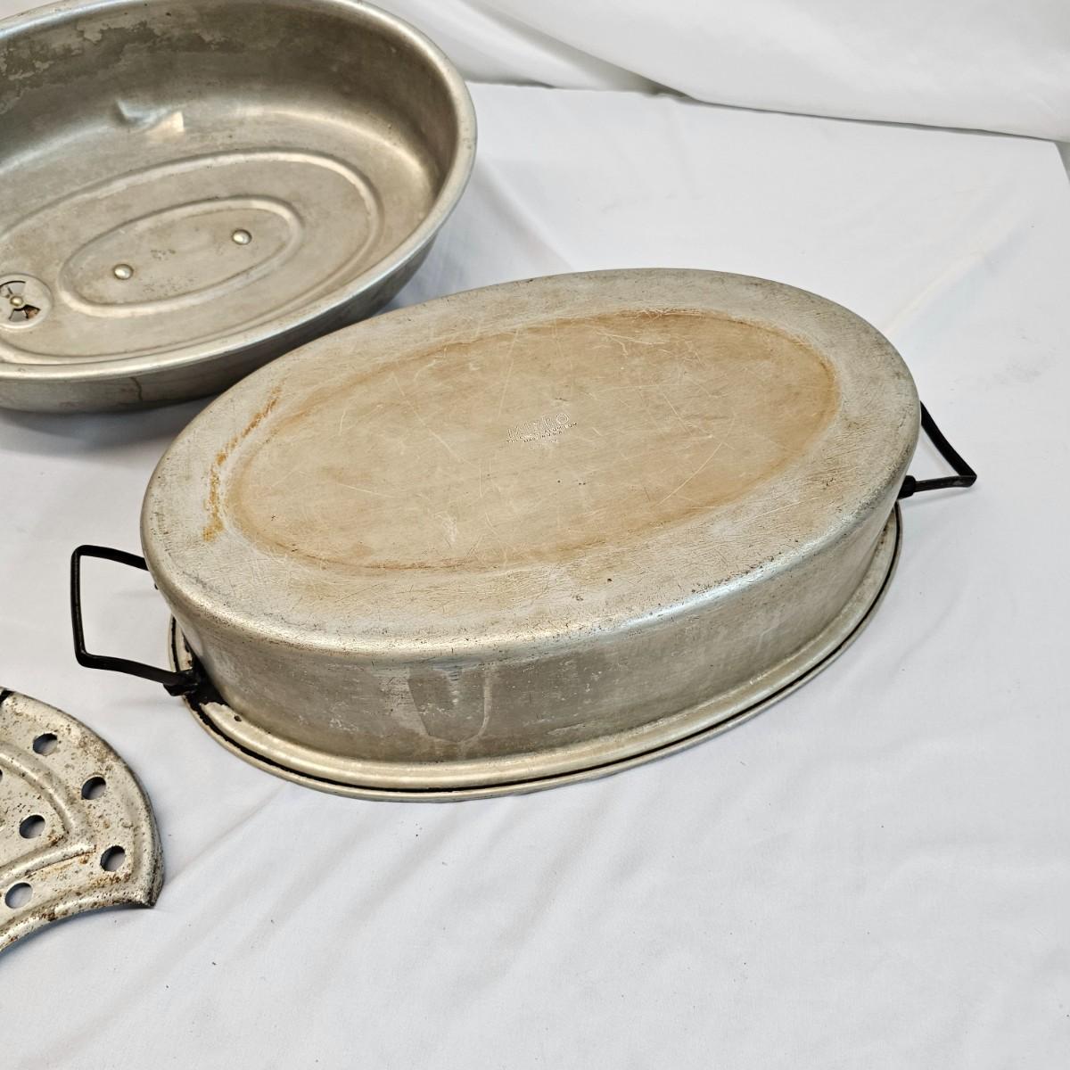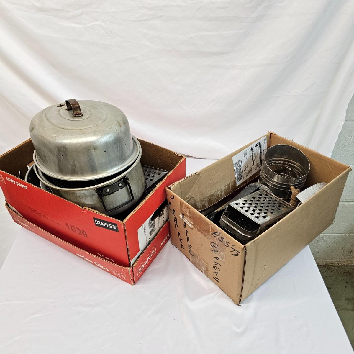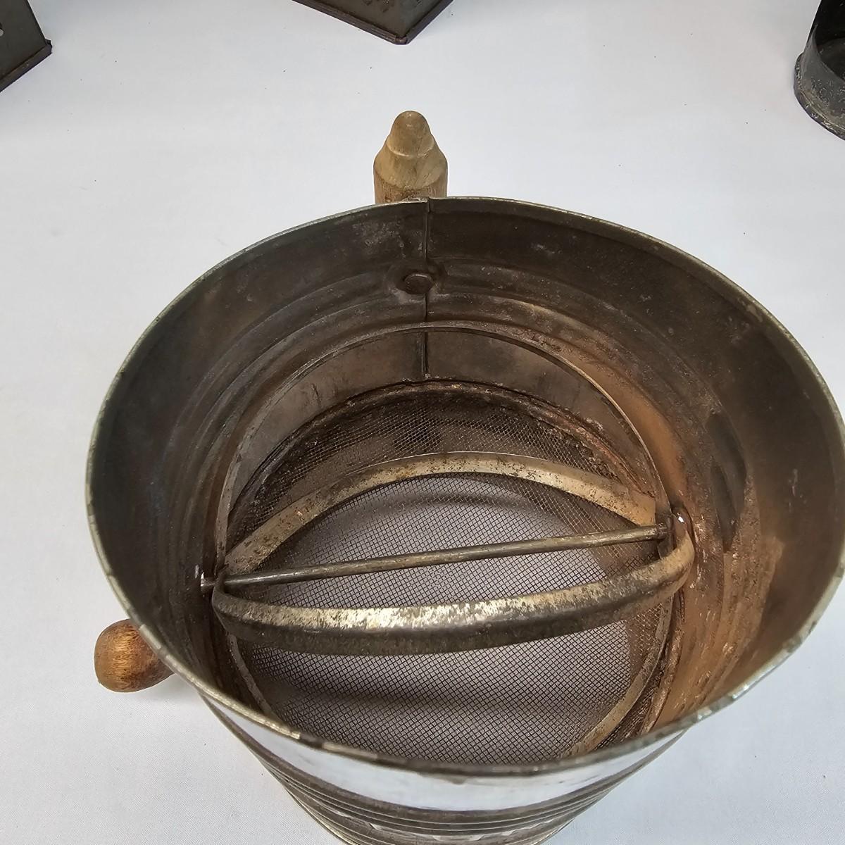 Roaster, collander, spoons, fork, graters and more make up this unique collection of kitchen Items. Rotary style sifter, swing bar ice cream scoop, pie tins and more. Roaster pan by Mirro, has lift out tray and measures 15.5" x 10" x 8.5"H. Large bowl with handle is 11.5"D x 6"H. Graters average 3.5" x 4.5" x 8.5"H. Mrs. Smith's pie tins are 9.5"D, and longest wooden spoon is 13". Items show signs of age and use. See photos for details. Shipping available.