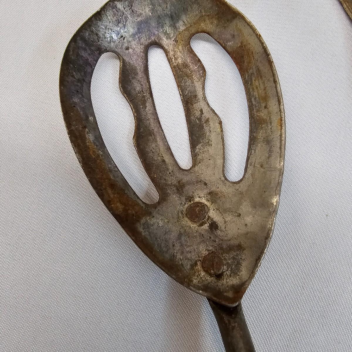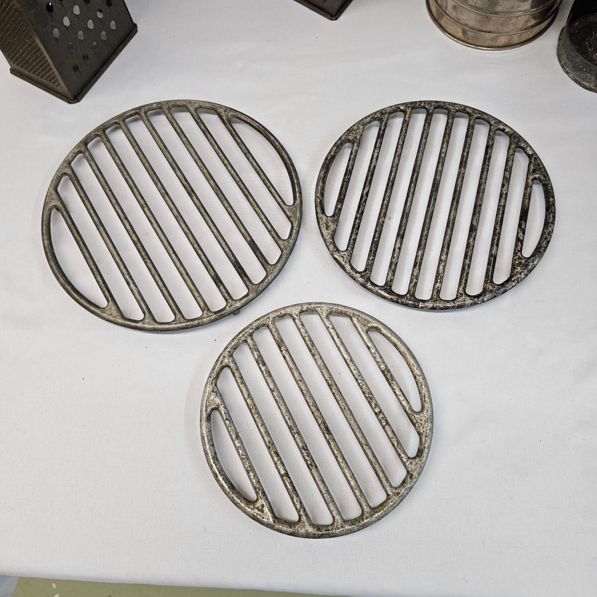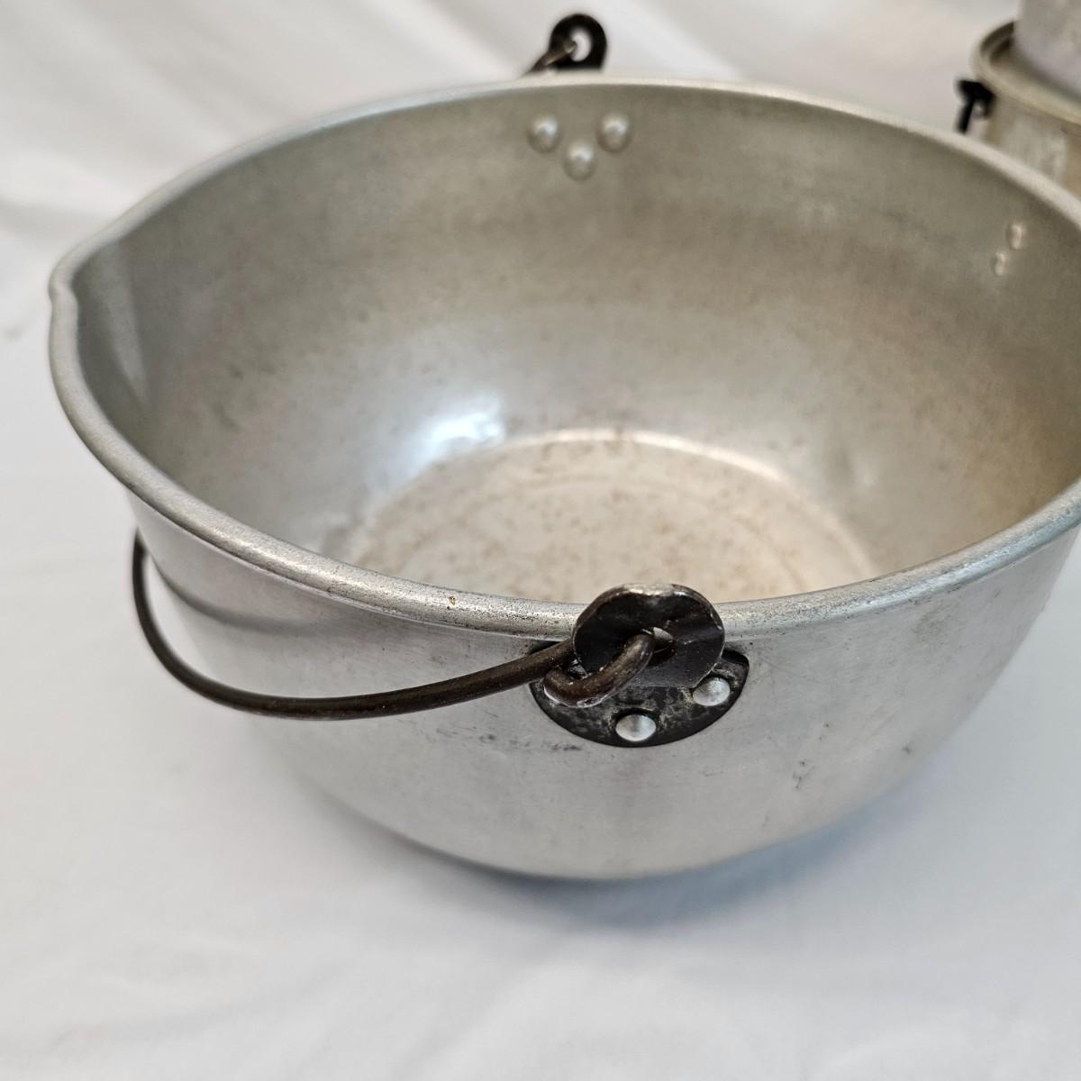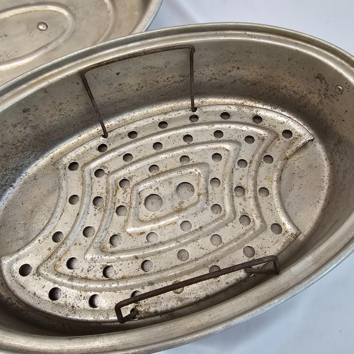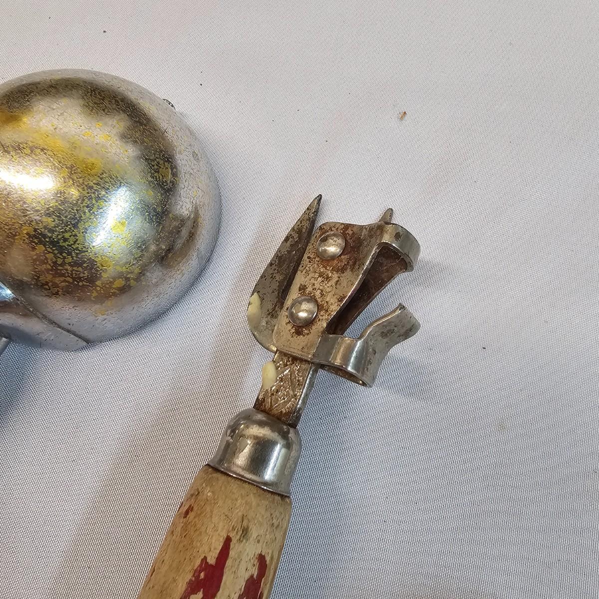 Roaster, collander, spoons, fork, graters and more make up this unique collection of kitchen Items. Rotary style sifter, swing bar ice cream scoop, pie tins and more. Roaster pan by Mirro, has lift out tray and measures 15.5" x 10" x 8.5"H. Large bowl with handle is 11.5"D x 6"H. Graters average 3.5" x 4.5" x 8.5"H. Mrs. Smith's pie tins are 9.5"D, and longest wooden spoon is 13". Items show signs of age and use. See photos for details. Shipping available.