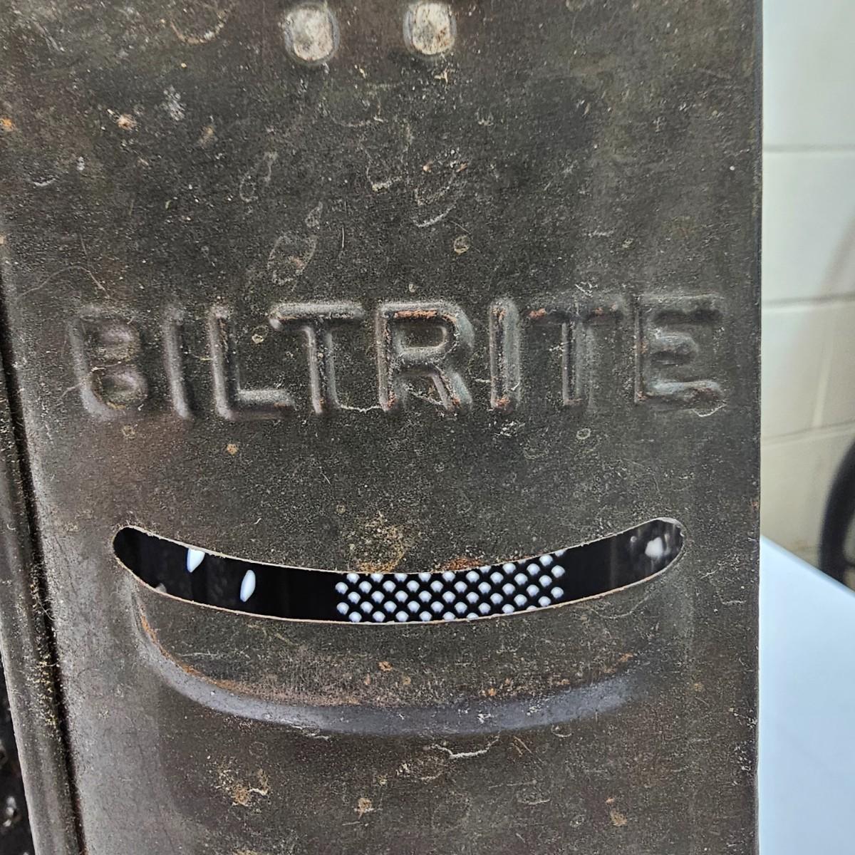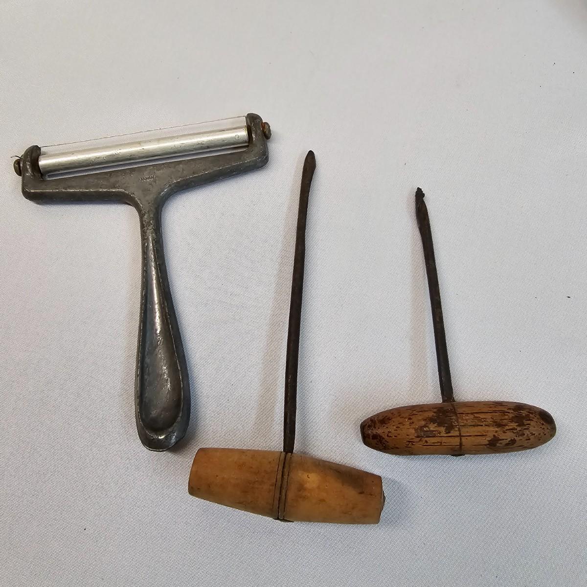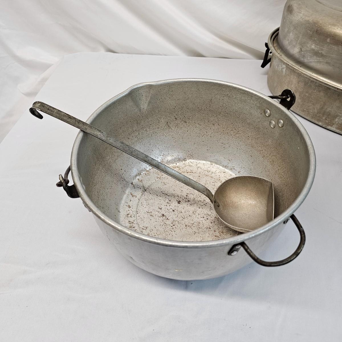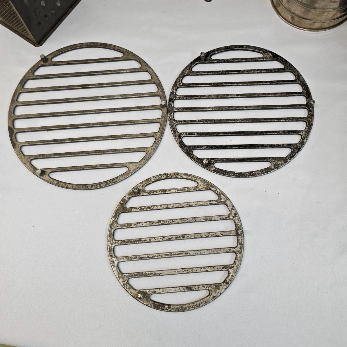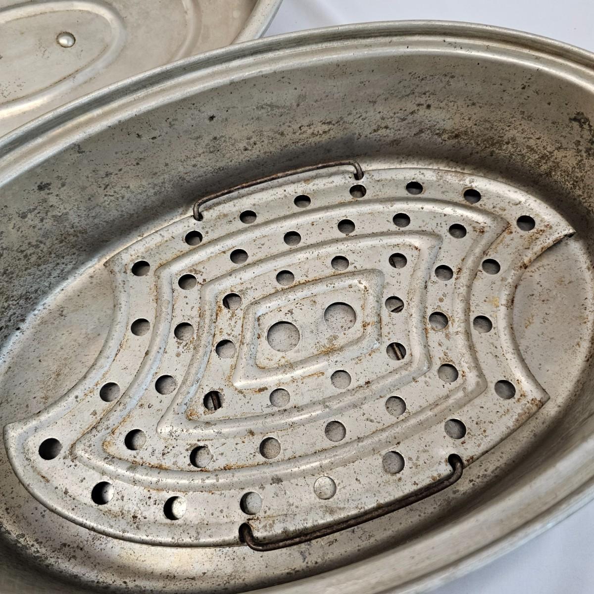 Roaster, collander, spoons, fork, graters and more make up this unique collection of kitchen Items. Rotary style sifter, swing bar ice cream scoop, pie tins and more. Roaster pan by Mirro, has lift out tray and measures 15.5" x 10" x 8.5"H. Large bowl with handle is 11.5"D x 6"H. Graters average 3.5" x 4.5" x 8.5"H. Mrs. Smith's pie tins are 9.5"D, and longest wooden spoon is 13". Items show signs of age and use. See photos for details. Shipping available.